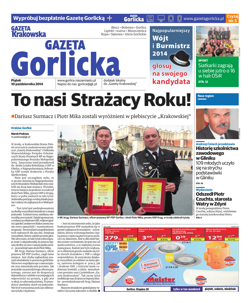 Najpopularniejszy Wójt i Burmistrz FOT. EKSTRIM Biecz • Bobowa • Gorlice Lipinki • Łużna • Moszczenica Ropa • Sękowa • Uście Gorlickie 2014 SPORT głosuj na swojego Piątek 10 października 2014 www.gorlice.naszemiasto.pl Napisz do nas: [email protected] dodatek lokalny Bezpłatny do „Gazety Krakowskiej” tygodnik lokalny Siatkarki zagrają u siebie jutro o 16 w hali OSiR kandydata STR. 12 To nasi Strażacy Roku! Nasz region ADariusz Surmacz i Piotr Mika zostali wyróżnieni w plebiscycie „Krakowskiej” FOT. ARCHIWUM Kraków–Gorlice Marek Podraza [email protected] Andrzej Ćmiech przedstawia Historię szkolnictwa zawodowego w Gliniku 109 młodych uczyło się na strychu podstawówki w Gliniku STR. 10 Wydarzenia FOT. MARTEK PODRAZA W środę, w krakowskim Domu Polonii uroczyście podsumowano plebiscyt „Gazety Krakowskiej” i Oddziału Wojewódzkiego Związku Ochotniczych Straży Pożarnych RP na Najpopularniejszego Strażaka Małopolski 2014. Zaszczytny tytuł powędrował do druha Leszka Kołodzieja z OSP w Obidzy, a Najpopularniejszą Jednostką OSP zostali druhowie z Poręby Spytkowskiej. Nam jest szczególnie miło, że w gronie dziesięciu Najpopularniejszych Strażaków Małopolski 2014 znaleźli się dwaj nasi strażacy. Wysokie, trzecie miejsce na podium wywalczył druh Piotr Mika, prezes OSP w Krygu, który w pełni zasłużył na taki tytuł. Jednostka pod jego wodzą działa prężnie i należy do najlepszych w Małopolsce. – Ten tytuł jest podziękowaniem zasłużbęwszystkimstrażakomzmojej jednostki. Tydzień temu mieliśmy niezwykłąuroczystość.Dziękisponsorom, azwłaszczawładzomOSP,wójtowigminyLipinkiCzesławowiRakoczemumamy nowy samochód i wyremontowanegaraże.Tentytułjestuzupełnieniem tych radosnych dla nas dni. Dziękuję wszystkim, którzy oddali na mnie głos. Nie ukrywam, że taki tytuł zobowiązuje mnie i całą jednostkę do jeszcze lepszej służby na rzecz naszej społeczności – powiedział nam druh Piotr Mika. Mł. bryg. Dariusz Surmacz, oficer prasowy KP PSP Gorlice, zajął ósme miejsce. Jest chyba najbardziej znanym strażakiem w powiecie gorlickim. Wzorowo współpracuje z samorządami oraz mieszkańcami powiatu. Jak przystało na prawdziwego oficera prasowego, zawsze jest do dyspozycji dziennikarzy i udziela wyczerpujących odpowiedzi na pytania, a gdy jest w akcji, to odzwania później. To prawdziwy medialny skarb tej jednostki. Nie krył wzruszenia podczas odbierania tytułu i dyplomu. bMł. bryg. Dariusz Surmacz, oficer prasowy KP PSP Gorlice, i druh Piotr Mika, prezes OSP Kryg, w środę odebrali tytuły – Jest mi niezmiernie miło, że jako funkcjonariusz PSP znalazłem się w gronie najlepszych strażaków – ochotników, którzy wykonują bardzo ciężką pracę i często są pierwsi przy pożarze czy zdarzeniu. Jest to dla mnie bardzo cenne wyróżnienie, bo jest ono od społeczeństwa, a to najlepiej ocenia naszą pracę. Radość jest tym większa, że w elitarnym gronie znalazło się tylko dwóch strażaków z PSP z całego województwa. Ze swej strony dziękuję wszystkim za oddane na mnie głosy, zarówno kolegom w pracy, jak i druhom OSP, z którymi mam codzienny kontakt, a także mieszkańcom powiatu oraz Czytelnikom „Gazety Krakowskiej”. Tak zacny tytuł mobilizuje nas do jeszcze lepszej służby – powiedział nam mł. bryg. Dariusz Surmacz. Naszym strażakom gratulujemy tytułów iżyczymy sukcesów w służbie. a REKLAMA Odszedł Piotr Czuchta, starosta Watry w Zdyni W środę pożegnaliśmy Piotra Czuchtę, sołtysa Zdyni, wieloletniego starostę Łemkowskiej Watry. STR. 4 044427279 02//tygodnik Piórem redaktora Gazeta Gorlicka Piątek, 10 października 2014 ROZMAITOŚCI Zdjęcie tygodnia Ważne telefony Alarmowe 999 W razie choroby a Gorliceszpital 183553200 a Pogotowie 112 a Przychodnieniepubliczne: Medicus, ul. Słoneczna 11, 18 352 52 03 , Ars-Medica, ul. Jagiełły 10, 18 353 65 97, Umammed, ul. Słoneczna 11, 18 354 69 00, EchoMed, ul. Biecka 11, 18 353 55 88, Glimed, ul. Szopena 5, 18 353 53 64, Bas-Med, ul. Armii Krajowej 2, 18 352 73 90, NZOZ Lekarz rodzinny, ul. Broniewskiego 9, 18 352 74 33, NZOZ, RTG, USG, ul. Piekarska 1, 18 352 20 03, NZOZ Balmed, ul. Jagiełły 10, 18 353 87 81, Lege Artis, Przedmieście, Biecz, 13 447 00 44 a Apteka całodobowa wGorlicach: Pod Różą, ul. Węgierska 21, 18 352 64 63 a Ośrodki Zdrowia wgminach: Biecz 13 447 10 10, Bobowa 18 351 40 12, Łużna 18 354 30 44, Lipinki 13 447 70 19, Moszczenica 18 354 10 05, Ropa 18 353 41 16, Sękowa 18 351 80 93 Policja a Komenda Powiatowa Policji 18 354 82 01, Biecz 13 447 10 07, Bobowa 18 351 40 07, Lipinki 13 447 70 07, Łużna 18 354 30 07, Uście Gorlickie 18 351 60 07 Straż pożarna a Stworzona w 1990 roku przez Stanisława Elmera STAŁY DODATEK DO „GAZETY KRAKOWSKIEJ" REDAKCJA: 38-300 Gorlice, ul. 3 Maja 10, tel. 18 354 05 31, 18 354 05 32, faks 18 353 04 91, e-mail: [email protected] REDAKTOR ODPOWIEDZIALNY: Agnieszka Nigbor-Chmura REDAGUJE ZESPÓŁ: Barbara Ćmiech, Halina Gajda, Marek Podraza. BIURO REKLAMY: Dorota Kosiba, 38-300 Gorlice, ul. 3 Maja 10, I p. tel./faks 18 353 04 91. „Gazeta Krakowska" w internecie pod adresem: www.naszemiasto.pl REDAKTOR NACZELNY: Wojciech Harpula, tel. 12 688 81 01, [email protected] WYDAWCA TYGODNIKÓW REGIONALNYCH: Tomasz Żyłko, tel. 12 688 82 07, [email protected] PROJEKTGRAFICZNY: Tomasz Bocheński WYDAWCA: Polskapresse Sp. z o.o., 02-672 Warszawa, ul. Domaniewska 45, Oddział Prasa Krakowska, 31-548 Kraków, al. Pokoju 3 PREZES: Małgorzata Cetera-Bulka DRUK: Polskapresse sp. z o.o. Oddział Poligrafia, Drukarnia Sosnowiec, ul. Baczyńskiego 25a, 41-203 Sosnowiec Milowice a Państwowa Straż Pożarna w Gorlicach 18 354 93 10, Biecz 13 447 10 08, Bobowa 18 351 40 43, Łużna 18 354 30 07, Uście Gorlickie 18 351 60 07 Urzędy a Starostwo Powiatowe w Gorlicach 18 353 53 80, Urząd Miasta Gorlice 18 353 62 00, Urząd Gminy Gorlice 18 353 57 62, Urzą