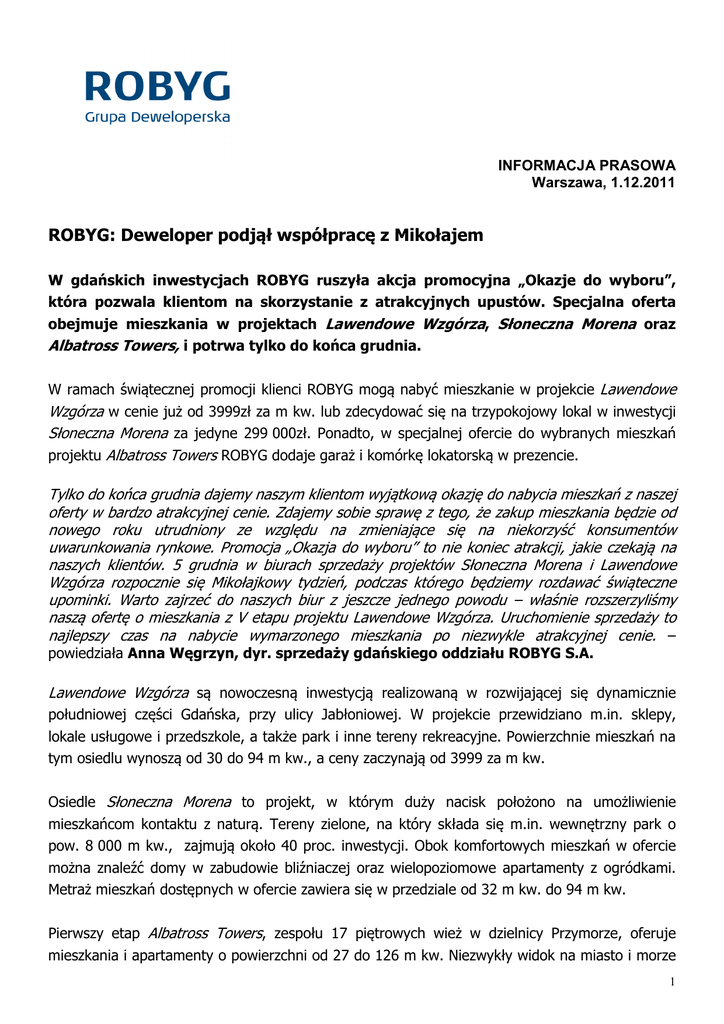 INFORMACJA PRASOWA Warszawa, 1.12.2011 ROBYG: Deweloper podjął współpracę z Mikołajem W gdańskich inwestycjach ROBYG ruszyła akcja promocyjna „Okazje do wyboru”, która pozwala klientom na skorzystanie z atrakcyjnych upustów. Specjalna oferta obejmuje mieszkania w projektach Lawendowe Wzgórza, Słoneczna Morena oraz Albatross Towers, i potrwa tylko do końca grudnia. W ramach świątecznej promocji klienci ROBYG mogą nabyć mieszkanie w projekcie Lawendowe Wzgórza w cenie już od 3999zł za m kw. lub zdecydować się na trzypokojowy lokal w inwestycji Słoneczna Morena za jedyne 299 000zł. Ponadto, w specjalnej ofercie do wybranych mieszkań projektu Albatross Towers ROBYG dodaje garaż i komórkę lokatorską w prezencie. Tylko do końca grudnia dajemy naszym klientom wyjątkową okazję do nabycia mieszkań z naszej oferty w bardzo atrakcyjnej cenie. Zdajemy sobie sprawę z tego, że zakup mieszkania będzie od nowego roku utrudniony ze względu na zmieniające się na niekorzyść konsumentów uwarunkowania rynkowe. Promocja „Okazja do wyboru” to nie koniec atrakcji, jakie czekają na naszych klientów. 5 grudnia w biurach sprzedaży projektów Słoneczna Morena i Lawendowe Wzgórza rozpocznie się Mikołajkowy tydzień, podczas którego będziemy rozdawać świąteczne upominki. Warto zajrzeć do naszych biur z jeszcze jednego powodu – właśnie rozszerzyliśmy naszą ofertę o mieszkania z V etapu projektu Lawendowe Wzgórza. Uruchomienie sprzedaży to najlepszy czas na nabycie wymarzonego mieszkania po niezwykle atrakcyjnej cenie. – powiedziała Anna Węgrzyn, dyr. sprzedaży gdańskiego oddziału ROBYG S.A. Lawendowe Wzgórza są nowoczesną inwestycją realizowaną w rozwijającej się dynamicznie południowej części Gdańska, przy ulicy Jabłoniowej. W projekcie przewidziano m.in. sklepy, lokale usługowe i przedszkole, a także park i inne tereny rekreacyjne. Powierzchnie mieszkań na tym osiedlu wynoszą od 30 do 94 m kw., a ceny zaczynają od 3999 za m kw. Osiedle Słoneczna Morena to projekt, w którym duży nacisk położono na umożliwienie mieszkańcom kontaktu z naturą. Tereny zielone, na który składa się m.in. wewnętrzny park o pow. 8 000 m kw., zajmują około 40 proc. inwestycji. Obok komfortowych mieszkań w ofercie można znaleźć domy w zabudowie bliźniaczej oraz wielopoziomowe apartamenty z ogródkami. Metraż mieszkań dostępnych w ofercie zawiera się w przedziale od 32 m kw. do 94 m kw. Pierwszy etap Albatross Towers, zespołu 17 piętrowych wież w dzielnicy Przymorze, oferuje mieszkania i apartamenty o powierzchni od 27 do 126 m kw. Niezwykły widok na miasto i morze 1 oraz wysoka jakość wykonania łącząca w sobie nowoczesny projekt oraz szlachetne materiały to nie jedyne atuty inwestycji. Dla komfortu mieszkańców w budynku zostaną zamontowane logotermy, czyli systemy umożliwiające samodzielne zarządzanie zużyciem energii w każdym lokalu, a w podziemiach powstanie dwupoziomowy garaż. ROBYG SA konsekwentnie umacnia swoją pozycję na rynku warszawskim i trójmiejskim. W tym roku planuje sprzedaż 1000 mieszkań. Po 9 miesiącach br. Spóła zrealizowała plan w 78,3% sprzedając 783 mieszkania. W ostatnich trzech miesiącach roku ROBYG spodziewa się powtórzyć osiągnięcie trzeciego kwartału, kiedy podpisał 249 przedwstępnych umów sprzedaży. Dodatkowe informacje: Joanna Taraszkiewicz Value Communication tel. 501 409 102 tel. (22) 244 57 06 e-mail: [email protected] *** Grupa deweloperska ROBYG specjalizuje się w realizacji projektów mieszkaniowych. Grupa deweloperska ROBYG składa się ze spółki holdingowej ROBYG S.A., spółki zarządzającej ROBYG Zarządzanie, spółki prowadzącej działania marketingowe ROBYG Marketing i Sprzedaż oraz ze spółek celowych, które realizują poszczególne projekty deweloperskie Grupy. *** Niniejszy komunikat nie stanowi oferty sprzedaży papierów wartościowych w Stanach Zjednoczonych Ameryki. Papiery wartościowe nie mogą być oferowane ani sprzedawane na terytorium Stanów Zjednoczonych Ameryki bez uprzedniej rejestracji lub zwolnienia od wymogu rejestracji. ROBYG S.A. („Spółka”) nie zamierza rejestrować żadnej części oferty papierów wartościowych Spółki w Stanach Zjednoczonych Ameryki. Niniejszy komunikat ani żadna jego kopia nie może być przekazana lub w jakikolwiek sposób przesłana lub udostępniona na terytorium Stanów Zjednoczonych Ameryki. Rozpowszechnianie tych materiałów w niektórych państwach może być zabronione. Niedozwolona jest dystrybucja niniejszego dokumentu na terytorium Kanady, Japonii lub Australii. Informacje zawarte w załączonych materiałach nie stanowią oferty sprzedaży ani zaproszenia do złożenia oferty nabycia papierów wartościowych Spółki w Kanadzie, Japonii lub Australii. Niniejszy komunikat jest dokumentem wyłącznie promocyjnym w rozumieniu art. 53 ustawy z dnia 29 lipca 2005 r. o ofercie publicznej i warunkach wprowadzenia instrumentów finansowych do zorganizowanego systemu obrotu oraz o spółkach publicznych. Niniejszy komunikat nie stanowi prospektu emisyjnego. Każdy inwestor powinien podjąć decyzję o inwestycji wyłącznie na podstawie informacji zawartych w prospekcie emisyjnym Spółki. Oferta papierów wartościowych Spółki oraz ich dopuszczenie do obrotu na Giełdzie Papierów Wartościowych w Warszawie nastąpi na podstawie prospektu emisyjnego, zatwierdzonego 7 października 2010 roku przez Komisję Nadzoru Finansowego. Prospekt jest jedynym prawnie wiążącym dokumentem zawierającym informacje o Spółce, ofercie publicznej papierów wartościowych Spółki oraz dopuszczeniu papierów wartościowych Spółki oraz ich wprowadzeniu do obrotu na rynku regulowanym prowadzonym przez Giełdę Papierów Wartościowych w Warszawie S.A. 2 Prospekt emisyjny Spółki jest dostępny na stronach internetowych: Spółki (www.robyg.com) oraz DI BRE (www.dibre.com.pl). 3