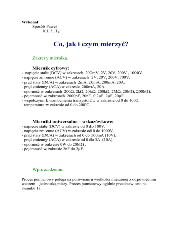 Wykonał: Sposób Paweł KL 3 „TE” Co, jak i czym mierzyć? Zakresy miernika. Miernik cyfrowy: - napięcie stałe (DCV) w zakresach 200mV, 2V, 20V, 200V , 1000V. - napięcie zmienne (ACV) w zakresach 2V, 20V, 200V, 700V. - prąd stały (DCA) w zakresach 2mA, 20mA, 200mA, 20A. - prąd zmienny (ACA) w zakresie 200mA, 20A. - oporność w zakresach 200Ω, 2kΩ, 20kΩ, 200kΩ, 2MΩ, 20MΩ, 200MΩ. - pojemność w zakresach 2000pF, 20nF, 0,2µF, 2µF, 20µF. - współczynnik wzmocnienia tranzystorów w zakresie od 0 do 1000. - temperatura w zakresie od 0 do 200oC. Mierniki uniwersalne – wskazówkowe: - napięcie stałe (DCV) w zakresie od 0 do 100V. - napięcia zmienne (ACV) w zakresie od 0 do 1000V. - prąd stały (DCA) w zakresach od 0 do 500mA (10V). - prąd zmienny (ACA) w zakresie od 0 do 3A (10A). - oporność w zakresie 0W do 20MΩ . - pojemność w zakresie 2nF do 2µF. Wprowadzenie. Proces pomiarowy polega na porównaniu wielkości mierzonej z odpowiednim wzorem – jednostką miary. Proces pomiarowy ogólnie przedstawiono na rysunku 1a. W celu otrzymania właściwych rezultatów pomiarów, należy wziąć pod uwagę kilka podstawowych zasad: • W zależności od mierzonej wielkości, (jaką wartość na mieć mierzona wielkość oraz z jaką dokładnością należy zmierzyć) należy wybrać typ przyrządy pomiarowego, • Przed przystąpieniem do pomiaru należy dokładnie zapoznać z instrukcja obsługi przyrządu, a następnie postępować ściśle z jej treścią, • W przypadku wykonania pomiarów przyrządem wymagającym kalibracji, należy jej dokonać przed każdym pomiarem, • Pomiar napięć i prądów należy rozpocząć od ustawienia przyrządu pomiarowego na najwyższym zakresie – nie dotyczy przyrządów z automatyczną zmianą zakresu, • Wykonując pomiaru różnymi przyrządami należy uwzględnić ich impedancję wewnętrzną i klasą dokładności, • Przy posługiwaniu się przyrządem magnetoelektrycznym biegun dodatni przyrządu dołącza się do bieguna „+” źródła prądu, natomiast biegun ujemny do bieguna „-”, • Przy zmianie zakresu pomiarowego zmienia się impedancja wewnętrzna przyrządu, a wiec wyniki pomiaru na różnych zakresach przyrządu może się nieznacznie różnić, • Nie należy podłączać przyrządu do badanego układu na czas dłuższy, niż jest to konieczne, Podstawowe uwagi dotyczące pomiarów. W praktyce amatorskiej, najczęściej używanym przyrządem jest miernik uniwersalny (wychyłowy) lub cyfrowy, częściej nazywany multimetrem. Sama nazwa wskazuje, co możemy znaleźć w obudowie z ustrojem lub wyświetlaczem. Zazwyczaj taki miernik jest "kombajnem" wyposażonym w woltomierz, amperomierz, omomierz oraz możemy dokonać pomiaru, pojemności, tranzystorów, częstotliwości, temperatury. Obsługa tych mierników nie jest skomplikowana, najczęściej na obudowie zobaczymy: dwa lub cztery gniazda, przełącznik zakresów, wskaźnik i ewentualnie dodatkowe gniazda do pomiaru kondensatorów, tranzystorów oraz temperatury. Informacje, jakimi parametrami dysponuje nasz miernik, znajdziemy w instrukcji obsługi. Gorzej, kiedy instrukcji nie posiadamy, wtedy musimy nasz przyrząd dokładnie obejrzeć i zorientować się, jakie parametry mierzy, jakie ma zakresy pomiarowe, do czego służy, jakie pokrętło i gniazdo itd. Generalnie należy przyjąć, że nasz przyrząd mierzy: Pomiar napięcia - V - stałego lub zmiennego tą wielkość mierzymy woltomierzem. Przyrząd ( woltomierz) włączamy do układu, zawsze równolegle do elementu, na którym mierzymy napięcie. A następnie ustawiamy zakres pomiarowy przy napięciu stałym (DCV) i obieramy zakres liczbowy w przypadku miernika cyfrowego 20V a mamy do zmierzenia baterie 9V. Miernik ma jedno skale od 0 do 100V. Przy pomiarze napięcia zmiennego multimetr ustawiamy na zakres (ACV) i zakres liczbowy 700V mierzone napięcie z sieci, które ma wartość 230V. Przykłady włączenia woltomierza przy pomiarze napięcia stałego i zmiennego pokazane są na rys. 1 i 2. Pomiar prądu - A - stałego lub zmiennego tą wielkość mierzymy amperomierzem. Przyrząd ( amperomierz) włączamy do układu, zawsze szeregowo z elementem, przez który płynie mierzony prąd. Przystępując do pomiary prądu musimy oszacować, jaki popłynie prąd w obwodzie. A następnie ustawić zakres na mierniku. Prąd stały (DCA) a prąd przemienny (ACA). Przykłady włączenia amperomierza przy pomiarze prądu stałego i zmiennego pokazane są na rys. 3 i 4. Pomiar rezystancji - Ω - czyli badanie rezystorów przeprowadza się poprzez pomiar ich rezystancji, zgodnie z rysunkiem 5. Pomiaru dokonujemy bezpośrednio na elemencie (rezystorze)- pamiętając, że pomiar rezystora wlutowanego w płytkę razem z innymi elementami może dawać wskazania odbiegające od faktycznej wartości. Musimy ten rezystor wylutować z obwody. Przystępujemy do badania bierzemy nasz rezystor odczytujemy jego wartość z kodu paskowego a następnie ustawiamy zakres na multimetrze tak by wskazał nam wartość tego rezystora wiec ustawiamy 200Ω przykładamy przewody do końców rezystora i odczytujemy wartość wskazania miernika. Wynosi ona 199,8Ω stwierdzamy, że rezystor jest sprawny. Pomiar pojemności - C - tą wielkość mierzymy miernikiem pojemności. Pomiaru dokonujemy bezpośrednio na elemencie - kondensatorze (rys. 6). Zmierzymy pojemność kondensatora. Kiedy mamy multimetr z gniazdo do pomiaru pojemności to badanie jest bardzo proste, odczytujemy wskazanie miernika. Pojawia się problem, kiedy naszym miernikiem nie da się zmierzyć pojemności, ale na to też jest rada. Stosujemy do badania omomierz. Przykładamy końcówki do wyprowadzeń kondensatora i widzimy, że na wskaźniku nie ma żadnego wskazania to wtedy stwierdzamy, że nasz kondensator nie ma zwarcia. Kondensator nie przepuszcza prądu stałego, ale przepuszcza prąd zmienny przy okazji stanowiąc dla niego pewną oporność. Mamy ro