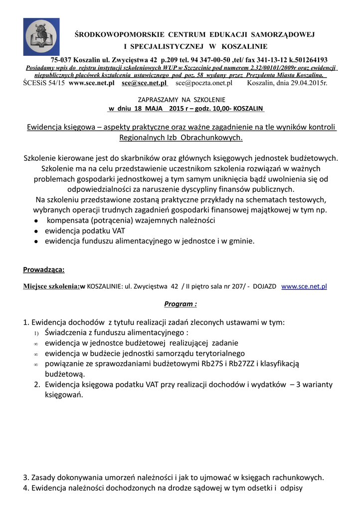 ŚRODKOWOPOMORSKIE CENTRUM EDUKACJI SAMORZĄDOWEJ I SPECJALISTYCZNEJ W KOSZALINIE 75-037 Koszalin ul. Zwycięstwa 42 p.209 tel. 94 347-00-50 ,tel/ fax 341-13-12 k.501264193 Posiadamy wpis do rejstru instytucji szkoleniowych WUP w Szczecinie pod numerem 2.32/00101/2009r oraz ewidencji niepublicznych placówek kształcenia ustawicznego pod poz. 58 wydany przez Prezydenta Miasta Koszalina. ŚCESiS 54/15 www.sce.net.pl [email protected] [email protected] Koszalin, dnia 29.04.2015r. ZAPRASZAMY NA SZKOLENIE w dniu 18 MAJA 2015 r – godz. 10,00- KOSZALIN Ewidencja księgowa – aspekty praktyczne oraz ważne zagadnienie na tle wyników kontroli Regionalnych Izb Obrachunkowych. Szkolenie kierowane jest do skarbników oraz głównych księgowych jednostek budżetowych. Szkolenie ma na celu przedstawienie uczestnikom szkolenia rozwiązań w ważnych problemach gospodarki jednostkowej a tym samym uniknięcia bądź uwolnienia się od odpowiedzialności za naruszenie dyscypliny finansów publicznych. Na szkoleniu przedstawione zostaną praktyczne przykłady na schematach testowych, wybranych operacji trudnych zagadnień gospodarki finansowej majątkowej w tym np. kompensata (potrącenia) wzajemnych należności ewidencja podatku VAT ewidencja funduszu alimentacyjnego w jednostce i w gminie. Prowadząca: Miejsce szkolenia:w KOSZALINIE: ul. Zwycięstwa 42 / II piętro sala nr 207/ - DOJAZD www.sce.net.pl Program : 1. Ewidencja dochodów z tytułu realizacji zadań zleconych ustawami w tym: 1) Świadczenia z funduszu alimentacyjnego : • ewidencja w jednostce budżetowej realizującej zadanie • ewidencja w budżecie jednostki samorządu terytorialnego • powiązanie ze sprawozdaniami budżetowymi Rb27S i Rb27ZZ i klasyfikacją budżetową. 2. Ewidencja księgowa podatku VAT przy realizacji dochodów i wydatków – 3 warianty księgowań. 3. Zasady dokonywania umorzeń należności i jak to ujmować w księgach rachunkowych. 4. Ewidencja należności dochodzonych na drodze sądowej w tym odsetki i odpisy aktualizujące. 5. Ewidencja i wycena środków trwałych w budowie : ewidencja księgowa według źródeł ich finansowania w tym ze środków europejskich zasady wyceny i weryfikacji efektów inwentaryzacyjnych zasady korygowania nieprawidłowości po przyjęciu środka trwałego na stan majątkowy 6. Prawidłowości w ustalaniu terminów inwentaryzacji dla uniknięciu dyscypliny finansów publicznych. 7. Tezy kontrolne gospodarki kasowej w twojej jednostce opracowane w oparciu o przeprowadzone kontrole. 8. Kiedy nie ponosi się odpowiedzialności za naruszenie dyscypliny finansów publicznych. Uczestnicy otrzymują zaświadczenie o ukończeniu szkolenia. Odpłatność : 300,00 zł od osoby - płatne przelewem 7 DNI od otrzymania rachunku . W cenie zapewniamy: serwis kawowy,catering oraz materiały szkoleniowe. Zgłoszenie na szkolenie prosimy wypełnić i przesłać faxem /tel/fax 94-341-13-12. Zgłaszając uczestnictwo faxem prosimy o potwierdzenie telefoniczne. W przypadku nie zebrania odpowiedniej ilości osób organizator zastrzega sobie prawo odwołania szkolenia lub zmiany terminu. DYREKTOR Małgorzata Urbanek Termin zgłoszenia :do 4 dni przed szkoleniem /po terminie można zgłaszać telefonicznie/ Z G Ł O S Z E N I E – „EWIDENCJA KSIĘGOWA ” 18.05.2015 r –g.10.00 KOSZALIN KARTA ZGŁOSZENIOWA - DANE DO WYSTAWIENIA FAKTURY /NAZWA,ADRES ,NIP/ ................................................................................................................................................. NIP ...................................................... TEL. ................................................ 1. ......................................................................................... .................................................. /imię i nazwisko/ /stanowisko/ 2. ............................................................................................................................................... /wpisać pismem drukowanym / Należność w wysokości ............... złotych za szkolenie przekażemy gotówką/przelewem/ na konto: PKO BP SA 04 1020 2791 0000 7102 0142 4241. Przyjmujemy do wiadomości, że nie zgłoszenie rezygnacji pisemnej ze szkolenia na 4 dni robocze przed terminem spowoduje obciążenie zgłaszającego pełnymi kosztami szkolenia. Zgadzamy się na przetwarzanie danych osobowych zawartych w zgłoszeniu do czynnosci związanych z realizacją szkolenia. ........................................... /podpis i pieczątka /