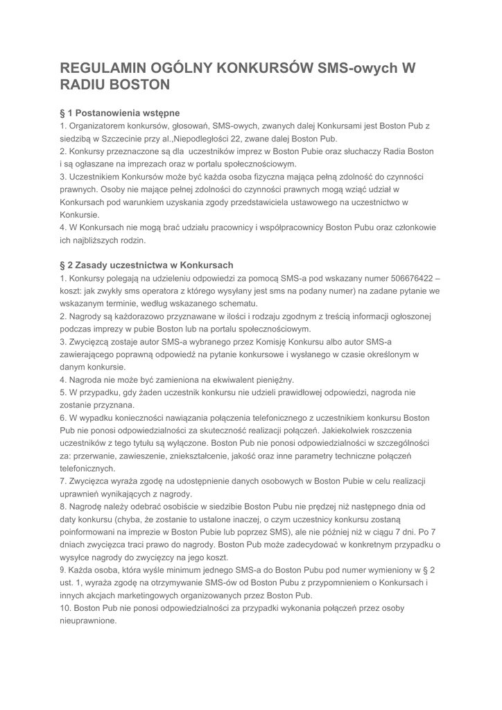 REGULAMIN OGÓLNY KONKURSÓW SMS-owych W RADIU BOSTON § 1 Postanowienia wstępne 1. Organizatorem konkursów, głosowań, SMS-owych, zwanych dalej Konkursami jest Boston Pub z siedzibą w Szczecinie przy al.,Niepodległości 22, zwane dalej Boston Pub. 2. Konkursy przeznaczone są dla uczestników imprez w Boston Pubie oraz słuchaczy Radia Boston i są ogłaszane na imprezach oraz w portalu społecznościowym. 3. Uczestnikiem Konkursów może być każda osoba fizyczna mająca pełną zdolność do czynności prawnych. Osoby nie mające pełnej zdolności do czynności prawnych mogą wziąć udział w Konkursach pod warunkiem uzyskania zgody przedstawiciela ustawowego na uczestnictwo w Konkursie. 4. W Konkursach nie mogą brać udziału pracownicy i współpracownicy Boston Pubu oraz członkowie ich najbliższych rodzin. § 2 Zasady uczestnictwa w Konkursach 1. Konkursy polegają na udzieleniu odpowiedzi za pomocą SMS-a pod wskazany numer 506676422 – koszt: jak zwykły sms operatora z którego wysyłany jest sms na podany numer) na zadane pytanie we wskazanym terminie, według wskazanego schematu. 2. Nagrody są każdorazowo przyznawane w ilości i rodzaju zgodnym z treścią informacji ogłoszonej podczas imprezy w pubie Boston lub na portalu społecznościowym. 3. Zwycięzcą zostaje autor SMS-a wybranego przez Komisję Konkursu albo autor SMS-a zawierającego poprawną odpowiedź na pytanie konkursowe i wysłanego w czasie określonym w danym konkursie. 4. Nagroda nie może być zamieniona na ekwiwalent pieniężny. 5. W przypadku, gdy żaden uczestnik konkursu nie udzieli prawidłowej odpowiedzi, nagroda nie zostanie przyznana. 6. W wypadku konieczności nawiązania połączenia telefonicznego z uczestnikiem konkursu Boston Pub nie ponosi odpowiedzialności za skuteczność realizacji połączeń. Jakiekolwiek roszczenia uczestników z tego tytułu są wyłączone. Boston Pub nie ponosi odpowiedzialności w szczególności za: przerwanie, zawieszenie, zniekształcenie, jakość oraz inne parametry techniczne połączeń telefonicznych. 7. Zwycięzca wyraża zgodę na udostępnienie danych osobowych w Boston Pubie w celu realizacji uprawnień wynikających z nagrody. 8. Nagrodę należy odebrać osobiście w siedzibie Boston Pubu nie prędzej niż następnego dnia od daty konkursu (chyba, że zostanie to ustalone inaczej, o czym uczestnicy konkursu zostaną poinformowani na imprezie w Boston Pubie lub poprzez SMS), ale nie później niż w ciągu 7 dni. Po 7 dniach zwycięzca traci prawo do nagrody. Boston Pub może zadecydować w konkretnym przypadku o wysyłce nagrody do zwycięzcy na jego koszt. 9.Każda osoba, która wyśle minimum jednego SMS-a do Boston Pubu pod numer wymieniony w § 2 ust. 1, wyraża zgodę na otrzymywanie SMS-ów od Boston Pubu z przypomnieniem o Konkursach i innych akcjach marketingowych organizowanych przez Boston Pub. 10. Boston Pub nie ponosi odpowiedzialności za przypadki wykonania połączeń przez osoby nieuprawnione. 11. Boston Pub nie ponosi odpowiedzialności za ewentualne nieprawidłowości w SMS-ach powstałych w szczególności z winy operatora lub/i uczestnika/abonenta. § 3 Reklamacje 1. Reklamacje związane z Konkursami mogą być kierowane do Boston Pubu wyłącznie w formie pisemnej, w terminie 5 dni od daty zakończenia danego Konkursu. 2. Reklamacja powinna zawierać imię, nazwisko, dokładny adres jak również dokładny opis i powód reklamacji. 3. W przypadku przesłania reklamacji złożonej za pośrednictwem poczty, decyduje data doręczenia przesyłki. 4. Złożone przez uczestników reklamacje będą rozpatrywane nie później niż w terminie 15 dni od daty otrzymania reklamacji. 5. Zainteresowani uczestnicy zostaną powiadomieni o rozpatrzeniu reklamacji listem poleconym najpóźniej w ciągu 7 dni roboczych od daty rozpatrzenia reklamacji. 6. Spory odnoszące się i wynikające z Konkursu będą rozwiązywane przez Boston Pub Wszelkie decyzje Boston Pub będą wiążące i ostateczne. 7. Boston Pub jest uprawniony do zmiany postanowień niniejszego Regulaminu. § 4 Komisja Konkursowa. Wykluczenia z udziału w Konkursach. 1. Kontrola poprawności prowadzenia Konkursów i ich zgodności z postanowieniami regulaminu spoczywa na trzyosobowej Komisji konkursowej. Decyzje w/w Komisja podejmuje wspólnie; w razie braku jednomyślności członków Komisji przy podejmowaniu decyzji rozstrzyga kierownik Boston Pubu sprawujący pieczę nad Konkursami organizowanymi przez Boston Pub. 2. Decyzje Komisji dotyczące rozstrzygnięć Konkursu są ostateczne. 3. Boston Pub ma prawo w każdym momencie trwania Konkursów wykluczyć z udziału w nim (w tym odmówić przyznania nagrody) uczestnika, w stosunku do którego podjęło uzasadnione podejrzenie o działalności sprzecznej z niniejszym regulaminem. § 5 Postanowienia końcowe 1. Boston Pub ponosi odpowiedzialność za organizację Konkursów i treść Konkursów. 2. Regulamin niniejszy jest jedynym dokumentem określającym zasady Konkursów w Boston Pubie, o ile nie został opublikowany szczegółowy regulamin konkretnego Konkursu. Zgłoszenie się do Konkursu jest jednoznaczne z akceptacją niniejszego regulaminu. 3. W uzasadnionych przypadkach Boston Pub może zmienić niniejszy regulamin. Zmiany do regulaminu będą wprowadzane w formie aneksów do regulaminu i będą obowiązywać od momentu umieszczenia regulaminu w zmienionej formie na stronie Boston Pubu. 4.Niniejszy regulamin jest dostępny w siedzibie oraz na stronie internetowej www.bostonlive.pl. 5. W sprawach nieuregulowanych niniejszym regulaminem zastosowanie będą miały odpowiednie przepisy kodeksu cywilnego (Dz. U. 1964, nr 16, poz. 93 z późn. zm.).