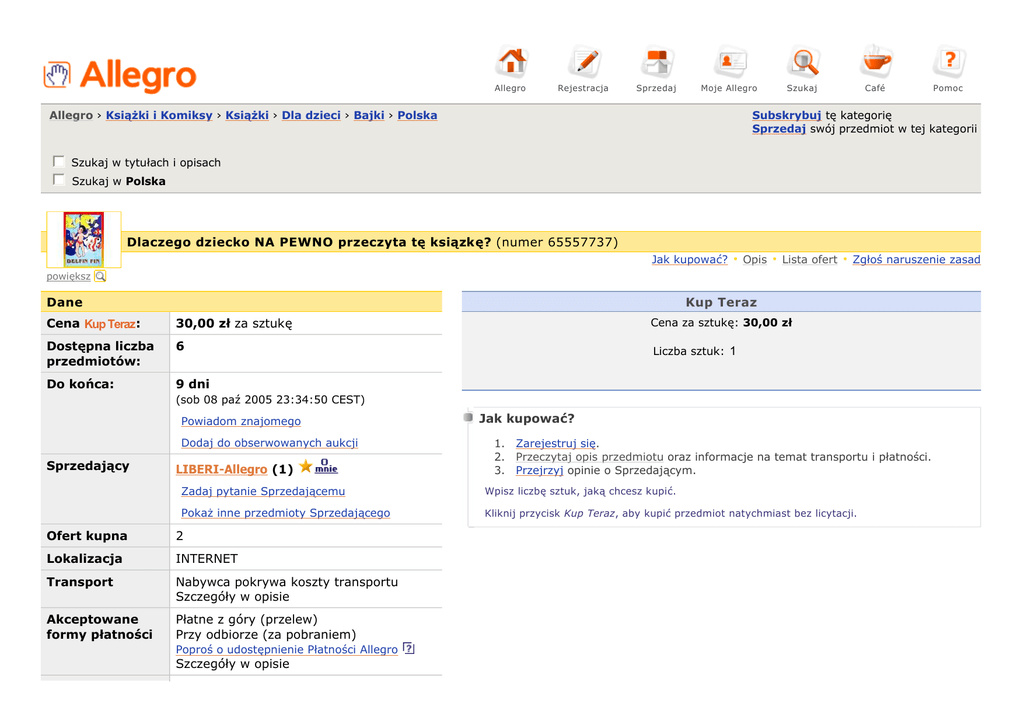 Allegro Rejestracja Sprzedaj Moje Allegro Allegro › Książki i Komiksy › Książki › Dla dzieci › Bajki › Polska Szukaj Café Pomoc Subskrybuj tę kategorię Sprzedaj swój przedmiot w tej kategorii c Szukaj w tytułach i opisach d e f g c Szukaj w Polska d e f g Dlaczego dziecko NA PEWNO przeczyta tę ksiązkę? (numer 65557737) Jak kupować? Opis Lista ofert Zgłoś naruszenie zasad powiększ Dane Kup Teraz Cena Kup Teraz: 30,00 zł za sztukę Cena za sztukę: 30,00 zł Dostępna liczba przedmiotów: 6 Liczba sztuk: 1 Do końca: 9 dni (sob 08 paź 2005 23:34:50 CEST) Powiadom znajomego Dodaj do obserwowanych aukcji Sprzedający LIBERI-Allegro (1) Jak kupować? 1. Zarejestruj się. 2. Przeczytaj opis przedmiotu oraz informacje na temat transportu i płatności. 3. Przejrzyj opinie o Sprzedającym. Zadaj pytanie Sprzedającemu Wpisz liczbę sztuk, jaką chcesz kupić. Pokaż inne przedmioty Sprzedającego Kliknij przycisk Kup Teraz, aby kupić przedmiot natychmiast bez licytacji. Ofert kupna 2 Lokalizacja INTERNET Transport Nabywca pokrywa koszty transportu Szczegóły w opisie Akceptowane formy płatności Płatne z góry (przelew) Przy odbiorze (za pobraniem) Poproś o udostępnienie Płatności Allegro Szczegóły w opisie Nowi Użytkownicy, którzy nie dokonali pełnej aktywacji konta, nie mogą skorzystać z Kup Teraz. Więcej informacji Opis Stan Nowa Okładka Bohaterem tej baśni jest Twoje dziecko! Szanujemy Twój czas i nie chcemy, żebyś czytał oferty, które Ciebie nie zainteresują. Dlatego poniżej przygotowaliśmy pytania, które ułatwią Ci ocenę, czy i na ile jesteś zainteresowany naszą ofertą. Jeśli odpowiedź na jedno z poniższych pytań brzmi TAK - przeczytaj tę ofertę do końca. Twarda Najczęściej zadawane pytania Czy książka nadaje się na prezent dla dziecka, które nie umie jeszcze czytać? Tak, chociaż ostrzegamy, że rodzic, który kupi tę książkę swojemu bardzo małemu dziecku, po tygodniu będzie bliski obłędu. Dziecko będzie chciało, żeby wciąż od nowa czytać mu tę książkę, co niektórych rodziców doprowadza na skraj wytrzymałości psychicznej. Ta informacja nie jest chwytem marketingowym - to jest fakt. Piszą nam o tym nasi klienci. Szukasz prezentu, który zadziwi Twoje dziecko? Szukasz prezentu, którym rodzina i znajomi będą zachwyceni? Szukasz prezentu, który NA PEWNO nie zostanie rzucony w kąt po rozpakowaniu pudełka? Czy książka nadaje się na prezent dla Szukasz prezentu, który nie tylko bawi, ale też jest w stanie czegoś Twoje dziecko nauczyć? dziecka powyżej 10 lat? Szukasz prezentu, który z całą pewnością zostanie trwałą pamiątką i powędruje z Twoim dzieckiem w dorosłość? Szukasz dla swojego dziecka prezentu wyjątkowego w rozsądnej cenie? Szukasz prezentu dla dziecka w wieku od 2 do 10 lat? Jeśli odpowiedź na chociaż jedno z powyższych pytań brzmi TAK, to prawdopodobnie szukasz właśnie tego, co chcemy Ci zaproponować na tej aukcji. Przedmiotem aukcji jest książka, której bohaterem jest Twoje dziecko. Nie Martynka z opowiadań Delahaye, ani Czerwony Kapturek, czy Tomek z książek Szklarskiego. W tej książce bohaterem jest Twoje dziecko, znane z imienia i nazwiska. Dlaczego ta książka jest taka WYJĄTKOWA? Ta książka jest naprawdę wyjątkowa, bo jej bohaterem jest Twoje dziecko. Jego imię i nazwisko znajduje się w tytule książki Jego imię występuje w tekście Jeśli zechcesz, na stronie tytułowej pojawi się zdjęcie Twojego dziecka i/lub dedykacja, która nie pozwoli dziecku zapomnieć kiedy i od kogo dostało ten niezwykły prezent Dziecku towarzyszy w książce jego kolega lub koleżanka, albo brat czy siostra. Oni również znani są z imienia Opowieść zaczyna się w rodzinnej miejscowości dziecka, co jeszcze bardziej je przekonuje, że ta książka jest właśnie o nim Zobacz, jak wyglądają przykładowe strony jednej z książek. Kliknij na miniaturkę, aby zobaczyć w nowym oknie powiększenie i opis. Nie zalecamy. Teksty zostały tak opracowane, aby przekazywać wiedzę o świecie dzieciom poniżej 10 roku życia. Dzieci starsze niewielu nowych rzeczy się z nich nauczą, chociaż robi na nich wielkie wrażenie fakt, że są bohaterami książki. Natomiast niektórzy rodzice zamawiają te książki dla swoich DOROSŁYCH dzieci z okazji 18 urodzin jako wyjątkową pamiątkę. W książce zamieszczają wówczas mozaikę zdjęć z całego okresu życia dziecka. Pomysł przedstawiamy do oceny i ewentualnego wykorzystania. M am problem z dedykacją. Czy pomożecie mi w dobraniu dedykacji stosownej do okoliczności? Tak. Poinformuj nas na jaką okazję być prezentem, a my zaproponujemy tekst. Ta usługa jest całkowicie bezpłatna. Jeśli w książce ma pojawić się dedykacja nie powinna być dłuższa niż książka ma odpowiedni zdjęcie, to 5 wersów. Czy mogę przysłać swój własny tekst do bajki? Nie ma takiej możliwości, ponieważ każdy z tytułów posiada swój własny ISBN i objęty jest prawami autorskimi. Oznacza to, że nie ma możliwości ingerencji w zawartość tekstu - jest on chroniony przez prawo. Jak powinno wyglądać zdjęcie dziecka, które przyślę do zamieszczenia w książce? Najważniejsze jest, aby na zdjęciu dobrze widoczna była twarz dziecka. Często wykorzystujemy zdjęcia portretowe i tzw. okolicznościowe (chrzciny, komunia, itp.) obejmujące całą sylwetkę. Ładnie wyglądają również zdjęcia w plenerze - z wycieczek lub spacerów. Najlepiej jest, kiedy zdjęcie ma jasne tło. Aby zdjęcie po wydrukowaniu wyglądało ładnie i profesjonalnie powinno być ostre i nie za małe. Wykorzystujemy zdjęcia w formie elektronicznej lub papierowej. Zdjęcia w formie papierowej skanujemy, dlatego najlepiej jest, kiedy są one zrobione na papierze błyszczącym. Zdjęcia matowe drukowane są zwykle na papierze o strukturze ziarnistej, co widać później na wydruku. Minimalna wielkość zdjęcia papierowego to fo