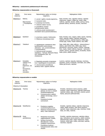 Witaminy - zestawienie podstawowych informacji Witaminy rozpuszczalne w tłuszczach Nazwa witaminy Witamina A Inne nazwy Retinol, Beta-karoten = Prowitamina A Najważniejszy wpływ na funkcje organizmu Najbogatsze źródła wzrost i ogólny rozwój organizmu, tworzenie kości, produkcja hormonów, widzenie (także nocne), prawidłowy rozwój i funkcjonowanie skóry, • ochrona przed nowotworami i chorobami serca (przeciwutleniacz). Ryby morskie, tran, wątroba wołowa, wątroba wieprzowa, węgorz, żółtko jaj, masło, oleje roślinne, szpinak, morele, sałata, jarmuż, dynia, groszek zielony, boćwina, szczaw, marchew. Ryby morskie, tran, węgorz, śledź, szprot, makrela, łosoś, wątroba cielęca, wątroba wieprzowa, wątroba wołowa, wątroba barania, żółtko jaja, świeże jaja, masło, masło roślinne, sery żółte. • • • • • Witamina D Kalciferol • • Witamina E Tokoferol • zapobieganie uszkodzeniu błon komórkowych przez procesy utleniania - tzw. przeciwutleniacz (=antyoksydant), • Ochrona przed rozwojem miażdżycy - hamuje utlenianie frakcji LDL cholesterolu (tzw. zły cholesterol). Soja, kiełki zbóż, oleje roślinne - słonecznikowy i sojowy, jaja świeże całe, żółtko jaja, kasze jęczmienna i gryczana, zboża, orzechy, szparagi, tran, masło, masło roślinne, kapusta - czerwona i włoska, jarmuż, groszek zielony, brukselka, fasola biała, groch, płatki owsiane. Witamina K Kompleks witamin K to: wit. K1 Filochinon, wit. K2 farnochinon, wit. K3 menadion. • Lucerna, szpinak, kapusta, kalarepa, marchew, pomidory, groch, truskawki, ziemniaki, sery żółte, żółtka jaj kurzych, wątroba. przemiany wapnia i fosforanów Właściwa mineralizacja kości Regulacja procesów krzepnięcia krwi i zapobieganie krwawieniom. • utrzymywanie prawidłowej struktury kości i gojenie złamań. Witaminy rozpuszczalne w wodzie Nazwa witaminy Inne nazwy Najważniejszy wpływ na funkcje organizmu Najbogatsze źródła Witaminy B (kompleks) Witamina B1 Tiamina • • • Witamina B2 Ryboflawina • • Witamina B5 Kwas pantotenowy • • • Przemiany metaboliczne glukozy we krwi w związki wysokoenergetyczne, Funkcjonowanie włókien układu nerwowego, serca i mięśni, Produkcja krwinek czerwonych. Drożdże, niełuskane ziarno pszenicy, płatki owsiane, mięso wieprzowe, wątroba wieprzowa, wątroba cielęca, jaja, ziemniaki, orzechy, groch, fasola, pieczywo pełnoziarniste. Produkcja związków wysokoenergetycznych, Właściwe funkcjonowanie skóry i błon śluzowych Drożdże, wątroba cielęca, wątroba wieprzowa, mleko, płatki owsiane, całe ziarno pszenicy, szpinak, mięso wieprzowe, jaja, marchew, chleb biały, ser żółty, makrela. Metabolizm tłuszczów, węglowodanów i białek, Synteza hormonów sterydowych i innych związków chemicznych. Prawidłowa budowa i funkcjonowanie skóry oraz włosów Drożdże, wątroba wieprzowa, wątroba cielęca, jaja, niełuskane ziarno pszenicy, płatki owsiane, pełnoziarnisty chleb, mięso wieprzowe, mięso wołowe, chleb biały, mleko, ziemniaki, szpinak, marchew, kapusta. Witamina B6 Pirydoksyna • Ochrona przed infekcjami. • Synteza i regulacja ponad 60 białek w organizmie (głównie białka związane z prawidłowym funkcjonowaniem układu nerwowego) Produkcja czerwonych i białych komórek krwi. Drożdże, niełuskane ziarno pszenicy, mięso wołowe, mięso wieprzowe, chleb biały, kapusta, płatki owsiane, mleko, marchew, ziemniaki, ryby. Tworzenie czerwonych komórek krwi, Tworzenie materiału genetycznego (synteza DNA i RNA), Prawidłowe funkcjonowanie układu nerwowego. Wątroba wołowa, wątroba wieprzowa, nerki wołowe, nerki wieprzowe, śledź, makrela, łosoś, pstrąg, mózg wieprzowy, ozór wołowy, flądra, dorsz, mózg cielęcy, wołowina, baranina, cielęcina, żółtko jaja kurzego, sery żółte. Procesy utleniania i redukcji w organizmie Regulacja poziomu cukru we krwi (produkcja związków energetycznych). Regulacja przepływu krwi w naczyniach krwionośnych. Regulacja poziomu cholesterolu. Drożdże, wątroba wieprzowa, wątroba cielęca, mięso wołowe, mięso wieprzowe, niełuskane ziarno pszenicy, pełnoziarnisty chleb, marchew, chleb biały, groszek szpinak, jabłka, kapusta, pomarańcze, ziemniaki, makrela. Zmniejszanie szkodliwego działania chemicznych procesów utleniających tzw. przeciwutleniacz Produkcja kolagenu i podstawowych białek w całym organizmie (kości, chrząstki, ścięgna, więzadła). Zwiększanie wydajności układu odpornościowego. Przyspieszanie gojenia ran, Róża cukrowa, róża dzika, porzeczka czarna, porzeczka biała, porzeczka czerwona, agrest, grejpfrut, cytryna, pomarańcz, malina, truskawka, rabarbar, bób, kapusta, kalafior, szczypior, pory cebula, groszek zielony, ziemniaki, pomidory, rzepa, jarmuż, kapusta czerwona, kapusta włoska, chrzan, rzodkiewka, brukselka, brokuły. Regulacja różnych procesów metabolicznych w organizmie, Tworzenie kwasów nukleinowych DNA i RNA, Jest chemicznym przekaźnikiem w mózgu. Zapobieganie chorobom serca i miażdżycy. Tworzenie czerwonych komórek krwi. Wątroba wołowa, szpinak, nać buraków, kawon, dynia, kapusta, ziemniaki, mleko, jaja, wołowina, groszek zielony, marchew, pełnoziarnisty chleb, kasza jęczmienna, drożdże. Synteza aminokwasów, białek i kwasów tłuszczowych. Prawidłowa budowa i funkcjonowanie skóry oraz włosów, wspomaganie funkcji tarczycy. Ziarno pszenicy, jaja, mleko, kurczak, śledź, wieprzowina, wołowina, banany, winogrona, pomarańcze, kalafior, groch, szpinak, cebula, sałata, buraki, marchew, kapusta, drożdże, grzyby. • Witamina B12 Kobalamina • • • Witamina PP Witamina B3, Niacyna, Kwas nikotynowy • • • • Witamina C Kwas askorbinowy • • • • Kwas foliowy Folacyna, Witamina B9 • • • • • Witamina H Biotyna • • •