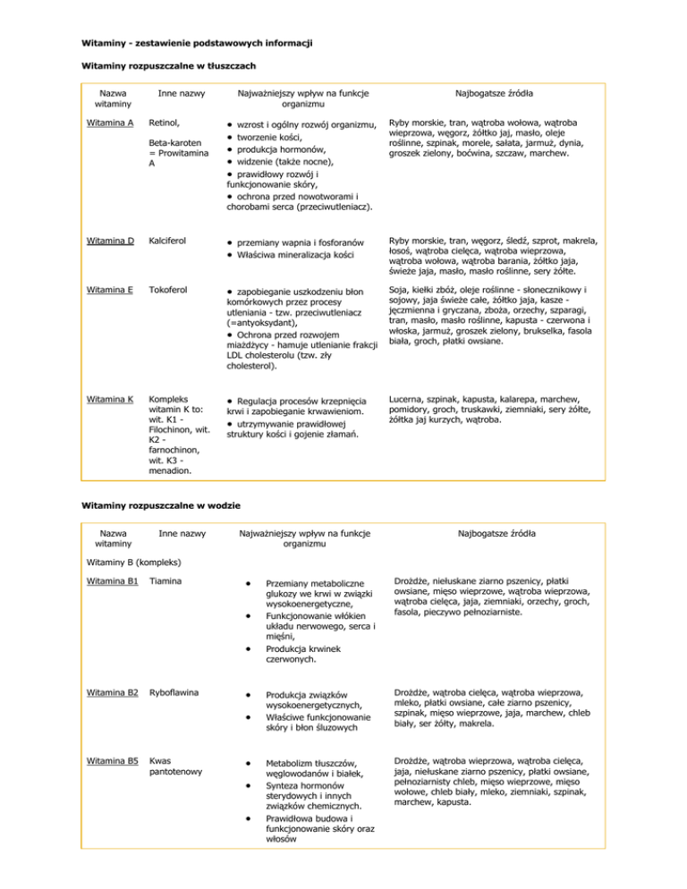 Witaminy - zestawienie podstawowych informacji Witaminy