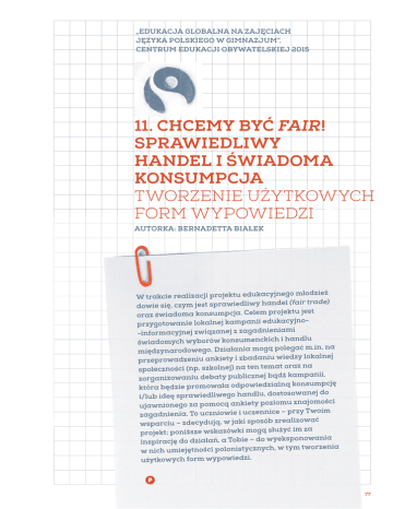 „EDUKACJA GLOBALNA NA ZAJĘCIACH JĘZYKA POLSKIEGO W GIMNAZJUM”, CENTRUM EDUKACJI OBYWATELSKIEJ 2015 11. CHCEMY BYĆ FAIR! SPRAWIEDLIWY HANDEL I ŚWIADOMA KONSUMPCJA TWORZENIE UŻYTKOWYCH FORM WYPOWIEDZI AUTORKA: BERNADETTA BIAŁEK go młodzież W trakcie realizacji projektu edukacyjne del (fair trade) dowie się, czym jest sprawiedliwy han jektu jest oraz świadoma konsumpcja. Celem pro kacyjnoprzygotowanie lokalnej kampanii edu ami -informacyjnej związanej z zagadnieni i handlu świadomych wyborów konsumenckich gać m.in. na pole międzynarodowego. Działania mogą dzy lokalnej przeprowadzeniu ankiety i zbadaniu wie oraz na społeczności (np. szkolnej) na ten temat ź kampanii, zorganizowaniu debaty publicznej bąd ą konsumpcję która będzie promowała odpowiedzialn tosowanej do i/lub ideę sprawiedliwego handlu, dos u znajomości ujawnionego za pomocą ankiety poziom – przy Twoim zagadnienia. To uczniowie i uczennice lizować wsparciu – zdecydują, w jaki sposób zrea yć im za projekt; poniższe wskazówki mogą służ ksponowania inspirację do działań, a Tobie – do wye tym tworzenia w nich umiejętności polonistycznych, w użytkowych form wypowiedzi. P 77 11. CHCEMY BYĆ FAIR! SPRAWIEDLIWY HANDEL I ŚWIADOMA KONSUMPCJA. TWORZENIE UŻYTKOWYCH FORM WYPOWIEDZI Proponowany problem: Jak być fair wobec otaczającego nas świata? Zagadnienia: Konsumpcja i produkcja Globalny rynek i handel międzynarodowy Żywność i rolnictwo Związek z podstawą programową: I: 1.1-1.3, 2.1, 2.2, III: 1.1-1.8 Proponowane cele projektu: Dowiemy się, czym jest sprawiedliwy handel (fair trade) oraz świadoma konsumpcja. Zdiagnozujemy, jaki jest stan wiedzy lokalnej społeczności na temat sprawiedliwego handlu i świadomej konsumpcji. Zorganizujemy kampanię edukacyjno-informacyjną promującą odpowiedzialną konsumpcję i/lub ideę sprawiedliwego handlu w naszej społeczności. Będziemy doskonalić umiejętność świadomego i poprawnego posługiwania się językiem polskim. Proponowany okres realizacji projektu: 8-12 tygodni Proponowana liczebność grupy projektowej: Około 5-6 osób; klasę można podzielić na zespoły, które będą odpowiedzialne za poszczególne zadania. PROPONOWANE ETAPY DZIAŁANIA W PROJEKCIE: 1. Przeprowadzenie zajęć lub spotkania wprowadzającego do zagadnienia sprawiedliwego handlu i świadomej konsumpcji. Spotkanie ma na celu zainteresowanie młodzieży tym zagadnieniem, zachęcenie jej do podjęcia aktywności oraz wskazanie potencjalnych źródeł, z których może czerpać wiarygodne informacje. Do udziału w spotkaniu można również zaprosić nauczycieli i nauczycielki innych przedmiotów, którzy są zainteresowani poruszaniem tej tematyki na swoich zajęciach i chcą włączyć się w działania projektowe. Podczas spotkania warto przeczytać wspólnie tekst Katarzyny Szeniawskiej pt. „Świadoma konsumpcja” (załącznik nr 1; dostępny pod adresem: http://bit.ly/ceo_swiadoma_konsumpcja); warto również zachęcić młodzież do zapoznania się z dwoma tekstami, które ukazują pozytywne i negatywne kwestie związane ze sprawiedliwym handlem: Stefan Kielan, Sprawiedliwy handel, czyli najpierw człowiek, potem zysk, 2008: http://fairtrade.org.pl/materialy-show-6.php. Robert Leszczyński, „PA PA PAA handel nie bardzo fair” w: Dziękujemy za palenie, Warszawa 2012: http://bit.ly/pah_Dziekujemy_za_palenie. Na spotkanie wprowadzające uczestnicy i uczestniczki mogą także przynieść różne produkty spożywcze, które będą stanowiły punkt wyjścia do dyskusji. Uczniowie i uczennice zastanowią się, skąd pochodzą produkty, które spożywamy, czym kierujemy się, dokonując wyborów konsumenckich, a także na czym polega świadoma konsumpcja. Nauczyciel/Nauczycielka może przynieść kilka produktów opatrzonych certyfikatem fair trade i zaproponować młodzieży degustację np. herbaty lub czekolady (zależnie od dostępności produktów i własnej inwencji). Przygotowując się do przeprowadzenia spotkania wprowadzającego, możesz również sięgnąć po następujące scenariusze zajęć oraz publikacje: „Sprawiedliwy handel” w: Współzależności globalne, Polska Zielona Sieć 2012 (s. 120-139): http://zielonasiec.pl/2012/12/19/zaleznosci-globalne-scenariusze-zajec-lekcyjnych-dla-szkol-gimnazjalnych-i-ponadgimnazjalnych/ „Świadoma konsumpcja” w: Szkoła ekorozwoju, CEO 2008 (s. 77-100): http://bit.ly/ceo_ szkola_ekorozwoju „Zanim skończysz śniadanie, już zależysz od większości świata” w: Edukacja globalna na zajęciach wiedzy o społeczeństwie, CEO 2015: globalna.ceo.org.pl. 2. Uzgodnienie kwestii organizacyjnych związanych z projektem oraz zasad współpracy podczas jego realizacji. Ustalenie wraz z młodzieżą celów projektu i działań oraz zaplanowanie ich realizacji w czasie, omówienie zasad oceny oraz samooceny. Zachęcamy do skorzystania z materiałów Centrum Edukacji Obywatelskiej poświęconych metodzie projektu edukacyjnego. Wszystkie materiały są dostępne na stronie internetowej pod adresem: http://www.ceo.org.pl/pl/projekt/. 78 11. CHCEMY BYĆ FAIR! SPRAWIEDLIWY HANDEL I ŚWIADOMA KONSUMPCJA TWORZENIE UŻYTKOWYCH... Szczególnie polecamy następujące materiały: Jak organizować i prowadzić gimnazjalne projekty edukacyjne, Jacek Strzemieczny: http://bit.ly/ceo_gimnazjalne_projekty_edukacyjne Jak zrobić dobry projekt? Przewodnik dla uczniów (prezentacja multimedialna): http://bit.ly/ceo_dobry_projekt Karta projektu i karta zadania: http://bit.ly/ceo_karta_projektu Materiały dla opiekunów projektu i wychowawców: http://bit.ly/ceo_materialy_opiekun_wychowawca Dozwolony użytek edukacyjny. Infografika (prawo autorskie w kontekście projektów): http://bit.ly/ceo_dozwolony_uzytek. 3. Wyłonienie grupy projektowej i podział młodzieży na zespoły składające się z 5-6 osób. Określenie ról i podział obowiązków pomiędzy osobami realizującymi projekt; ustalenie, jakie produkty pow