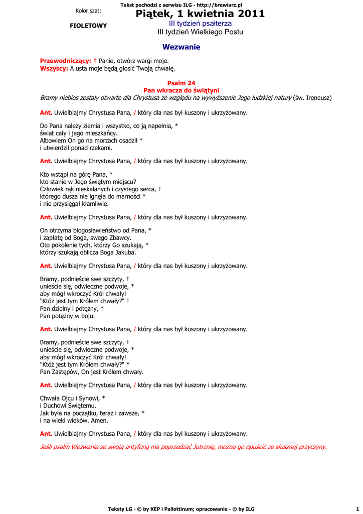 Kolor szat: Tekst pochodzi z serwisu ILG - http://brewiarz.pl Piątek, 1 kwietnia 2011 III tydzień psałterza III tydzień Wielkiego Postu FIOLETOWY Wezwanie Przewodniczący: † Panie, otwórz wargi moje. Wszyscy: A usta moje będą głosić Twoją chwałę. Psalm 24 Pan wkracza do świątyni Bramy niebios zostały otwarte dla Chrystusa ze względu na wywyższenie Jego ludzkiej natury (św. Ireneusz) Ant. Uwielbiajmy Chrystusa Pana, / który dla nas był kuszony i ukrzyżowany. Do Pana należy ziemia i wszystko, co ją napełnia, * świat cały i jego mieszkańcy. Albowiem On go na morzach osadził * i utwierdził ponad rzekami. Ant. Uwielbiajmy Chrystusa Pana, / który dla nas był kuszony i ukrzyżowany. Kto wstąpi na górę Pana, * kto stanie w Jego świętym miejscu? Człowiek rąk nieskalanych i czystego serca, † którego dusza nie lgnęła do marności * i nie przysięgał kłamliwie. Ant. Uwielbiajmy Chrystusa Pana, / który dla nas był kuszony i ukrzyżowany. On otrzyma błogosławieństwo od Pana, * i zapłatę od Boga, swego Zbawcy. Oto pokolenie tych, którzy Go szukają, * którzy szukają oblicza Boga Jakuba. Ant. Uwielbiajmy Chrystusa Pana, / który dla nas był kuszony i ukrzyżowany. Bramy, podnieście swe szczyty, † unieście się, odwieczne podwoje, * aby mógł wkroczyć Król chwały! "Któż jest tym Królem chwały?" † Pan dzielny i potężny, * Pan potężny w boju. Ant. Uwielbiajmy Chrystusa Pana, / który dla nas był kuszony i ukrzyżowany. Bramy, podnieście swe szczyty, † unieście się, odwieczne podwoje, * aby mógł wkroczyć Król chwały! "Któż jest tym Królem chwały?" * Pan Zastępów, On jest Królem chwały. Ant. Uwielbiajmy Chrystusa Pana, / który dla nas był kuszony i ukrzyżowany. Chwała Ojcu i Synowi, * i Duchowi Świętemu. Jak była na początku, teraz i zawsze, * i na wieki wieków. Amen. Ant. Uwielbiajmy Chrystusa Pana, / który dla nas był kuszony i ukrzyżowany. Jeśli psalm Wezwania ze swoją antyfoną ma poprzedzać Jutrznię, można go opuścić ze słusznej przyczyny. Teksty LG - © by KEP i Pallottinum; opracowanie - © by ILG 1 Tekst pochodzi z serwisu ILG - http://brewiarz.pl Piątek, 1 kwietnia 2011 Kolor szat: III tydzień psałterza III tydzień Wielkiego Postu FIOLETOWY Godzina Czytań K. † Boże, wejrzyj ku wspomożeniu memu. W. Panie, pośpiesz ku ratunkowi memu. Chwała Ojcu... Powyższe teksty opuszcza się, jeśli tę Godzinę poprzedza Wezwanie. HYMN 1 Oto teraz czas właściwy, Dany nam przez dobroć Boga, Aby poprzez umartwienie Świat uleczyć ze słabości. 2 Już się zbliża dzień zbawienia, Chrystusowym blaskiem świeci, A skażone grzechem serca Post nakłania do przemiany. 3 Boże, niechaj wyrzeczenia Wzmocnią ducha oraz ciało, Byśmy mogli pragnąć szczerze Przyjścia dnia wieczystej Paschy. 4 Miłosierny Boże w Trójcy, Niech Cię wielbi wszechświat cały, My zaś odrodzeni łaską Nowym hymnem Cię sławimy. Amen. PSALMODIA 1 ant. Zmęczyłem się krzykiem * wypatrując mego Boga. Psalm 69, 2-22. 30-37 Gorliwość o dom Twój mnie pożera Dali Mu pić wino zaprawione goryczą (Mt 27, 34) I Wybaw mnie, Boże, * bo woda mi sięga po szyję. Ugrzązłem w błotnej topieli * i nie mogę znaleźć oparcia. Trafiłem na wodną głębinę * i nurt mnie porywa ze sobą. Zmęczyłem się krzykiem i ochrypło mi gardło, * osłabły mi oczy od wypatrywania mego Boga. Liczniejsi od włosów na mej głowie * są ci, którzy mnie nienawidzą bez powodu. Silni są moi prześladowcy, wrogowie zakłamani; * czyż mam oddać to, czego nie zabrałem? Boże, Ty znasz mój brak rozumu, * moje przestępstwa nie są dla Ciebie tajne. Niech przeze mnie wstyd nie okrywa tych, co Tobie ufają, * Panie Zastępów. Niech nie rumienią się z mego powodu, * którzy Ciebie szukają, Boże Izraela. Dla Ciebie bowiem znoszę urąganie, * hańba twarz mi okrywa. Dla braci moich stałem się obcym * i cudzoziemcem dla synów mej matki. Bo gorliwość o dom Twój mnie pożera * i spadły na mnie obelgi złorzeczących Tobie. Teksty LG - © by KEP i Pallottinum; opracowanie - © by ILG 2 Tekst pochodzi z serwisu ILG - http://brewiarz.pl Utrapiłem siebie postem, * a spotkały mnie za to zniewagi. Przywdziałem wór jako szatę * i stałem się pośmiewiskiem dla innych. Obmawiają mnie siedzący w bramie, * urągają mi pijący wino. Chwała Ojcu i Synowi, * i Duchowi Świętemu. Jak była na początku, teraz i zawsze, * i na wieki wieków. Amen. Ant. Zmęczyłem się krzykiem wypatrując mego Boga. 2 ant. Dali mi żółć jako pokarm, * a gdy byłem spragniony, / poili mnie octem. II Panie, modlę się do Ciebie, * w czas łaski, o Boże. Wysłuchaj mnie w Twojej wielkiej dobroci, * w Twojej zbawczej wierności. Wyrwij mnie z bagna, abym nie utonął, † wybaw mnie od tych, co mnie nienawidzą, * ratuj mnie z wodnej głębiny. Niechaj nie porwie mnie nurt wody, † niech nie pochłonie mnie głębia, * niech się nie zamknie nade mną paszcza otchłani. Wysłuchaj mnie, Panie, bo miłość Twoja jest łaskawa, * spójrz na mnie w ogromie swego miłosierdzia. Przed sługą Twoim nie ukrywaj oblicza, * wysłuchaj mnie prędko, bo jestem w ucisku. Zbliż się do mnie i mnie wybaw, * uwolnij mnie na przekór moim wrogom. Ty znasz moją hańbę, mój wstyd i niesławę, * wszyscy, co mnie dręczą, są przed Twymi oczami. Hańba złamała me serce i sił mi zabrakło, † czekałem na współczucie, lecz nikt się nie zjawił, * i na pocieszycieli, lecz ich nie znalazłem. Domieszali trucizny do mego pokarmu, * a gdy byłem spragniony, poili mnie octem. Chwała Ojcu i Synowi, * i Duchowi Świętemu. Jak była na początku, teraz i zawsze, * i na wieki wieków. Amen. Ant. Dali mi żółć jako pokarm, / a gdy byłem spragniony, / poili mnie octem. 3 ant. Szukajcie Boga, * a wasze serce ożyje. III Jestem nędzny i pełen cierpienia, * niech pomoc Twa, Boże, mnie strzeże. Pieśnią chcę chwalić imię Boga * i wielbić Go 