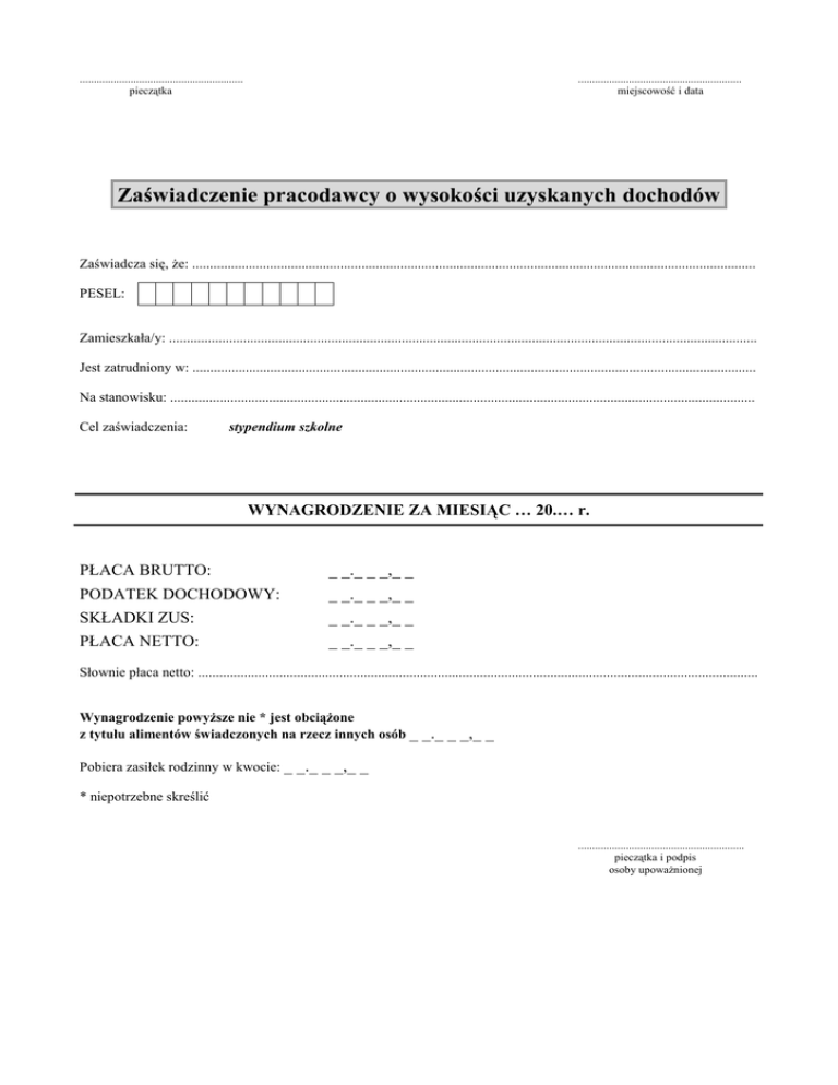 .......................................................... pieczątka .......................................................... miejscowość i data Zaświadczenie pracodawcy o wysokości uzyskanych dochodów Zaświadcza się, Ŝe: ................................................................................................................................................................ PESEL: Zamieszkała/y: ....................................................................................................................................................................... Jest zatrudniony w: ................................................................................................................................................................ Na stanowisku: ...................................................................................................................................................................... Cel zaświadczenia: stypendium szkolne WYNAGRODZENIE ZA MIESIĄC … 20.… r. PŁACA BRUTTO: _ _._ _ _,_ _ PODATEK DOCHODOWY: _ _._ _ _,_ _ SKŁADKI ZUS: _ _._ _ _,_ _ PŁACA NETTO: _ _._ _ _,_ _ Słownie płaca netto: ............................................................................................................................................................... Wynagrodzenie powyŜsze nie * jest obciąŜone z tytułu alimentów świadczonych na rzecz innych osób _ Pobiera zasiłek rodzinny w kwocie: _ _._ _ _,_ _ _._ _ _,_ _ * niepotrzebne skreślić ........................................................... pieczątka i podpis osoby upowaŜnionej