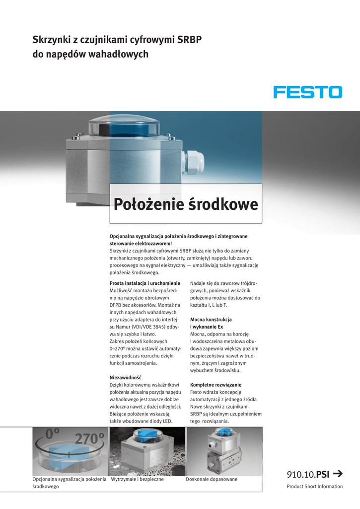 Skrzynki z czujnikami cyfrowymi SRBP do napędów wahadłowych Położenie środkowe Opcjonalna sygnalizacja położenia środkowego i zintegrowane sterowanie elektrozaworem! Skrzynki z czujnikami cyfrowymi SRBP służą nie tylko do zamiany mechanicznego położenia (otwarty, zamknięty) napędu lub zaworu procesowego na sygnał elektryczny — umożliwiają także sygnalizację położenia środkowego. Prosta instalacja i uruchomienie Możliwość montażu bezpośrednio na napędzie obrotowym DFPB bez akcesoriów. Montaż na innych napędach wahadłowych przy użyciu adaptera do interfejsu Namur (VDI/VDE 3845) odbywa się szybko i łatwo. Zakres położeń końcowych 0–270° można ustawić automatycznie podczas rozruchu dzięki funkcji samostrojenia. Niezawodność Dzięki kolorowemu wskaźnikowi położenia aktualna pozycja napędu wahadłowego jest zawsze dobrze widoczna nawet z dużej odległości. Bieżące położenie wskazują także wbudowane diody LED. Opcjonalna sygnalizacja położenia Wytrzymałe i bezpieczne środkowego Nadaje się do zaworow trójdrogowych, ponieważ wskaźnik położenia można dostosować do kształtu I, L lub T. Mocna konstrukcja i wykonanie Ex Mocna, odporna na korozję I wodoszczelna metalowa obudowa zapewnia większy poziom bezpieczeństwa nawet w trudnym, żrącym i zagrożonym wybuchem środowisku. Kompletne rozwiązanie Festo wdraża koncepcję automatyzacji z jednego żródła Nowe skrzynki z czujnikami SRBP są idealnym uzupełnieniem tego rozwiązania. Doskonale dopasowane 910.10.PSI Product Short Information Skrzynki z czujnikami cyfrowymi SRBP do napędów wahadłowych Dane techniczne Zasada pomiaru Zakres pomiarowy Zakres napięcia roboczego Magnetyczny-stykowy 0 do 270° Styk normalnie otwarty 8,2 ... 230 V AC/DC Styk przełączny 15 ... 125V AC/DC Stopień ochrony Ochrona IP65 i IP67 Odporność na korozję CRC 3 Odporność na promieniowanie UV Tak Mechaniczny wskaźnik położenia W kombinacji trzech kolorów: - Niebieski/czarny - Żółty/czarny - Zielony/czerwony Temperatura otoczenia -20 do +80 °C ATEX Ex II 3 GD Histereza 3° ≤ x ≤ 6° Podłączenie kablem M20 x 1,5 do strefy bez zagrożenia i z zagrożeniem wybuchem Dostępne także z wbudowanym obwodem rezystancyjnym do monitorowania przewodów pod kątem przerwania z obwodem wejściowym do czujników o konstrukcji zgodnej z normą EN 60947-5-6 (NAMUR). Położenia końcowe z automatyczną kompensacją Śruby zabezpieczone przed zgubieniem, posiadające oznaczenie typu. 120 94.9 74.17 82 94 120 Idealne do rozwiązań systemowych: wszystko z jednego źródła. Skrzynki z czujnikami SRBP to jeden z elementów optymalnej automatyzacji procesów. Festo oferuje pełną gamę produktów do automatyzacji procesów — od poziomu zarządzania do poziomu sterowania, czujników, siłowników i elementów na obiekcie. Doskonałe uzupełnienie do wszystkich obecnie stosowanych napędów wahadłowych — zwłaszcza DFPB. Festo Sp. z o.o. Janki k/Warszawy ul. Mszczonowska 7 05-090 Raszyn Contact Center tel. +48 22 711 41 00 fax +48 22 711 41 02 [email protected] www.festo.pl Zastrzega się możliwość zmian 27 Osprzęt 1. Adaptery montażowe do napędów wahadłowych zgodnie z normą VDI/VDE 3845 (NAMUR): a. Układ otworow 30 x 80 mm na wysokości wału 20 mm b. Układ otworow 30 x 130 mm na wysokości wału 50 mm c. Układ otworow 30 x 80 mm na wysokości wału 30 mm d. Układ otworow 30 x 130 mm na wysokości wału 30 mm 2. Metryczne złącze kablowe: a. M20 x 1,5, polimerowe b. M20 x 1,5, metalowe 3. Gniazda wtykowe i gniazda wtykowe z kablem do elektrozaworów. 03/2011 102.75 Wymiary