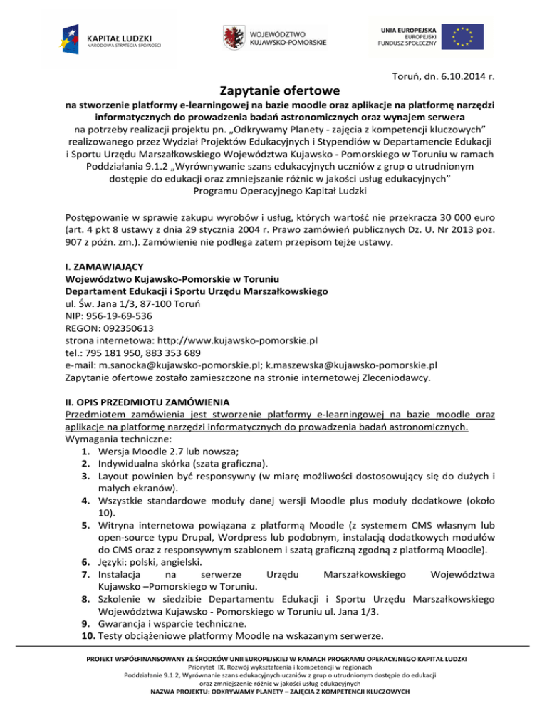 Toruń, dn. 6.10.2014 r. Zapytanie ofertowe na stworzenie platformy e-learningowej na bazie moodle oraz aplikacje na platformę narzędzi informatycznych do prowadzenia badań astronomicznych oraz wynajem serwera na potrzeby realizacji projektu pn. „Odkrywamy Planety - zajęcia z kompetencji kluczowych” realizowanego przez Wydział Projektów Edukacyjnych i Stypendiów w Departamencie Edukacji i Sportu Urzędu Marszałkowskiego Województwa Kujawsko - Pomorskiego w Toruniu w ramach Poddziałania 9.1.2 „Wyrównywanie szans edukacyjnych uczniów z grup o utrudnionym dostępie do edukacji oraz zmniejszanie różnic w jakości usług edukacyjnych” Programu Operacyjnego Kapitał Ludzki Postępowanie w sprawie zakupu wyrobów i usług, których wartość nie przekracza 30 000 euro (art. 4 pkt 8 ustawy z dnia 29 stycznia 2004 r. Prawo zamówień publicznych Dz. U. Nr 2013 poz. 907 z późn. zm.). Zamówienie nie podlega zatem przepisom tejże ustawy. I. ZAMAWIAJĄCY Województwo Kujawsko-Pomorskie w Toruniu Departament Edukacji i Sportu Urzędu Marszałkowskiego ul. Św. Jana 1/3, 87-100 Toruń NIP: 956-19-69-536 REGON: 092350613 strona internetowa: http://www.kujawsko-pomorskie.pl tel.: 795 181 950, 883 353 689 e-mail: [email protected]; [email protected] Zapytanie ofertowe zostało zamieszczone na stronie internetowej Zleceniodawcy. II. OPIS PRZEDMIOTU ZAMÓWIENIA Przedmiotem zamówienia jest stworzenie platformy e-learningowej na bazie moodle oraz aplikacje na platformę narzędzi informatycznych do prowadzenia badań astronomicznych. Wymagania techniczne: 1. Wersja Moodle 2.7 lub nowsza; 2. Indywidualna skórka (szata graficzna). 3. Layout powinien być responsywny (w miarę możliwości dostosowujący się do dużych i małych ekranów). 4. Wszystkie standardowe moduły danej wersji Moodle plus moduły dodatkowe (około 10). 5. Witryna internetowa powiązana z platformą Moodle (z systemem CMS własnym lub open-source typu Drupal, Wordpress lub podobnym, instalacją dodatkowych modułów do CMS oraz z responsywnym szablonem i szatą graficzną zgodną z platformą Moodle). 6. Języki: polski, angielski. 7. Instalacja na serwerze Urzędu Marszałkowskiego Województwa Kujawsko –Pomorskiego w Toruniu. 8. Szkolenie w siedzibie Departamentu Edukacji i Sportu Urzędu Marszałkowskiego Województwa Kujawsko - Pomorskiego w Toruniu ul. Jana 1/3. 9. Gwarancja i wsparcie techniczne. 10. Testy obciążeniowe platformy Moodle na wskazanym serwerze. PROJEKT WSPÓŁFINANSOWANY ZE ŚRODKÓW UNII EUROPEJSKIEJ W RAMACH PROGRAMU OPERACYJNEGO KAPITAŁ LUDZKI Priorytet IX, Rozwój wykształcenia i kompetencji w regionach Poddziałanie 9.1.2, Wyrównanie szans edukacyjnych uczniów z grup o utrudnionym dostępie do edukacji oraz zmniejszenie różnic w jakości usług edukacyjnych NAZWA PROJEKTU: ODKRYWAMY PLANETY – ZAJĘCIA Z KOMPETENCJI KLUCZOWYCH 11. Platforma powinna obsłużyć do 1000 użytkowników i mieć możliwość zwiększenia tej liczby w przyszłości. 12. Platforma musi być dostosowana funkcjonalnie także do urządzeń mobilnych. 13. Opcjonalne dodatkowe funkcjonalności: forum, czat, blogi, platforma mailingowa. Ponadto wykonawca będzie zobowiązany zapewnić wsparcie techniczne (w czasie reakcji trzech dni) w okresie od momentu utworzenia platformy do końca maja 2015 roku. Przedmiotem zamówienia jest również wynajem serwera w miesiącach październik - maj Minimalne wymagania techniczne serwera dla Moodle 2.7: Software: Apache (możliwe inne oprogramowanie serwera, ale zalecane jest to) PHP 5.4.4 lub nowsze Baza danych: PostgreSQL 9.1 lub MySQL 5.5.31 (lub ich nowsze wersje) Hardware: Przestrzeń dyskowa: 160 MB do instalacji plus minimum 5 GB na przechowywanie danych Procesor: minimum 1 GHz (rekomendowane 2 GHz dual core) Pamięć: minimum 256 MB, rekomendowane 1 GB Regularne kopie zapasowe III. TERMIN WYKONANIA ZAMÓWIENIA Zamówienie powinno zostać zrealizowane do 4 tygodni od dnia podpisania umowy. IV. OPIS KRYTERIÓW, KTÓRYMI ZAMAWIAJĄCY BĘDZIE SIĘ KIEROWAŁ PRZY WYBORZE OFERTY, WRAZ Z PODANIEM ZNACZENIA TYCH KRYTERIÓW Złożona oferta będzie rozpatrywana przez Zleceniodawcę przy zastosowaniu następujących kryteriów oceny: najniższa cena brutto - 100% V. 1. 2. 3. 4. OPIS SPOSOBU PRZYGOTOWYWANIA OFERT Każdy Zleceniobiorca może złożyć tylko jedną ofertę. Zleceniodawca nie dopuszcza składania ofert częściowych ani wariantowych. Zleceniodawca nie przewiduje udzielenia zamówień uzupełniających i dodatkowych. Zamawiający nie dopuszcza możliwości powierzenia części lub całości zamówienia podwykonawcom. 5. Postępowanie odbywa się w języku polskim, w związku z czym wszelkie pisma, dokumenty, oświadczenia składane w trakcie postępowania między Zleceniodawcą a Zleceniobiorcą muszą być sporządzone w języku polskim. Dokumenty sporządzone w języku obcym są składane wraz z tłumaczeniem na język polski. 6. Oferta winna być napisana czytelnie w języku polskim i podpisana przez osobę uprawnioną do występowania w imieniu wykonawcy oraz opieczętowana. 7. Wszelkie koszty związane ze złożeniem oferty ponosi Zleceniobiorca. 8. Ewentualne poprawki powinny być naniesione czytelnie oraz opatrzone podpisem osoby uprawnionej. 9. W przypadku Zleceniobiorców wspólnie ubiegających się o zamówienie ofertę podpisuje PROJEKT WSPÓŁFINANSOWANY ZE ŚRODKÓW UNII EUROPEJSKIEJ W RAMACH PROGRAMU OPERACYJNEGO KAPITAŁ LUDZKI Priorytet IX, Rozwój wykształcenia i kompetencji w regionach Poddziałanie 9.1.2, Wyrównanie szans edukacyjnych uczniów z grup o utrudnionym dostępie do edukacji oraz zmniejszenie różnic w jakości usług edukacyjnych NAZWA PROJEKTU: ODKRYWAMY PLANETY – ZAJĘCIA Z KOMPETENCJI KLUCZOWYCH osoba umocowana do tej czynności prawnej, co powinno wynikać z dokumentów (Pełnomocnictwa) załączonych do oferty. 10. Oferta winna zostać sporządzona zgodnie ze wzorem załączonym do niniejszego zapytania ofertowego -