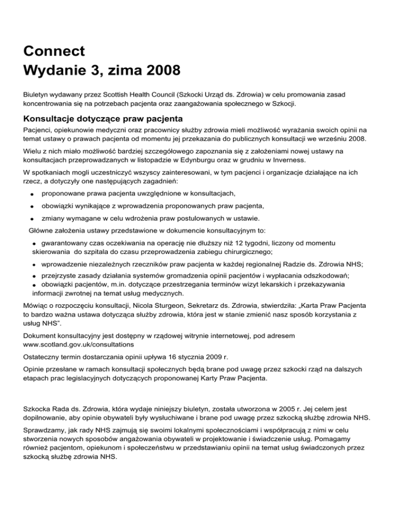 Connect Wydanie 3, zima 2008 Biuletyn wydawany przez Scottish Health Council (Szkocki Urząd ds. Zdrowia) w celu promowania zasad koncentrowania się na potrzebach pacjenta oraz zaangażowania społecznego w Szkocji. Konsultacje dotyczące praw pacjenta Pacjenci, opiekunowie medyczni oraz pracownicy służby zdrowia mieli możliwość wyrażania swoich opinii na temat ustawy o prawach pacjenta od momentu jej przekazania do publicznych konsultacji we wrześniu 2008. Wielu z nich miało możliwość bardziej szczegółowego zapoznania się z założeniami nowej ustawy na konsultacjach przeprowadzanych w listopadzie w Edynburgu oraz w grudniu w Inverness. W spotkaniach mogli uczestniczyć wszyscy zainteresowani, w tym pacjenci i organizacje działające na ich rzecz, a dotyczyły one następujących zagadnień: • proponowane prawa pacjenta uwzględnione w konsultacjach, • obowiązki wynikające z wprowadzenia proponowanych praw pacjenta, • zmiany wymagane w celu wdrożenia praw postulowanych w ustawie. Główne założenia ustawy przedstawione w dokumencie konsultacyjnym to: • gwarantowany czas oczekiwania na operację nie dłuższy niż 12 tygodni, liczony od momentu skierowania do szpitala do czasu przeprowadzenia zabiegu chirurgicznego; • wprowadzenie niezależnych rzeczników praw pacjenta w każdej regionalnej Radzie ds. Zdrowia NHS; • przejrzyste zasady działania systemów gromadzenia opinii pacjentów i wypłacania odszkodowań; • obowiązki pacjentów, m.in. dotyczące przestrzegania terminów wizyt lekarskich i przekazywania informacji zwrotnej na temat usług medycznych. Mówiąc o rozpoczęciu konsultacji, Nicola Sturgeon, Sekretarz ds. Zdrowia, stwierdziła: „Karta Praw Pacjenta to bardzo ważna ustawa dotycząca służby zdrowia, która jest w stanie zmienić nasz sposób korzystania z usług NHS”. Dokument konsultacyjny jest dostępny w rządowej witrynie internetowej, pod adresem www.scotland.gov.uk/consultations Ostateczny termin dostarczania opinii upływa 16 stycznia 2009 r. Opinie przesłane w ramach konsultacji społecznych będą brane pod uwagę przez szkocki rząd na dalszych etapach prac legislacyjnych dotyczących proponowanej Karty Praw Pacjenta. Szkocka Rada ds. Zdrowia, która wydaje niniejszy biuletyn, została utworzona w 2005 r. Jej celem jest dopilnowanie, aby opinie obywateli były wysłuchiwane i brane pod uwagę przez szkocką służbę zdrowia NHS. Sprawdzamy, jak rady NHS zajmują się swoimi lokalnymi społecznościami i współpracują z nimi w celu stworzenia nowych sposobów angażowania obywateli w projektowanie i świadczenie usług. Pomagamy również pacjentom, opiekunom i społeczeństwu w przedstawianiu opinii na temat usług świadczonych przez szkocką służbę zdrowia NHS. Nasza siedziba mieści się w Glasgow. Mamy 14 biur lokalnych, z których każde współpracuje z zespołem ochotniczych Lokalnych Rad Doradczych pomagającym nam ocenić, jak miejscowe rady NHS współpracują z lokalną ludnością. Szczegółowe dane kontaktowe każdego biura można znaleźć na ostatniej stronie biuletynu. Dostępność lekarzy pierwszego kontaktu Szkocka NHS zorganizowała wśród pacjentów ogólnokrajową ankietę umożliwiającą sprawdzenie poziomu dostępności lekarzy i pielęgniarek w lokalnych przychodniach rodzinnych. 2-stronicowa ankieta GP Access Survey została wysłana do 543 000 losowo wybranych osób, które zarejestrowały się w przychodniach rodzinnych na terenie Szkocji. Celem ankiety jest sprawdzenie, w jakim stopniu pacjenci mają możliwość spotkania się lub skonsultowania z lekarzem pierwszego kontaktu lub pielęgniarką w przeciągu dwóch dni w przypadkach wymagających szybkiej konsultacji medycznej, a także sprawdzenie możliwości zarejestrowania się na wizytę lekarską z ponad dwudniowym wyprzedzeniem. Nicola Sturgeon, Sekretarz ds. Zdrowia, stwierdziła: „Dostęp do opieki medycznej i możliwość konsultacji lekarskiej, gdy zachodzi taka potrzeba, stanowi podstawową zasadę działania Narodowej Służby Zdrowia”. „Na terenie całej Szkocji przychodnie rodzinne i indywidualne praktyki lekarskie dokładają wszelkich starań, aby spełniać wymagania w zakresie opieki lekarskiej i usług medycznych, zapewniając lepszy dostęp do placówek rodzinnych, przychodni lekarskich i personelu medycznego. Dotyczy to także zapewniania szybkiej konsultacji lekarskiej oraz takiego planowania terminów wizyt, aby nie kolidowały one z codziennymi zadaniami i zobowiązaniami pacjentów”. „Ważne jest również to, aby przychodnie rodzinne oraz lekarze otrzymywali informacje zwrotne od pacjentów na temat dostępności usług medycznych, co umożliwi wprowadzenie koniecznych usprawnień. Ta ogólnokrajowa, ujednolicona ankieta da nam szansę na uzyskanie po pierwszy pełnego obrazu podstawowej służby zdrowia”. „Wierzę, że będzie ona niezwykle przydatnym narzędziem, dzięki któremu pacjenci i ich opinie staną się znów podstawą planowania, opracowywania i świadczenia usług medycznych w Szkocji. Z góry dziękuję wszystkim pacjentom, którzy poświęcą swój czas i wezmą udział w ankiecie”. W reakcji na informacje o ankiecie dr Dean Marshall, przewodniczący Komitetu Lekarzy Pierwszego Kontaktu (Scottish General Practitioners Committee) Brytyjskiego Towarzystwa Medycznego (BMA), stwierdził: „Ankieta umożliwi pacjentom wyrażenie opinii o poziomie dostępności usług pierwszego kontaktu na terenie Szkocji. Umożliwi także sprawdzenie, w jakim stopniu gabinety lekarskie radzą sobie z wymaganiami dotyczącymi szybkiego dostępu do usług i rejestracji pacjentów”. „Wiemy, jak ważna jest praca lekarzy pierwszego kontaktu NHS, i mam nadzieję, że ta ankieta wykaże, jak wielki wysiłek wkładają oni w zapewnienie dobrej opieki medycznej swoim pacjentom”. Wyniki ogólnokrajowej ankiety zostaną opublikowane przez szkocki rząd latem przyszłego roku, a informacje dotycz