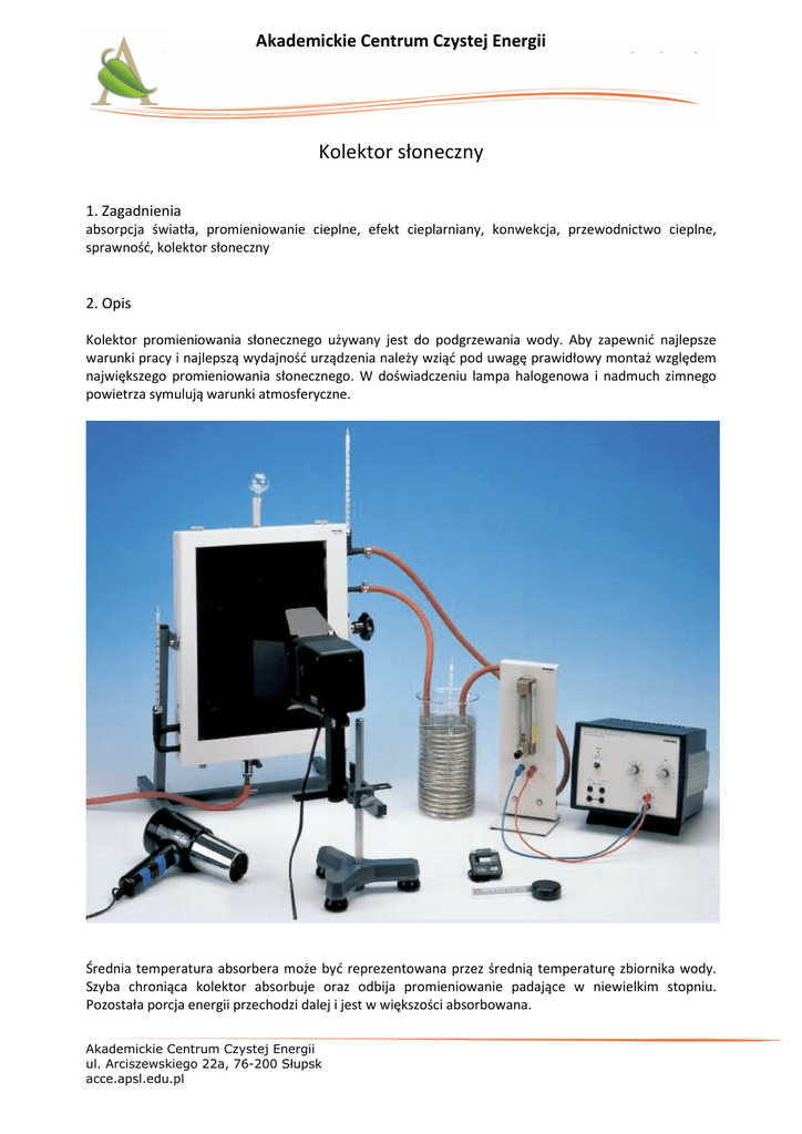Akademickie Centrum Czystej Energii Kolektor słoneczny 1. Zagadnienia absorpcja światła, promieniowanie cieplne, efekt cieplarniany, konwekcja, przewodnictwo cieplne, sprawność, kolektor słoneczny 2. Opis Kolektor promieniowania słonecznego używany jest do podgrzewania wody. Aby zapewnić najlepsze warunki pracy i najlepszą wydajność urządzenia należy wziąć pod uwagę prawidłowy montaż względem największego promieniowania słonecznego. W doświadczeniu lampa halogenowa i nadmuch zimnego powietrza symulują warunki atmosferyczne. Średnia temperatura absorbera może być reprezentowana przez średnią temperaturę zbiornika wody. Szyba chroniąca kolektor absorbuje oraz odbija promieniowanie padające w niewielkim stopniu. Pozostała porcja energii przechodzi dalej i jest w większości absorbowana. Akademickie Centrum Czystej Energii ul. Arciszewskiego 22a, 76-200 Słupsk acce.apsl.edu.pl Akademickie Centrum Czystej Energii Ilość energii promieniowania zaabsorbowana i zamieniona na ciepło przez absorber w jednostce czasu i przypadająca na jednostkę powierzchni można wyrazić za pomocą wzoru: q a = α ⋅τ ⋅ qi (1) qi – natężenie światła padające na powierzchnię kolektora; α – współczynnik absorpcji absorbera; τ – współczynnik transmisji szkła. Energia promieniowania zamieniona na ciepło nie jest całkowicie wykorzystana. Część z niej jest tracona przez radiację, konwekcję lub przewodzenie ciepła. Energia użyteczna generowana w jednostce czasu i jednostkę powierzchni równa się (2) q N = q a − q l − q st ql – energia stracona J/s m2 qst – zmagazynowana energia J/s m2 w warunkach laboratoryjnych qst ≈ 0. Straty ciepła absorbera są tym większe im większa jest jego temperatura. Tylna izolacja odpowiedzialna jest za straty energii na skutek przenikania ciepła natomiast frontowa część za straty radiacyjne i konwekcji. Wszystkie te straty można wyrazić formułą: q l = k ⋅ (θ Ab − θ Am ) (3) k – współczynnik transmisji θAb – temperatura absorbera θAm – temperatura otoczenia Stosunek energii użytecznej do energii padającej pozwala wyznaczyć sprawność kolektora słonecznego: η= qN k ⋅ (θ Ab − θ Am ) = ατ − qi qi (4) Temperatura absorbera nie jest znana. Mierzone są temperatury na wejściu i wyjściu z kolektora θin i θout. Równanie 4 nie bierze pod uwagę transferu ciepła z absorbera do wody. Uwzględniając współczynnik sprawności absorbera można zapisać równanie 4 w postaci: η = f ⋅ ατ − gdzie: θ W = k ⋅ (θ W − θ Am ) qi (5) θ in + θ out (6) 2 Moc użyteczna może być wyznaczona w stanie równowagi termodynamicznej strumienia przepływającej wody o znanym cieple właściwym c: (7) PU = c ⋅ m& (θ out − θ in ) m& = 100 g ; min c = 4190 J ; kg ⋅ K Moc jednostkowa padająca na kolektor o powierzchni absorbera A = 0,12 m2 ustawiony 70 cm od lampy halogenowej można przyjąć równą qi = 1 kW/m2. Sprawność kolektora można obliczyć z zależności: η= PU qi ⋅ A Akademickie Centrum Czystej Energii ul. Arciszewskiego 22a, 76-200 Słupsk acce.apsl.edu.pl (8) Akademickie Centrum Czystej Energii W przypadku, gdy kolektor zostanie ochłodzony poniżej temperatury otoczenia energia może być pobierana z otoczenia nawet, gdy lampa halogenowa jest wyłączona. Absorber, który nie jest izolowany jest bardziej efektywny. Porównując współczynnik wydajności dla kolektora pracującego w temperaturze pokojowej z i bez ochrony szklanej można wyznaczyć współczynnik transmisji dla szkła τ na podstawie wzoru 5. Straty do otoczenia w tym wypadku można zaniedbać. η1 = f ⋅ α ⋅ τ Ze szkłem η2 = f ⋅ α bez szkła η τ= 1 η2 3. Doświadczenie Kolektor słoneczny oświetlany jest lampą halogenową o znanym natężeniu światła. Energia zaabsorbowana przez kolektor może być obliczona na podstawie znajomości strumienia przepływającej przez kolektor wody jak również znając różnicę temperatur wody na wejściu i wyjściu z kolektora (równanie 7). Dzięki temu można wyznaczyć także współczynnik sprawności konwersji energii (równanie 8). Temperatura wody w zbiorniku mierzona jest za pomocą termometru zanurzonego w wodzie, natomiast temperatury na wejściu i wyjściu z kolektora w odpowiednich gniazdach z uszczelkami. Temperatury początkowe na obu termometrach kolektora powinny być takie same. W przeciwnym wypadku należy przy obliczeniach wziąć pod uwagę różnicę we wskazaniach termometrów. Strumień wody przepływający przez kolektor, wymiennik ciepła i przepływomierz wymuszony jest przez pompkę wodną zasilaną prądem stałym o napięciu w przedziale 3 ÷ 6 V. 1000 W lampa halogenowa zapewnia jednolite, powtarzalne oświetlenie przy prostopadłym ustawieniu lampy. W odległości 70 cm natężenie oświetlenia wynosi w przybliżeniu 1 kW/m2. Wymiennik ciepła wstawiony jest do zbiornika wypełnionego wodą. Zawór przepływomierza powinien być maksymalnie otwarty na początku każdej serii pomiarowej, aby zapewnić maksymalny przepływ strumienia wody i taką samą temperaturę w każdym miejscu układu równą temperaturze wody w zbiorniku. Dla każdej serii pomiarowej należy ustawić przepływ równy 100 cm3/min. Pomiary temperatur powinny odbywać się co 1 min. Po około 10 min temperatury na wejściu i wyjściu z kolektora powinny być stałe. A. Absorpcja promieniowania z lampą halogenową. 4,5 L wody o temperaturze pokojowej nalewamy do zbiornika 5 L i wkładamy tam wymiennik. Lampę ustawiamy w odległości 70 cm od kolektora. Wykonujemy dwie serie pomiarowe: dla całego kolektora i kolektora bez osłony szklanej. Doświadczenie można wykonać również z zimnym nawiewem powietrza. W takim przypadku wodę w zbiorniku podgrzewamy do temperatury 60 °C, lampę ustawiamy w odległości 70 cm, a strumień zimnego powietrza nakierowujemy na kolektor z boku pod kątem 30°. Akademickie Centrum Czystej Energii ul. 