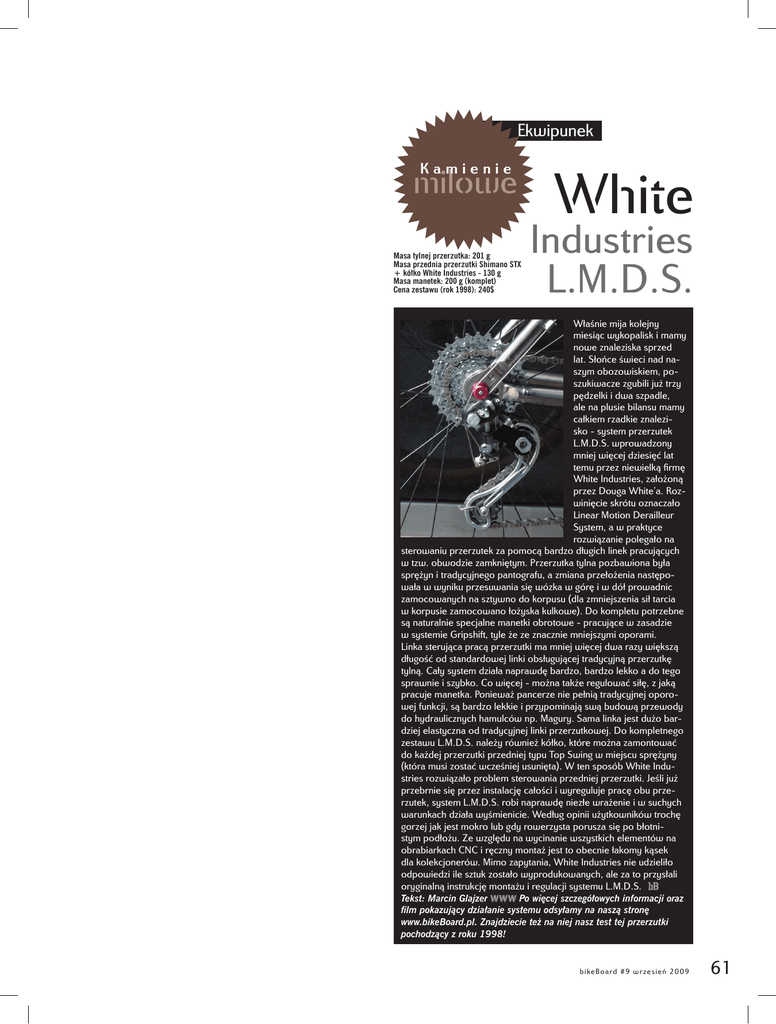 Ekwipunek Kamienie milowe Masa tylnej przerzutka: 201 g Masa przednia przerzutki Shimano STX + kółko White Industries - 130 g Masa manetek: 200 g (komplet) Cena zestawu (rok 1998): 240$ White Industries L.M.D.S. Właśnie mija kolejny miesiąc wykopalisk i mamy nowe znaleziska sprzed lat. Słońce świeci nad naszym obozowiskiem, poszukiwacze zgubili już trzy pędzelki i dwa szpadle, ale na plusie bilansu mamy całkiem rzadkie znalezisko - system przerzutek L.M.D.S. wprowadzony mniej więcej dziesięć lat temu przez niewielką firmę White Industries, założoną przez Douga White’a. Rozwinięcie skrótu oznaczało Linear Motion Derailleur System, a w praktyce rozwiązanie polegało na sterowaniu przerzutek za pomocą bardzo długich linek pracujących w tzw. obwodzie zamkniętym. Przerzutka tylna pozbawiona była sprężyn i tradycyjnego pantografu, a zmiana przełożenia następowała w wyniku przesuwania się wózka w górę i w dół prowadnic zamocowanych na sztywno do korpusu (dla zmniejszenia sił tarcia w korpusie zamocowano łożyska kulkowe). Do kompletu potrzebne są naturalnie specjalne manetki obrotowe - pracujące w zasadzie w systemie Gripshift, tyle że ze znacznie mniejszymi oporami. Linka sterująca pracą przerzutki ma mniej więcej dwa razy większą długość od standardowej linki obsługującej tradycyjną przerzutkę tylną. Cały system działa naprawdę bardzo, bardzo lekko a do tego sprawnie i szybko. Co więcej - można także regulować siłę, z jaką pracuje manetka. Ponieważ pancerze nie pełnią tradycyjnej oporowej funkcji, są bardzo lekkie i przypominają swą budową przewody do hydraulicznych hamulców np. Magury. Sama linka jest dużo bardziej elastyczna od tradycyjnej linki przerzutkowej. Do kompletnego zestawu L.M.D.S. należy również kółko, które można zamontować do każdej przerzutki przedniej typu Top Swing w miejscu sprężyny (która musi zostać wcześniej usunięta). W ten sposób White Industries rozwiązało problem sterowania przedniej przerzutki. Jeśli już przebrnie się przez instalację całości i wyreguluje pracę obu przerzutek, system L.M.D.S. robi naprawdę niezłe wrażenie i w suchych warunkach działa wyśmienicie. Według opinii użytkowników trochę gorzej jak jest mokro lub gdy rowerzysta porusza się po błotnistym podłożu. Ze względu na wycinanie wszystkich elementów na obrabiarkach CNC i ręczny montaż jest to obecnie łakomy kąsek dla kolekcjonerów. Mimo zapytania, White Industries nie udzieliło odpowiedzi ile sztuk zostało wyprodukowanych, ale za to przysłali oryginalną instrukcję montażu i regulacji systemu L.M.D.S. Tekst: Marcin Glajzer Po więcej szczegółowych informacji oraz film pokazujący działanie systemu odsyłamy na naszą stronę www.bikeBoard.pl. Znajdziecie też na niej nasz test tej przerzutki pochodzący z roku 1998! bi ke Boa r d # 9 wr zes i eń 2 0 0 9 61