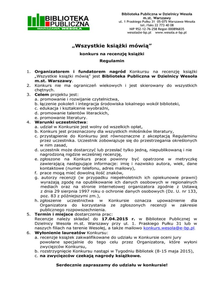 Biblioteka Publiczna w Dzielnicy Wesoła m.st. Warszawy ul. 1 Praskiego Pułku 31 05-075 Warszawa-Wesoła tel./faks 22 773 40 08 NIP 952-12-76-258 Regon 000896835 [email protected] www.wesola.e-bp.pl „Wszystkie książki mówią” konkurs na recenzję książki Regulamin 1. Organizatorem i fundatorem nagród Konkursu na recenzję książki „Wszystkie książki mówią” jest Biblioteka Publiczna w Dzielnicy Wesoła m.st. Warszawy. 2. Konkurs nie ma ograniczeń wiekowych i jest skierowany do wszystkich chętnych. 3. Celem projektu jest: a. promowanie i rozwijanie czytelnictwa, b. łączenie pokoleń i integracja środowiska lokalnego wokół biblioteki, c. edukacja i kształcenie wyobraźni, d. promowanie talentów literackich, e. promowanie literatury. 4. Warunki uczestnictwa: a. udział w Konkursie jest wolny od wszelkich opłat, b. Konkurs jest przeznaczony dla wszystkich miłośników literatury, c. przystąpienie do Konkursu jest równoznaczne z akceptacją Regulaminu przez uczestnika. Uczestnik zobowiązuje się do przestrzegania określonych w nim zasad, d. uczestnik może dostarczyć lub przesłać tylko jedną, niepublikowaną i nie nagrodzoną nigdzie wcześniej recenzję, e. zgłoszone na Konkurs prace powinny być opatrzone w metryczkę zawierającą następujące informacje: imię i nazwisko autora, wiek, dane kontaktowe (numer telefonu, adres mailowy), f. prace mogą mieć dowolną ilość znaków, g. autorzy recenzji (w przypadku niepełnoletnich ich opiekunowie prawni) wyrażają zgodę na opublikowanie ich danych osobowych w regionalnych mediach oraz na stronie internetowej organizatora zgodnie z Ustawą z dnia 29 sierpnia 1997 roku o ochronie danych osobowych (Dz. U. nr 133, poz. 83 z późniejszymi zm.), h. zgłoszenie uczestnictwa w Konkursie oznacza upoważnienie dla Organizatora do korzystania ze zgłoszonych recenzji w zakresie publicznego rozpowszechnienia. 5. Termin i miejsce dostarczenia prac: Recenzje należy składać do 17.04.2015 r. w Bibliotece Publicznej w Dzielnicy Wesoła m.st. Warszawy przy ul. 1. Praskiego Pułku 31 lub w naszych filiach na terenie Wesołej, a także mailowo [email protected]. 6. Wyłonienie laureatów Konkursu: a. recenzje książek zakwalifikowane do udziału w Konkursie oceni jury powołane specjalnie do tego celu przez Organizatora, które wyłoni zwycięzców Konkursu, b. rozstrzygnięcie Konkursu nastąpi w Tygodniu Bibliotek (8-15 maja 2015), c. na zwycięzców czekają nagrody książkowe. Serdecznie zapraszamy do udziału w konkursie!