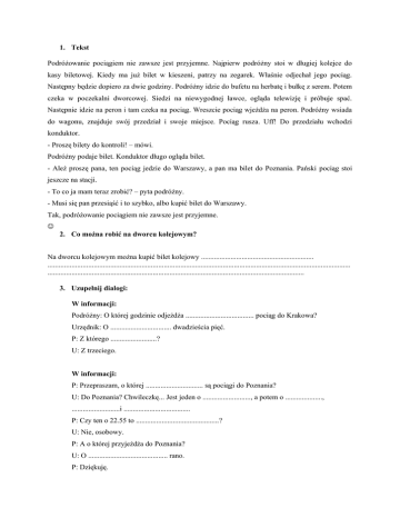 1. Tekst Podróżowanie pociągiem nie zawsze jest przyjemne. Najpierw podróżny stoi w długiej kolejce do kasy biletowej. Kiedy ma już bilet w kieszeni, patrzy na zegarek. Właśnie odjechał jego pociąg. Następny będzie dopiero za dwie godziny. Podróżny idzie do bufetu na herbatę i bułkę z serem. Potem czeka w poczekalni dworcowej. Siedzi na niewygodnej ławce, ogląda telewizję i próbuje spać. Następnie idzie na peron i tam czeka na pociąg. Wreszcie pociąg wjeżdża na peron. Podróżny wsiada do wagonu, znajduje swój przedział i swoje miejsce. Pociąg rusza. Uff! Do przedziału wchodzi konduktor. - Proszę bilety do kontroli! – mówi. Podróżny podaje bilet. Konduktor długo ogląda bilet. - Ależ proszę pana, ten pociąg jedzie do Warszawy, a pan ma bilet do Poznania. Pański pociąg stoi jeszcze na stacji. - To co ja mam teraz zrobić? – pyta podróżny. - Musi się pan przesiąść i to szybko, albo kupić bilet do Warszawy. Tak, podróżowanie pociągiem nie zawsze jest przyjemne. 2. Co można robić na dworcu kolejowym? Na dworcu kolejowym można kupić bilet kolejowy ............................................................. .................................................................................................................................................................... ........................................................................................................................................... 3. Uzupełnij dialogi: W informacji: Podróżny: O której godzinie odjeżdża ..................................... pociąg do Krakowa? Urzędnik: O ................................. dwadzieścia pięć. P: Z którego .........................? U: Z trzeciego. W informacji: P: Przepraszam, o której ............................... są pociągi do Poznania? U: Do Poznania? Chwileczkę... Jest jeden o .........................., a potem o ...................., ..........................i .................................... P: Czy ten o 22.55 to .............................................? U: Nie, osobowy. P: A o której przyjeżdża do Poznania? U: O ........................................... rano. P: Dziękuję. W kasie: P: Proszę ................................. do Katowic, druga ....................................., dla niepalących. W kasie: P: Proszę bilet na ...................................... do Warszawy na jutro, na 6.40, pierwsza klasa. Kasjerka: Normalny? P: Nie, ........................................... Jestem studentem. W przedziale: Konduktor: Dzień dobry. ....................................................../ Proszę bilety do kontroli. Student: Proszę. K: A legitymacja? S: Proszę. ........................... mam. K: Dziękuję. Do widzenia. S: Przepraszam, mam jeszcze ................................ Czy ten pociąg jest opóźniony, czy przyjedziemy ............................................? K: Nie mamy ................................................., będziemy na miejscu według planu. S: Dziękuję. Proszę bilety do kontroli! Leszek: Gdzie ................................? Alicja: Obok okna Leszek: To ja ........................................ ciebie. Alicja: Czy mogę tu ......................................? Leszek: Nie, to jest przedział dla niepalących. Alicja: Szkoda… (pociąg rusza) Leszek: No, to jedziemy do Krakowa! Alicja: ..................................... to miasto? Leszek: Bardzo, słyszałem, że ma ............................................ rynek w Europie. Kontroler: Proszę bilety do kontroli! Alicja: Gdzie ja mam bilet? Leszek: Nie ......................................................., musisz przede wszystkim zajrzeć do kieszeni. 4. Podaj antonimy (wyrazy o znaczeniu przeciwnym) do podanych określeń: Wzór: długa podróż – krótka podróż 1. Wolne miejsce - .............................................................miejsce 2. Normalny bilet/cały bilet - .............................................bilet 3. Duży ruch - .....................................................................ruch 4. Pusty przedział - .............................................................przedział 5. Punktualny pociąg - ........................................................pociąg 6. Wygodna podróż - ..........................................................podróż Zadanie domowe: Jak według ciebie będzie wyglądać superluksusowy pociąg przyszłości?