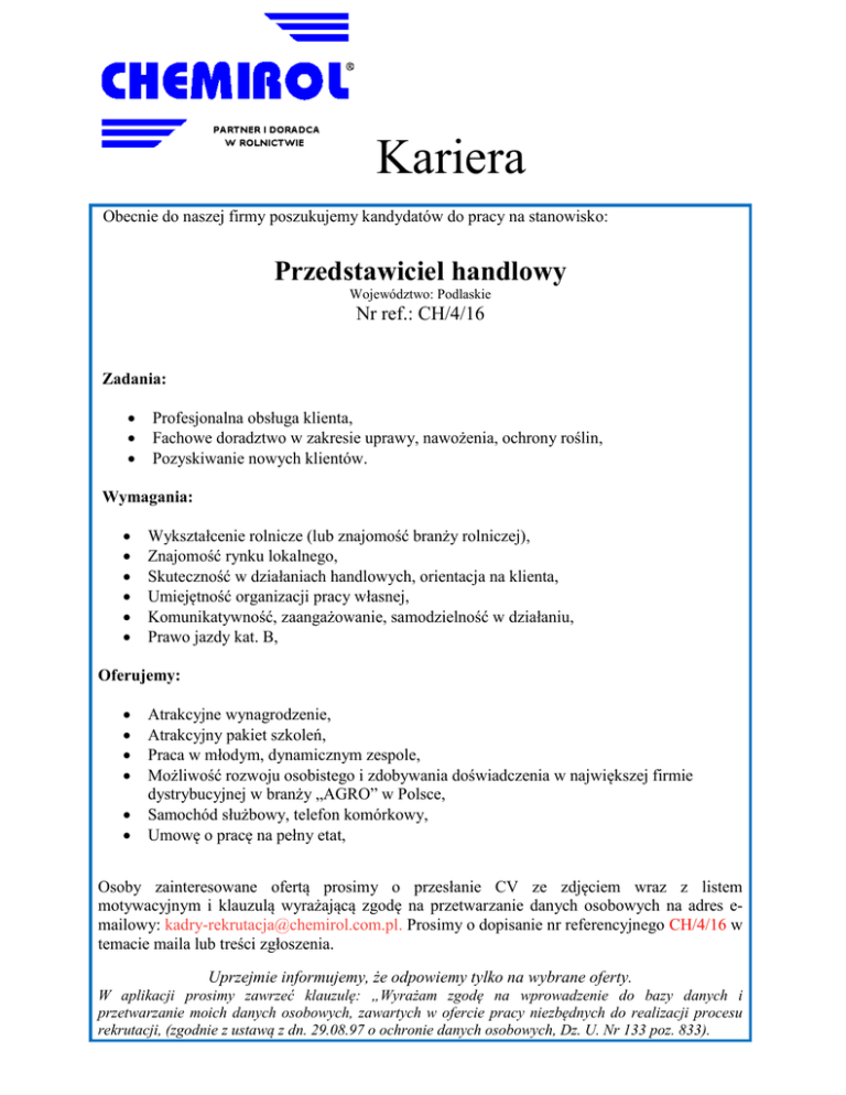 Kariera Obecnie do naszej firmy poszukujemy kandydatów do pracy na stanowisko: Przedstawiciel handlowy Województwo: Podlaskie Nr ref.: CH/4/16 Zadania: Profesjonalna obsługa klienta, Fachowe doradztwo w zakresie uprawy, nawożenia, ochrony roślin, Pozyskiwanie nowych klientów. Wymagania: Wykształcenie rolnicze (lub znajomość branży rolniczej), Znajomość rynku lokalnego, Skuteczność w działaniach handlowych, orientacja na klienta, Umiejętność organizacji pracy własnej, Komunikatywność, zaangażowanie, samodzielność w działaniu, Prawo jazdy kat. B, Oferujemy: Atrakcyjne wynagrodzenie, Atrakcyjny pakiet szkoleń, Praca w młodym, dynamicznym zespole, Możliwość rozwoju osobistego i zdobywania doświadczenia w największej firmie dystrybucyjnej w branży „AGRO” w Polsce, Samochód służbowy, telefon komórkowy, Umowę o pracę na pełny etat, Osoby zainteresowane ofertą prosimy o przesłanie CV ze zdjęciem wraz z listem motywacyjnym i klauzulą wyrażającą zgodę na przetwarzanie danych osobowych na adres emailowy: [email protected]. Prosimy o dopisanie nr referencyjnego CH/4/16 w temacie maila lub treści zgłoszenia. Uprzejmie informujemy, że odpowiemy tylko na wybrane oferty. W aplikacji prosimy zawrzeć klauzulę: „Wyrażam zgodę na wprowadzenie do bazy danych i przetwarzanie moich danych osobowych, zawartych w ofercie pracy niezbędnych do realizacji procesu rekrutacji, (zgodnie z ustawą z dn. 29.08.97 o ochronie danych osobowych, Dz. U. Nr 133 poz. 833).