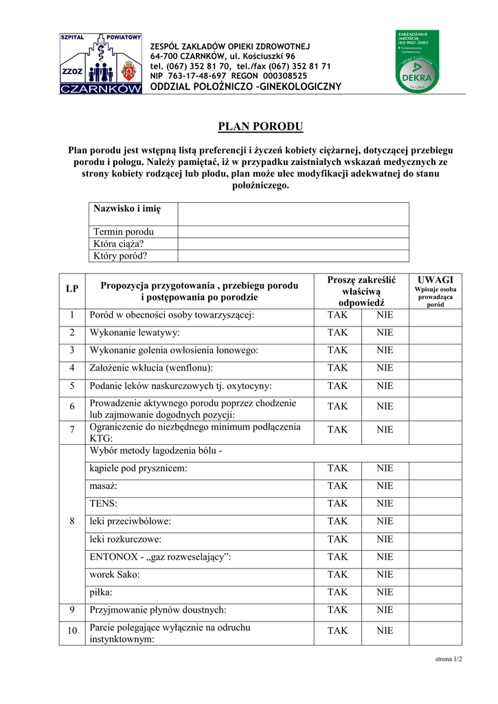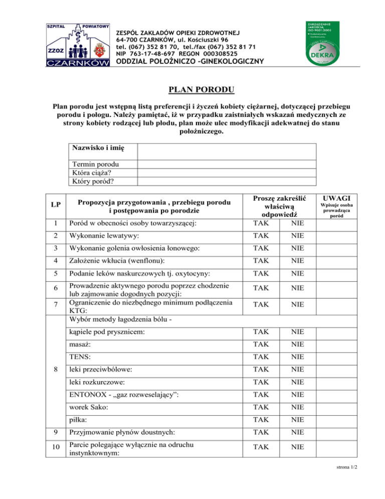 ZESPÓŁ ZAKŁADÓW OPIEKI ZDROWOTNEJ 64-700 CZARNKÓW, ul. Kościuszki 96 tel. (067) 352 81 70, tel./fax (067) 352 81 71 NIP 763-17-48-697 REGON 000308525 ODDZIAŁ POŁOŻNICZO -GINEKOLOGICZNY PLAN PORODU Plan porodu jest wstępną listą preferencji i życzeń kobiety ciężarnej, dotyczącej przebiegu porodu i połogu. Należy pamiętać, iż w przypadku zaistniałych wskazań medycznych ze strony kobiety rodzącej lub płodu, plan może ulec modyfikacji adekwatnej do stanu położniczego. Nazwisko i imię Termin porodu Która ciąża? Który poród? 1 Poród w obecności osoby towarzyszącej: Proszę zakreślić właściwą odpowiedź TAK NIE 2 Wykonanie lewatywy: TAK NIE 3 Wykonanie golenia owłosienia łonowego: TAK NIE 4 Założenie wkłucia (wenflonu): TAK NIE 5 Podanie leków naskurczowych tj. oxytocyny: TAK NIE 6 Prowadzenie aktywnego porodu poprzez chodzenie lub zajmowanie dogodnych pozycji: Ograniczenie do niezbędnego minimum podłączenia KTG: Wybór metody łagodzenia bólu - TAK NIE TAK NIE kąpiele pod prysznicem: TAK NIE masaż: TAK NIE TENS: TAK NIE leki przeciwbólowe: TAK NIE leki rozkurczowe: TAK NIE ENTONOX - „gaz rozweselający”: TAK NIE worek Sako: TAK NIE piłka: TAK NIE 9 Przyjmowanie płynów doustnych: TAK NIE 10 Parcie polegające wyłącznie na odruchu instynktownym: TAK NIE LP 7 8 Propozycja przygotowania , przebiegu porodu i postępowania po porodzie UWAGI Wpisuje osoba prowadząca poród strona 1/2 11 Nacięcie krocza: TAK NIE 12 Ochrona krocza: TAK NIE 13 Położenie noworodka bezpośrednio po porodzie na TAK brzuch matki: Przecięcie pępowiny po ustaniu tętnienia wykonane przez - NIE osobę towarzysząca: TAK NIE samą rodzącą: TAK NIE personel medyczny: TAK NIE 15 Urodzenie łożyska w sposób naturalny: TAK NIE 16 Stały kontakt z noworodkiem po porodzie: TAK NIE 17 Pierwsze karmienie dziecka natychmiast po porodzie: TAK NIE 18 Karmienie dziecka wyłącznie piersią: TAK NIE 19 Stały kontakt z najbliższymi: Inne uwagi kobiety rodzącej: TAK NIE 14 20 Data i podpis pacjentki: _________________ Data i podpis osoby konsultującej Plan Porodu: ________________________________ strona 2/2