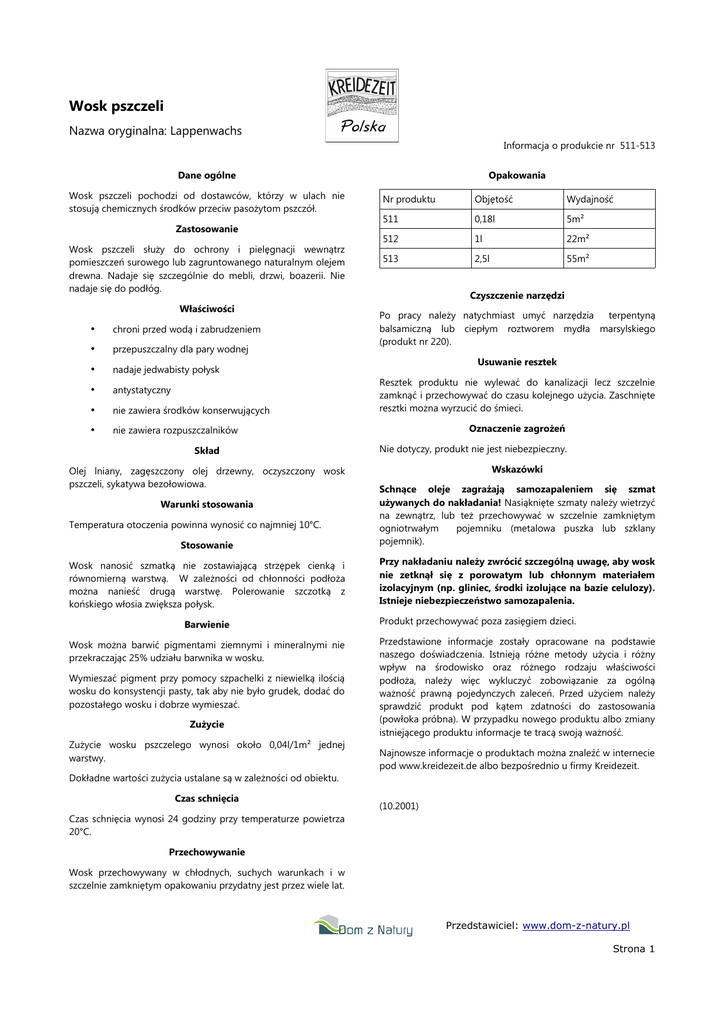 Wosk pszczeli Nazwa oryginalna: Lappenwachs Informacja o produkcie nr 511-513 Dane ogólne Wosk pszczeli pochodzi od dostawców, którzy w ulach nie stosują chemicznych środków przeciw pasożytom pszczół. Zastosowanie Wosk pszczeli służy do ochrony i pielęgnacji wewnątrz pomieszczeń surowego lub zagruntowanego naturalnym olejem drewna. Nadaje się szczególnie do mebli, drzwi, boazerii. Nie nadaje się do podłóg. Właściwości • chroni przed wodą i zabrudzeniem • przepuszczalny dla pary wodnej • nadaje jedwabisty połysk • antystatyczny • nie zawiera środków konserwujących • nie zawiera rozpuszczalników Skład Olej lniany, zagęszczony olej drzewny, oczyszczony wosk pszczeli, sykatywa bezołowiowa. Opakowania Nr produktu Objętość Wydajność 511 0,18l 5m² 512 1l 22m² 513 2,5l 55m² Czyszczenie narzędzi Po pracy należy natychmiast umyć narzędzia terpentyną balsamiczną lub ciepłym roztworem mydła marsylskiego (produkt nr 220). Usuwanie resztek Resztek produktu nie wylewać do kanalizacji lecz szczelnie zamknąć i przechowywać do czasu kolejnego użycia. Zaschnięte resztki można wyrzucić do śmieci. Oznaczenie zagrożeń Nie dotyczy, produkt nie jest niebezpieczny. Wskazówki Stosowanie Schnące oleje zagrażają samozapaleniem się szmat używanych do nakładania! Nasiąknięte szmaty należy wietrzyć na zewnątrz, lub też przechowywać w szczelnie zamkniętym ogniotrwałym pojemniku (metalowa puszka lub szklany pojemnik). Wosk nanosić szmatką nie zostawiającą strzępek cienką i równomierną warstwą. W zależności od chłonności podłoża można nanieść drugą warstwę. Polerowanie szczotką z końskiego włosia zwiększa połysk. Przy nakładaniu należy zwrócić szczególną uwagę, aby wosk nie zetknął się z porowatym lub chłonnym materiałem izolacyjnym (np. gliniec, środki izolujące na bazie celulozy). Istnieje niebezpieczeństwo samozapalenia. Warunki stosowania Temperatura otoczenia powinna wynosić co najmniej 10°C. Barwienie Wosk można barwić pigmentami ziemnymi i mineralnymi nie przekraczając 25% udziału barwnika w wosku. Wymieszać pigment przy pomocy szpachelki z niewielką ilością wosku do konsystencji pasty, tak aby nie było grudek, dodać do pozostałego wosku i dobrze wymieszać. Zużycie Zużycie wosku pszczelego wynosi około 0,04l/1m² jednej warstwy. Dokładne wartości zużycia ustalane są w zależności od obiektu. Czas schnięcia Czas schnięcia wynosi 24 godziny przy temperaturze powietrza 20°C. Produkt przechowywać poza zasięgiem dzieci. Przedstawione informacje zostały opracowane na podstawie naszego doświadczenia. Istnieją różne metody użycia i różny wpływ na środowisko oraz różnego rodzaju właściwości podłoża, należy więc wykluczyć zobowiązanie za ogólną ważność prawną pojedynczych zaleceń. Przed użyciem należy sprawdzić produkt pod kątem zdatności do zastosowania (powłoka próbna). W przypadku nowego produktu albo zmiany istniejącego produktu informacje te tracą swoją ważność. Najnowsze informacje o produktach można znaleźć w internecie pod www.kreidezeit.de albo bezpośrednio u firmy Kreidezeit. (10.2001) Przechowywanie Wosk przechowywany w chłodnych, suchych warunkach i w szczelnie zamkniętym opakowaniu przydatny jest przez wiele lat. Przedstawiciel: www.dom-z-natury.pl Strona 1