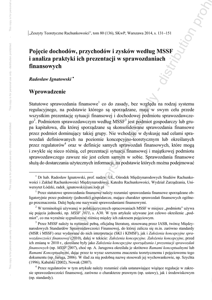 ibu tio np roh This copy is for personal u - dis tr Pojęcie dochodów, przychodów i zysków według MSSF i analiza praktyki ich prezentacji w sprawozdaniach finansowych on ly - Radosław Ignatowski Wprowadzenie pe rso na lu se Statutowe sprawozdania finansowe1 co do zasady, bez względu na rodzaj systemu regulacyjnego, na podstawie którego są sporządzane, mają w swym celu przede wszystkim prezentację sytuacji finansowej i dochodowej podmiotu sprawozdawczego2. Podmiotem sprawozdawczym według MSSF3 jest podmiot gospodarczy lub grupa kapitałowa, dla której sporządzane są skonsolidowane sprawozdania finansowe przez podmiot dominujący takiej grupy. Nie wchodząc w dyskusję nad celami sprawozdań definiowanych na poziomie koncepcyjno-teoretycznym lub określanych przez regulatorów4 oraz w definicje samych sprawozdań finansowych, które mogą i zwykle się nieco różnią, cel prezentacji sytuacji finansowej i majątkowej podmiotu sprawozdawczego zawsze nie jest celem samym w sobie. Sprawozdania finansowe służą do dostarczania użytecznych informacji, na podstawie których można podejmować is c op y is for Dr hab. Radosław Ignatowski, prof. nadzw. UŁ, Ośrodek Międzynarodowych Studiów Rachunkowości i Zakład Rachunkowości Międzynarodowej, Katedra Rachunkowości, Wydział Zarządzania, Uniwersytet Łódzki, [email protected] 1 Przez statutowe sprawozdania finansowe należy rozumieć sprawozdania finansowe sporządzane obligatoryjnie przez podmioty (jednostki) gospodarcze, mające charakter sprawozdań finansowych ogólnego przeznaczenia. Dalej będą one nazywane sprawozdaniami finansowymi. 2 W terminologii używanej w polskojęzycznych opracowaniach MSSF w miejsce „podmiotu” używa się pojęcia jednostki, np. MSSF 2011, s. A30. W tym artykule używane jest celowo określenie „podmiot”, co ma wyraźnie sygnalizować różnicę między ich zakresem pojęciowym. 3 Przez MSSF należy tu rozumieć pełną, oficjalną literaturę, stosowaną przez IASB, twórcę Międzynarodowych Standardów Sprawozdawczości Finansowej, do której zalicza się m.in. zarówno standardy (MSR i MSSF) oraz wydawane do nich interpretacje (SKI i KIMSF), jak i Założenia koncepcyjne sprawozdawczości finansowej (2010), dalej w tekście: Założenia koncepcyjne. Założenia koncepcyjne, przed ich zmianą w 2010 r., określane były jako Założenia koncepcyjne sporządzania i prezentacji sprawozdań finansowych (np. MSSF 2007), choć np. A. Jarugowa określała je skrótowo Ramami konceptualnymi lub Ramami Konceptualnymi, dając przez to wyraz szerszemu znaczeniu teoretycznemu i pojęciowemu tego dokumentu (np. Jaruga, 2006). W ślad za nią podobną nazwę stosowali jej wychowankowie, np. Szychta (1996), Kabalski (2002), Nowak (2007). 4 Przez regulatorów w tym artykule należy rozumieć ciała ustanawiające wiążące regulacje w zakresie sprawozdawczości finansowej, zarówno o charakterze prawnym (np. ustawy), jak i środowiskowym (np. standardy). Th This copy is for personal use only - distribution prohibited. - This copy is for personal use only - distribution prohibited. - This copy is for personal use only - distribution prohibited. - „Zeszyty Teoretyczne Rachunkowości”, tom 80 (136), SKwP, Warszawa 2014, s. 131151 5 ibu tio np roh is c op y is for pe rso na lu se on ly - dis tr decyzje gospodarcze. Decyzje te, jeśli patrzeć na nie z punktu widzenia inwestorów, dotyczą zwykle oceny tego, czy z zainwestowanych zasobów kapitałowych osiągany jest zwrot, jaki jest jego poziom, jakich zwrotów i czy w ogóle można się ich spodziewać w przyszłości? Pytań, na które odpowiedzi lub podpowiedzi dają dane finansowe i niefinansowe, prezentowane i ujawniane w sprawozdaniach finansowych, jest naturalnie znacznie więcej. Niezwykle ważnym elementem sprawozdań finansowych sporządzanych według MSSF, realizującym ich cel5, jest sprawozdanie obrazujące dokonania finansowe podmiotu sprawozdawczego, jakie ten osiągnął w danym okresie sprawozdawczym (prezentując przy tym dane porównawcze za okresy poprzednie). Mówiąc o dokonaniach finansowych (wynikach działalności), mam tu na myśli pojęcie stosowane w Założeniach koncepcyjnych sprawozdawczości finansowej (par. 4.24), którego najczęstszym miernikiem jest zysk. Nie chodzi przy tym wyłącznie o zysk w wąskim znaczeniu (sensu stricto), jaki zwykło się prezentować w sprawozdaniu z zysku lub straty (sprawozdaniu z dochodu), zwyczajowo według polskiej terminologii MSSF (np. MSSF 2007, s. 426) i w polskim systemie regulacyjnym rachunkowości od 1994 r. nazywanym rachunkiem zysków i strat (wcześniej: rachunkiem wyników), ale o zysk (sensu largo) w rozumieniu dodatniej różnicy między kapitałem własnym na koniec okresu sprawozdawczego a kapitałem własnym na początek okresu sprawozdawczego, ustalanej z wyłączeniem transakcji z właścicielami podmiotu sprawozdawczego. W MSR 1 Prezentacja sprawozdań finansowych zysk taki obecnie nazywa się całkowitym dochodem, a sprawozdanie, które prezentuje jego składowe nazywa się sprawozdaniem z zysku lub straty i innych składników całkowitego dochodu. Zwykle zysk ustala się jako różnicę między dochodami i kosztami, przy czym te pierwsze obejmują przychody i zyski, zaś te drugie koszty i straty. Innymi słowy, na zysk (sensu largo) wpływają zyski i straty, które mogą być realizowane w drodze zwyczajnej działalności gospodarczej podmiotu sprawozdawczego, ale także tej niekwalifikowanej do zwyczajnej, tj. realizowane sporadycznie lub na operacjach, lub transakcjach, które IASB uznaje za podstawę do ujęcia poza zyskiem okresu, zaliczanych do dochodu całkowitego jako inne składniki całkowitego dochodu. Z treści poprzedniego akapitu może wynikać, że autor niniejszego opracowania wprowadza chaos terminologiczny, wskazując na zależności między zyskiem a zyskiem lub dochodem a przychodem. Chaos ten nie jest dziełem autorskim, lecz re