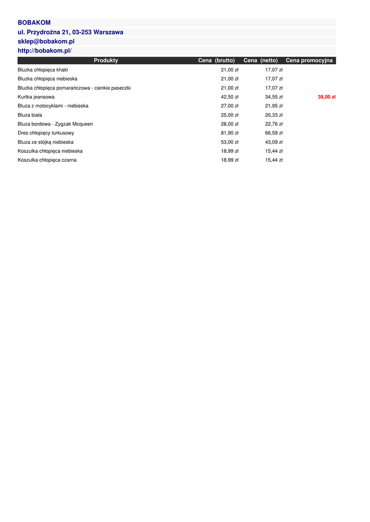 BOBAKOM ul. Przydrożna 21, 03-253 Warszawa [email protected] http://bobakom.pl/ Produkty Cena (brutto) Cena (netto) Bluzka chłopięca khaki 21,00 zł 17,07 zł Bluzka chłopięca niebieska 21,00 zł 17,07 zł Bluzka chłopięca pomarańczowa - cienkie paseczki 21,00 zł 17,07 zł Kurtka jeansowa 42,50 zł 34,55 zł Bluza z motocyklami - niebieska 27,00 zł 21,95 zł Bluza biała 25,00 zł 20,33 zł Bluza bordowa - Zygzak Mcqueen 28,00 zł 22,76 zł Dres chłopięcy turkusowy 81,90 zł 66,59 zł Bluza ze stójką niebieska 53,00 zł 43,09 zł Koszulka chłopięca niebieska 18,99 zł 15,44 zł Koszulka chłopięca czarna 18,99 zł 15,44 zł Cena promocyjna 38,00 zł