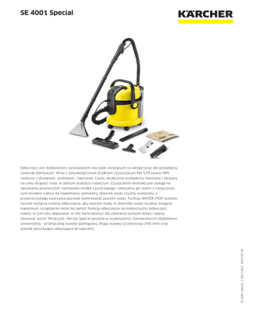 SE 4001 Special Odkurzacz jest doskonałym rozwiązaniem dla osób cierpiących na alergie oraz dla posiadaczy zwierząt domowych. Wraz z antyalergicznym środkiem czyszczącym RM 519 usuwa 99% roztoczy z dywanów, wykładzin i tapicerek. Czyści skutecznie wykładziny tekstylne i dywany na całej długości runa, w jednym przejściu roboczym. Czyszczenie ekstrakcyjne polega na spryskaniu powierzchni roztworem środka czyszczącego i odessaniu go razem z rozpuszczonym brudem. Łatwy do napełniania zamykany zbiornik wody czystej wykonany z przeźroczystego tworzywa pozwala kontrolować poziom wody. Funkcja WATER STOP automatycznie wyłącza turbinę odkurzacza, gdy poziom wody w zbiorniku wody brudnej osiągnie maksimum. Urządzenie może też pełnić funkcję odkurzacza na mokro/sucho (odkurzacz należy w tym celu doposażyć w filtr kartridżowy). Do zbierania suchych śmieci należy stosować worki filtracyjne. Wersja Special posiada w wyposażeniu standardowym dodatkowo uniwersalną - przełączaną ssawkę podłogową, długą ssawkę szczelinową (350 mm) oraz SE 4001 Special, 1.081-136.0, 2017-02-04 ssawkę spryskująco-odsysająca do tapicerki. SE 4001 Special Duży zbiornik na czystą wodę Technologia dysz Kärcher: czas schnięcia zredukowany o 50% Wytrzymały zbiornik Dane techniczne 1.081-136.0 Numer katalogowy Podciśnienie mbar / kPa 210 / 21 Wydatek powietrza l/s 70 Zbiornik na wodę czystą / brudną l 4 Moc turbiny / pompy W 1400 / 40 Wydajność spryskiwania l/min 1 Ciśnienie spryskiwania bar 1 Kabel zasilający m 7,5 Ciężar bez wyposażenia kg 7,8 Wyposażenie standardowe Wąż spryskująco-odsysający z uchwy- m / mm tem Rury do ekstrakcji szt. / m / mm Dysza spryskująco-odsysająca z nasadką do podłóg twardych Ssawka do tapicerki 2 / 35 Ssawka szczelinowa –/ Filtr piankowy RM 519 Środek czyszczący do dywanów i wykładzin (100 ml) Listwa odbojowa Objęte dostawą. Ssawka do tapicerki Papierowa torebka filtracyjna 2 × 0,5 / 35 / Elementy z plastiku / – szt. 1 SE 4001 Special, 1.081-136.0, 2017-02-04 4054278075358 Akcesoria dla SE 4001 Special 1.081-136.0 1 2 3 4 5 6 7 8 Numer katalogowy Cena Opis Filtr Papierowe torebki filtracyjne Wkład filtracyjny Cartridge 1 6.959-130.0 2 6.414-552.0 5 wydajnych papierowych torebek filtracyjnych o dwóch warstwach. Wytrzymałe torebki doskonale zatrzymujące drobny pył. Filtr typu Cartridge przeznaczony do odkurzania na sucho i mokro bez wymiany filtra. Zestawy wyposażenia 3 2.863-002.0 Zestaw akcesoriów do odkurzania w domu. Składa się ze ssawki podłogowej przełączanej do odkurzania podłóg twardych i dywanów oraz ssawki do tapicerki. Długa ssawka szczelinowa 4 2.863-223.0 Ssawka samochodowa 5 2.863-145.0 Ssawka z twardą szczeciną 6 2.863-146.0 Nowa przeprojektowana, bardzo długa i wąska ssawka szczelinowa. Poręczna ssawka samochodowa do szybkiego i łatwego czyszczenia - od dywaników po bagażnik. Ssawka do dokładnego czyszczenia tapicerki i wykładziny dywanowej w samochodzie. Bez problemu usuwa zaschnięte zabrudzenia. Ssawka z dodatkową miękką szczeciną do delikatnego czyszczenia wrażliwych powierzchni w samochodzie, np. deska rozdzielcza lub konsola środkowa. Długa ssawka szczelinowa do czyszczenia trudnodostępnych miejsc takich jak szczeliny, otwory np. pomiędzy fotelami, w kieszeniach bocznych samochodu, między ścianą a meblami. Zestaw do odkurzania domu Dysze Ssawka szczotkowa z miękką szczeciną 7 2.863-147.0 Długa ssawka szczelinowa (350mm) 8 2.863-144.0 SE 4001 Special, 1.081-136.0, 2017-02-04 Dostępne akcesoria.