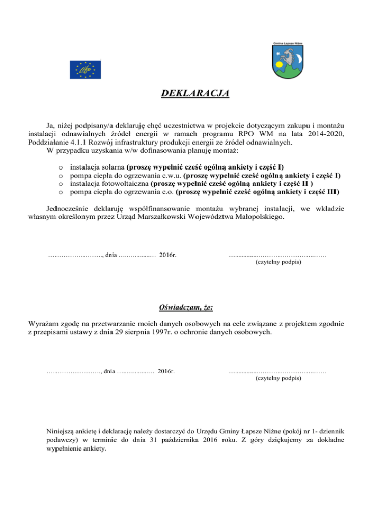 DEKLARACJA Ja, niżej podpisany/a deklaruję chęć uczestnictwa w projekcie dotyczącym zakupu i montażu instalacji odnawialnych źródeł energii w ramach programu RPO WM na lata 2014-2020, Poddziałanie 4.1.1 Rozwój infrastruktury produkcji energii ze źródeł odnawialnych. W przypadku uzyskania w/w dofinasowania planuję montaż: o o o o instalacja solarna (proszę wypełnić cześć ogólną ankiety i część I) pompa ciepła do ogrzewania c.w.u. (proszę wypełnić cześć ogólną ankiety i część I) instalacja fotowoltaiczna (proszę wypełnić cześć ogólną ankiety i część II ) pompa ciepła do ogrzewania c.o. (proszę wypełnić cześć ogólną ankiety i część III) Jednocześnie deklaruję współfinansowanie montażu wybranej instalacji, we wkładzie własnym określonym przez Urząd Marszałkowski Województwa Małopolskiego. ……………………., dnia …..….........… 2016r. …..............……………………..…… (czytelny podpis) Oświadczam, że: Wyrażam zgodę na przetwarzanie moich danych osobowych na cele związane z projektem zgodnie z przepisami ustawy z dnia 29 sierpnia 1997r. o ochronie danych osobowych. ……………………., dnia …..….........… 2016r. …..............……………………..…… (czytelny podpis) Niniejszą ankietę i deklarację należy dostarczyć do Urzędu Gminy Łapsze Niżne (pokój nr 1- dziennik podawczy) w terminie do dnia 31 października 2016 roku. Z góry dziękujemy za dokładne wypełnienie ankiety. Pusta strona w przypadku druku dwustronnego -aby deklaracja była na oddzielnej kartce Ciąg dalszy ankiety na stronach 3- 6 ANKIETA I DEKLARACJA DOTYCZĄCA UDZIAŁU W PROJEKCIE MONTAŻU INSTALACJI ODNAWIALNYCŁ ŹRÓDEŁ ENERGII PODSTAWOWE DANE OSOBY ZAINTERESOWANEJ Imię …………………………………………... Nazwisko ……………………………….……… Gmina Łapsze Niżne Miejscowość …………………………………… Ulica ……………………………………..……. Nr domu …..………, nr lokalu ………………… Telefon kontaktowy: …………………………. E-mail: ………………..………………………… PODSTAWOWE DANE OSOBY REPREZENTUJĄCEJ (JEŚLI INNE NIŻ WYŻEJ) Imię …………………………………………... Nazwisko ……………………………….……… Gmina Łapsze Niżne Miejscowość …………………………………… Ulica ……………………………………..……. Nr domu …..………, nr lokalu ………………… Telefon kontaktowy: …………………………. E-mail: ………………..………………………… DANE WŁASNOŚCIOWE 1. Typ własności: o o o o właściciel współwłaściciel pełnomocnik inne (jakie?) 2. Budynek, na którym ma zostać zainstalowana instalacja, jest własnością (zgodnie z Aktem własności ziemi, Księgą Wieczystą, Postanowieniem Sądu): …………………………………………………………………………………………. 3. Numer ewidencyjny działki: …………………. PRZEZNACZENIE BUDYNKU 1. Czy w budynku prowadzona jest lub zarejestrowana (proszę zaznaczyć właściwą odpowiedź i uzupełnić dane): − działalność gospodarcza o NIE o TAK, powierzchni przeznaczona pod działalność ………… m2 − agroturystyka o NIE o TAK, ilość miejsc noclegowych ………….. DANE OGÓLNE OBIEKTU, NA KTÓRYM BĘDĄ ZAMONTOWANE INSTALACJE 1. Liczba osób: zamieszkałych w budynku …….. 2. Rodzaj budynku (zaznaczyć właściwe): o o o 3. 4. 5. o o o o 6. o o 7. o o o o wolnostojący bliźniak zabudowa szeregowa Rok budowy: …………… Powierzchnia ogrzewanego budynku: ………………. m2 Rodzaj pokrycia dachu (zaznaczyć właściwe): blacha dachówka blacho- dachówka inne ……………… Czy w najbliższym czasie planowana jest wymiana pokrycia dachowego? Tak (na jakie?) ………………………. Nie Rodzaj dachu (zaznaczyć właściwe): płaski jednospadowy dwuspadowy złożony z wielu połaci 8. System grzewczy obecnie zainstalowany w budynku: o kocioł węglowy zasypowy, o kocioł na ekogroszek/miał z podajnikiem, o kocioł na biomasę – drewno/zrębki/pelet, o kocioł gazowy, o kocioł olejowy, o ogrzewanie elektryczne, o inne ………………………………… CZĘŚĆ I DOTYCZY INSTALACJI SOLARNYCH ORAZ POMP CIEPŁA DO OGRZEWANIA CIEPŁEJ WODY UŻYTKOWEJ 1. W jaki sposób podgrzewana jest woda w budynku: o o centralnie (w kotle) przepływowy ogrzewacz wody o inne- jakie …………………… 2. Planowane miejsce montażu instalacji: o na połaci dachu budynku mieszkalnego (8 % VAT) o na połaci dachu budynku gospodarczego/garażu nie będącego częścią budynku mieszkalnego (23 % VAT) o na gruncie (23 % VAT) CZĘŚĆ II DOTYCZY MONTAŻU INSTALACJI FOTOWOLTAICZNYCH 1. Powierzchnia przeznaczona na instalację fotowoltaiczną na połaci dachu: ………………m2 2. Zainstalowana moc przyłączeniowa (kW) (z umowy zawartej z Zakładem Energetycznym: ……………………kW 3. Dane z faktury za energię elektryczną za dwa ostatnie okresy rozliczeniowe (półroczne) - ilość zużywanej energii elektrycznej wyrażona w kWh: Pierwsze półrocze:........................kWh Drugie półrocze:……………………kWh 4. Oczekiwana moc zainstalowana (kW): o o o o 2 kW 3 kW 4 kW 5 kW *weryfikacja możliwej do zamontowanej mocy nastąpi po analizie złożonych ankiet 5. Planowane miejsce montażu instalacji: o na połaci dachu budynku mieszkalnego (8 % VAT) o na połaci dachu budynku gospodarczego/garażu nie będącego częścią budynku mieszkalnego (23 % VAT) o na gruncie (23 % VAT) CZĘŚĆ III DOTYCZY MONTAŻU POMP CIEPŁA DO CENTRALNEGO OGRZEWANIA 1. Moc zainstalowanego kotła: ……………… Kw 2. Rok zainstalowania kotła: ………………… 3. Przybliżone roczne zużycie paliwa: o węgiel kamienny - zużycie ton węgla za ostatni rok ………