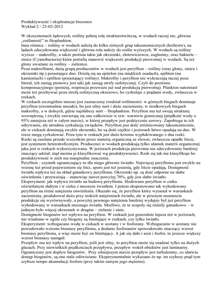 Produktywność i eksploatacja biocenoz Wykład 2 / 23-02-2012 W ekosystemach lądowych, rośliny pełnią rolę strukturotwórczą, w wodach raczej nie, główna „roślinność” to fitoplankton. Inna różnica – rośliny w wodach należą do kilku różnych grup taksonomicznych (królestw), na lądach zdecydowana większość i główna rola należy do roślin wyższych. W wodach są rośliny wyższe – makrofity, a także protista takie jak okrzemki, złotowiciowce, eugleniny, oraz bakterie – sinice (Cyanobacteria) które potrafią stanowić większość produkcji pierwotnej w wodach. Są też glony uważane za rośliny – zielenice. Poza makrofitami, dużą grupą producentów w wodach jest peryfiton – rośliny (oraz glony, sinice i okrzemki itp.) porastające dno. Dzielą się na epitelon (na miękkich osadach), epiliton (na kamieniach) i epifiton (porastający rośliny). Makrofity i peryfiton nie wykraczają raczej poza litoral, ich zasięg pionowy jest taki jak zasięg strefy eufotycznej. Czyli do poziomu kompensacyjnego (poniżej, respiracja przeważa już nad produkcją pierwotną). Plankton natomiast może też przebywać poza strefą eufotyczną okresowo, bo cyrkuluje z prądami wody, zwłaszcza w rzekach. W rzekach szczególnie mocno jest zaznaczony rozdział roślinności: w górnych biegach dominuje peryfiton (ewentualnie mszaki), bo jest silny nurt i duże zacienienie, w środkowych biegach makrofity, a w dolnych, gdzie najsłabszy nurt – fitoplankton. Peryfiton ma też swoją strukturę wewnętrzną, i zwykle zawierają się one całkowicie w tzw. warstwie granicznej (prędkość wody o 95% mniejsza niż w całym nurcie), w której przepływ jest praktycznie zerowy. Zapobiega to ich odrywaniu, ale utrudnia cyrkulację związków. Peryfiton jest dość zróżnicowany taksonomicznie, ale w ciekach dominują zwykle okrzemki, bo są dość ciężkie i jeziorach łatwo opadają na dno. W rzece mogą cyrkulować. Poza tym w rzekach jest dużo krzemu wypłukiwanego z dna rzeki. Rzeki są zasilane przede wszystkim przez materię organiczną ze zlewni, zwłaszcza opadłe liście, jest systemem heterotroficznym. Producenci w wodach produkują tylko ułamek materii organicznej jaka jest w rzekach wykorzystywana. W jeziorach produkcja pierwotna ma zdecydowanie bardziej znaczący udział, stąd można je klasyfikować wg produktywności. Rzek się tak nie klasyfikuje bo produktywność w nich ma marginalne znaczenie. Peryfiton - czynnik ograniczający to dla niego głównie światło. Najwięcej peryfitonu jest zwykle na wiosnę tuż przed pojawieniem się liści, sporo jest też jesienią, gdy liście opadają. Dostępność światła wpływa też na skład gatunkowy peryfitonu. Okrzemki np. są dość odporne na słabe oświetlenie i przeważają – stanowiąc nawet powyżej 70%, gdy jest słabe światło. Eksperyment: jak wpływa światło na budowę peryfitonu. Hodowano peryfiton w cieku oświetlanym słabym i w cieku z mocnym światłem. I potem eksponowano tak wyhodowany peryfiton na różne natężenia oświetlenia. Okazało się, że peryfiton który wyrastał w warunkach zacienienia, produkował dużo przy niskich natężeniach światła, ale w pewnym momencie produkcje się wyrównywały, a powyżej pewnego natężenia bardziej wydajny był już peryfiton wyhodowany w warunkach mocnego światła. Możliwe, że te zespoły się różniły gatunkowo – w jednym było więcej okrzemek w drugim – zielenic i sinic. Dostępność biogenów też wpływa na peryfiton. W rzekach jest generalnie lepsza niż w jeziorach, nie wiadomo w ogóle czy biogeny są limitujące w rzekach, czy tylko światło. Eksperyment: wzbogacano wodę w ciekach w azotany i w fosforany. Wzbogacanie w azotany nie powodowało wzrostu biomasy peryfitonu, a dodanie fosforanów spowodowało znaczący wzrost biomasy peryfitonu, a więc może być on limitujący. A jak się dało i azot i fosfor, to jeszcze większy wzrost biomasy nastąpił. Przepływ ma też wpływ na peryfiton, jeśli jest silny, to peryfiton może się osadzać tylko na dużych głazach. Przy niewielkich prędkościach przepływu, przepływ wokół obiektów jest laminarny. Ograniczony jest dopływ biogenów. Przy silniejszym nurcie przepływ jest turbulentny, co ułatwia dostęp biogenów, są one stale odświeżane. Eksperymentalnie wykazano że np. im szybszy prąd tym szybsze tempo akumulacji fosforu (przy takim samym jego stężeniu). Azot rzadko limituje produktywność w rzekach i jeziorach, ale jego stosunek do fosforu ma wpływ na jakość glonów. Sinice mogą łapać azot atmosferyczny, więc przy mniejszych zasobach azotu w wodzie radzą sobie lepiej i dominują. Nadmiar azotu sprzyja okrzemkom i zielenicom. Temperatura ma też niewielki wpływ na biomasę glonów, ale na skład. W niskich temperaturach zdecydowanie dominują okrzemki a w wysokich lepiej sinice. W zacienionych strumieniach produktywność peryfitonu wynosi 0,1-0,001 g C-org/m2/dobę. Czyli mało. Ale w odsłoniętych ciekach już 1-6 g. A maksymalne notowane wartości to 20 g. Z tym, że są to wartości netto. Makrofity. Dominują w środkowych biegach cieków, ale też się obserwuje pewną ich sukcesję w dół cieków, w zależności od siły nurtu. Mszaki dominują w górnych ciekach, i nieliczne naczyniowe, a w dolnych biegach – moczarka, rdestnica. Podlegają one ograniczaniu przez głównie światło. Rosną więc dość płytko. Ruch wody również ma na nie wpływ, i jak wyżej – zbyt mały i zbyt duży jest negatywny. Twardość wody ma wpływ szczególnie na występowanie mszaków, które wolą miękką wodę. Rośliny wyższe preferują twardą. Produktywność makrofitów podobna jak peryfitonu. Bardziej produktywne od makrofitów zanurzonych są te wynurzone, jak trzcina, one przewyższają 20 g C-org/m2/dobę. Makrofity są mniej uzależnione od stężenia biogenów w wodzie bo czerpią je z dna. Fitoplankton – w rzekach, nie m