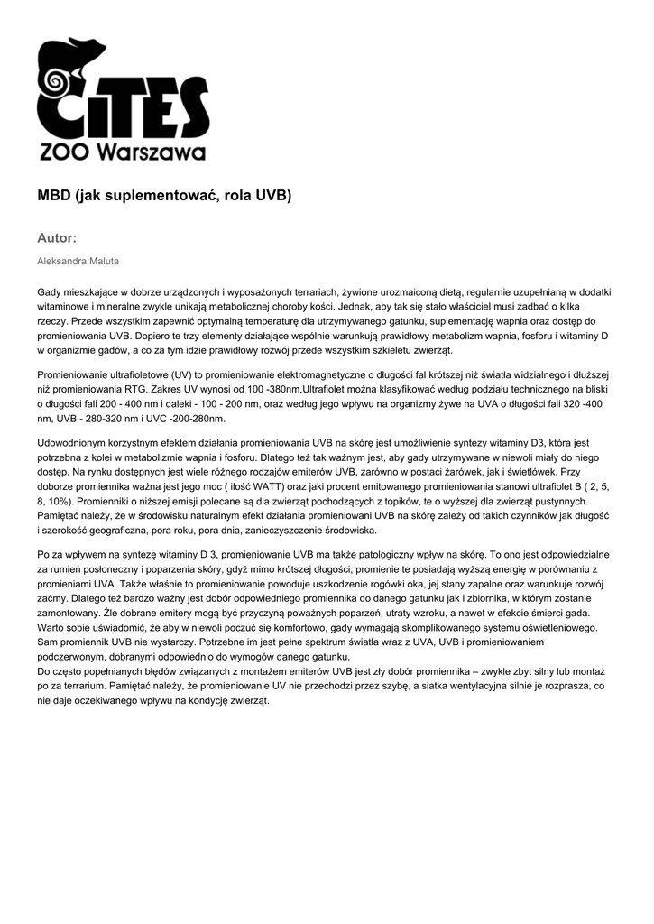 MBD (jak suplementować, rola UVB) Autor: Aleksandra Maluta Gady mieszkające w dobrze urządzonych i wyposażonych terrariach, żywione urozmaiconą dietą, regularnie uzupełnianą w dodatki witaminowe i mineralne zwykle unikają metabolicznej choroby kości. Jednak, aby tak się stało właściciel musi zadbać o kilka rzeczy. Przede wszystkim zapewnić optymalną temperaturę dla utrzymywanego gatunku, suplementację wapnia oraz dostęp do promieniowania UVB. Dopiero te trzy elementy działające wspólnie warunkują prawidłowy metabolizm wapnia, fosforu i witaminy D w organizmie gadów, a co za tym idzie prawidłowy rozwój przede wszystkim szkieletu zwierząt. Promieniowanie ultrafioletowe (UV) to promieniowanie elektromagnetyczne o długości fal krótszej niż światła widzialnego i dłuższej niż promieniowania RTG. Zakres UV wynosi od 100 -380nm.Ultrafiolet można klasyfikować według podziału technicznego na bliski o długości fali 200 - 400 nm i daleki - 100 - 200 nm, oraz według jego wpływu na organizmy żywe na UVA o długości fali 320 -400 nm, UVB - 280-320 nm i UVC -200-280nm. Udowodnionym korzystnym efektem działania promieniowania UVB na skórę jest umożliwienie syntezy witaminy D3, która jest potrzebna z kolei w metabolizmie wapnia i fosforu. Dlatego też tak ważnym jest, aby gady utrzymywane w niewoli miały do niego dostęp. Na rynku dostępnych jest wiele różnego rodzajów emiterów UVB, zarówno w postaci żarówek, jak i świetlówek. Przy doborze promiennika ważna jest jego moc ( ilość WATT) oraz jaki procent emitowanego promieniowania stanowi ultrafiolet B ( 2, 5, 8, 10%). Promienniki o niższej emisji polecane są dla zwierząt pochodzących z topików, te o wyższej dla zwierząt pustynnych. Pamiętać należy, że w środowisku naturalnym efekt działania promieniowani UVB na skórę zależy od takich czynników jak długość i szerokość geograficzna, pora roku, pora dnia, zanieczyszczenie środowiska. Po za wpływem na syntezę witaminy D 3, promieniowanie UVB ma także patologiczny wpływ na skórę. To ono jest odpowiedzialne za rumień posłoneczny i poparzenia skóry, gdyż mimo krótszej długości, promienie te posiadają wyższą energię w porównaniu z promieniami UVA. Także właśnie to promieniowanie powoduje uszkodzenie rogówki oka, jej stany zapalne oraz warunkuje rozwój zaćmy. Dlatego też bardzo ważny jest dobór odpowiedniego promiennika do danego gatunku jak i zbiornika, w którym zostanie zamontowany. Źle dobrane emitery mogą być przyczyną poważnych poparzeń, utraty wzroku, a nawet w efekcie śmierci gada. Warto sobie uświadomić, że aby w niewoli poczuć się komfortowo, gady wymagają skomplikowanego systemu oświetleniowego. Sam promiennik UVB nie wystarczy. Potrzebne im jest pełne spektrum światła wraz z UVA, UVB i promieniowaniem podczerwonym, dobranymi odpowiednio do wymogów danego gatunku. Do często popełnianych błędów związanych z montażem emiterów UVB jest zły dobór promiennika – zwykle zbyt silny lub montaż po za terrarium. Pamiętać należy, że promieniowanie UV nie przechodzi przez szybę, a siatka wentylacyjna silnie je rozprasza, co nie daje oczekiwanego wpływu na kondycję zwierząt. Jednak jak napisałam na początku, do prawidłowego rozwoju zwierząt potrzebnych jest kilka elementów składowych. Zwierzęta utrzymywane w niewoli są skazane na naszą łaskę i mądrość. Dlatego też musimy zapewnić im po za prawidłowo skonstruowanym i wyposażonym terrarium, w którym panuje optymalny dla danego gatunku mikroklimat, zbilansowaną i urozmaicona dietę. Pamiętać musimy, aby dieta naszych podopiecznych była jak najbardziej urozmaicona. Menue gadów musimy uzupełnić o regularnie podawane związki mineralne i witaminowe. Najważniejszą rolę odgrywa suplementacja wapnia. Na rynku dostępne są preparaty wapienne przeznaczone dla gadów. Dla zwierząt o aktywności dziennej wybieramy te, bez dodatku witaminy D, dla zwierząt nocnych przeznaczony jest wapń z witaminą D. U młodych, szybkorosnących osobników preparaty wapniowe( np. Microcalcium) powinny być podawane codzienne, natomiast inne minerały i witaminy ( np. Reptimineral, Reptivit) należy suplementowa raz w tygodniu. Wapń warto codziennie podawać także samicom używanym do rozrodu, zwłaszcza jaszczurkom i żółwiom. W przypadku dorosłych osobników, które zakończyły wzrost i nie są samicami hodowlanymi zmniejszamy ilość podawanych suplementów, lecz nie zaprzestajemy. Wapń u tej grupy podajemy co 2 dni, zaś preparaty witaminowo- mineralne raz na 2-3 tyg., dbając oczywiście o urozmaiconą dietę. U zwierząt chorych prowadzący lekarz weterynarii może zalecić inne stosowanie suplementów. Należy pamiętać, że preparaty przeznaczone dla ludzi, psów, czy kotów są inaczej zbilansowane niż te produkowane dla gadów, dlatego też nie można samodzielnie, bez konsultacji z lekarzem weterynarii ich stosować, aby nie zaszkodzić zwierzęciu. Zalecane rodzaje promienników UVB dla poszczególnych gatunków gadów UVB 5% UVB 10% Żółw stepowy, żółw grecki, żółw mauretański, Żółw pustynny, żółw lamparci, żółw obrzeżony, żółw leśny, żółw czerwonolicy, żółw promienisty żółw żółtolicy Legwan zielony, agama błotna, bazyliszki, waran leśny Kajman okularowy Agama brodata (z wyłączeniem odmiany silkback), waran stepowy UVB 2% + + + Gady o nocnej aktywność z wyłączeniem odmian barwnych pozbawionych lub o ograniczonej ilości melaniny
