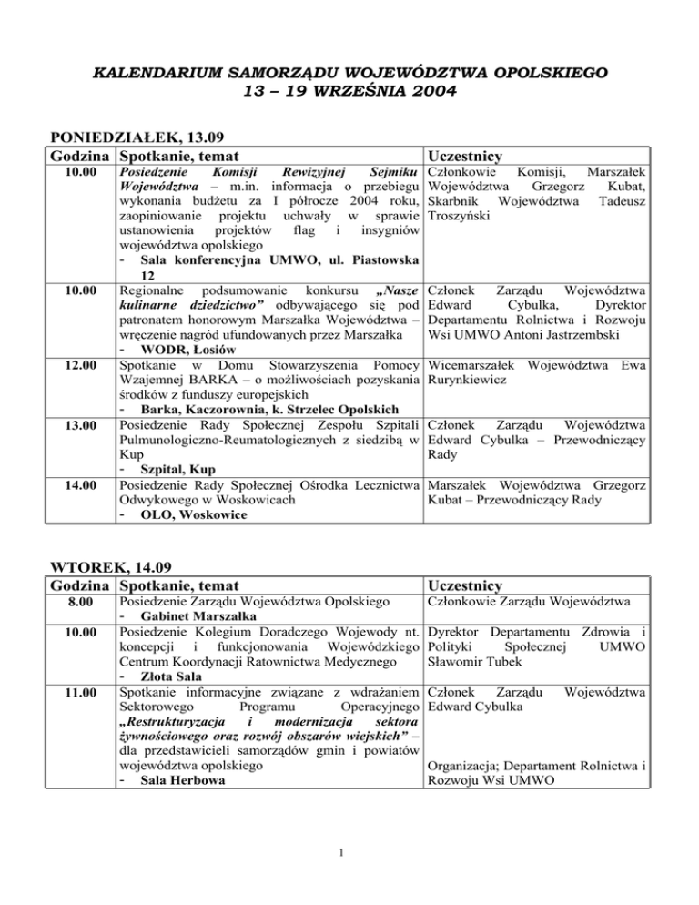 KALENDARIUM SAMORZĄDU WOJEWÓDZTWA OPOLSKIEGO 13 – 19 WRZEŚNIA 2004 PONIEDZIAŁEK, 13.09 Godzina Spotkanie, temat 10.00 10.00 12.00 13.00 14.00 Uczestnicy Posiedzenie Komisji Rewizyjnej Sejmiku Województwa – m.in. informacja o przebiegu wykonania budżetu za I półrocze 2004 roku, zaopiniowanie projektu uchwały w sprawie ustanowienia projektów flag i insygniów województwa opolskiego - Sala konferencyjna UMWO, ul. Piastowska 12 Regionalne podsumowanie konkursu „Nasze kulinarne dziedzictwo” odbywającego się pod patronatem honorowym Marszałka Województwa – wręczenie nagród ufundowanych przez Marszałka - WODR, Łosiów Spotkanie w Domu Stowarzyszenia Pomocy Wzajemnej BARKA – o możliwościach pozyskania środków z funduszy europejskich - Barka, Kaczorownia, k. Strzelec Opolskich Posiedzenie Rady Społecznej Zespołu Szpitali Pulmunologiczno-Reumatologicznych z siedzibą w Kup - Szpital, Kup Posiedzenie Rady Społecznej Ośrodka Lecznictwa Odwykowego w Woskowicach - OLO, Woskowice WTOREK, 14.09 Godzina Spotkanie, temat 8.00 10.00 11.00 Członkowie Komisji, Marszałek Województwa Grzegorz Kubat, Skarbnik Województwa Tadeusz Troszyński Członek Zarządu Województwa Edward Cybulka, Dyrektor Departamentu Rolnictwa i Rozwoju Wsi UMWO Antoni Jastrzembski Wicemarszałek Województwa Ewa Rurynkiewicz Członek Zarządu Województwa Edward Cybulka – Przewodniczący Rady Marszałek Województwa Grzegorz Kubat – Przewodniczący Rady Uczestnicy Posiedzenie Zarządu Województwa Opolskiego - Gabinet Marszałka Posiedzenie Kolegium Doradczego Wojewody nt. koncepcji i funkcjonowania Wojewódzkiego Centrum Koordynacji Ratownictwa Medycznego - Złota Sala Spotkanie informacyjne związane z wdrażaniem Sektorowego Programu Operacyjnego „Restrukturyzacja i modernizacja sektora żywnościowego oraz rozwój obszarów wiejskich” – dla przedstawicieli samorządów gmin i powiatów województwa opolskiego - Sala Herbowa 1 Członkowie Zarządu Województwa Dyrektor Departamentu Zdrowia i Polityki Społecznej UMWO Sławomir Tubek Członek Zarządu Edward Cybulka Województwa Organizacja; Departament Rolnictwa i Rozwoju Wsi UMWO 11.00 14.00 17.00 Spotkanie z przedstawicielami miasta Brzeg w sprawie udziału samorządu Brzegu w promocji województwa opolskiego - Urząd Miasta, Brzeg Posiedzenie Zarządu Opolskiej Regionalnej Organizacji Turystycznej – nt. działalności wydawniczej w 2005 roku - Hotel Mercure, Opole Spotkanie z Sigfridem Gauchem, pisarzem z Nadrenii Palatynatu, członkiem zarządu niemieckiego Pen Clubu - Wojewódzka Biblioteka Publiczna ŚRODA, 15.09 Godzina Spotkanie, temat Od 8.30 10.00 12.00 13.00 p.o. Dyrektora Departamentu Turystyki i Sportu UMWO Lucjusz Bilik p.o. Dyrektora Departamentu Turystyki i Sportu UMWO Lucjusz Bilik Wicemarszałek Województwa Ewa Rurynkiewicz, Dyrektor Departamentu Kultury UMWO Janusz Wójcik Uczestnicy Komisyjne lustracje wsi, zagród i projektów zgłoszonych do konkursu Piękna Wieś Opolska 2004 – gminy Prószków, Komprachcice, Zdzieszowice Konferencja „Orientacja zawodowa w gimnazjum z wykorzystaniem rozwiązań francuskich” organizowana w ramach projektu „Transition” przez Ministerstwo Edukacji i Sportu - Hotel Mercure, Opole Spotkanie z potencjalnymi beneficjentami inicjatywy wspólnotowej INTERREG III A – nt. polskoczeskiego projektu dotyczącego szlaku rowerowego „szlakiem czarownic” - Sala konferencyjna UMWO, ul. Piastowska 13 Spotkanie nt. omówienia wyników programu rozwoju sprzedaży bezpośredniej produktów rolnych w województwie opolskim i planów dalszych działań - Sala konferencyjna UMWO, ul. Piastowska 12 CZWARTEK, 16.09 Godzina Spotkanie, temat Komisja konkursowa pod przewodnictwem Członka Zarządu Województwa Edwarda Cybulki Przedstawiciel Edukacji UMWO Departamentu p.o. Dyrektora Departamentu Turystyki i Sportu UMWO Lucjusz Bilik Organizacja: Departament Turystyki i Sportu UMWO Wicemarszałek Województwa Ryszard Galla, Członek Zarządu Województwa Edward Cybulka Organizacja: Departament Współpracy z Zagranicą i Promocji Regionu UMWO, Śląskie Stowarzyszenia Samorządowe Uczestnicy 16-17.IX Seminarium poświęcone wypracowaniu metod realizacji umowy bliźniaczej w ramach projektu „Wzmocnienie wdrażania Strategii Antykorupcyjnej” - Ministerstwo Spraw Wewnętrznych i Administracji, Warszawa Spotkanie zawodnikiem klubu Technik Głubczyce 10.00 Przemysławem Wachą, opolskim olimpijczykiem i jego trenerem - Gabinet Marszałka 2 Dyrektor Generalny UMWO Grażyna Frister Marszałek Województwa Grzegorz Kubat 12.00 12.00 13.00 16.00 Posiedzenie Komisji ds. Kultury i Dziedzictwa Narodowego Związku Województw RP - Instytut Wzornictwa Przemysłowego, Warszawa Otwarcie nowoczesnej Stacji Dializ w Szpitalu w Nysie - Nysa Posiedzenie Komisji konkursowej w ramach konkursu Piękna Wieś Opolska 2004 – wyłonienie finalistów - Sala konferencyjna UMWO, ul. Piastowska 13 Otwarcie wystawy „Obrońcy Kresów Wschodnich Rzeczpospolitej 1918-1945” w Centralnym Muzeum Jeńców Wojennych w Opolu-Łambinowicach - CMJW, ul. Minorytów 3, Opole PIĄTEK, 17.09 Godzina Spotkanie, temat 9.00 II Opolski Festiwal Nauki na Wydziale Ekonomicznym Uniwersytetu Opolskiego – dyskusje nt. rozwoju społeczno-gospodarczego regionu - Wydział Ekonomiczny UO, ul. Ozimska 10.00 Spotkanie poświęcone 65 rocznicy agresji Związku Radzieckiego na Polskę organizowane przez Centralne Muzeum Jeńców Wojennych w OpoluŁambinowicach - CMJW, Łambinowice VI Opolskie Dni Osób Niepełnosprawnych Paraspartakiada pod patronatem Marszałka Województwa - Hala Okrąglak, Opole Forum społeczno-medyczne nt. Choroby serca, ich leczenie i profilaktyka, które poprowadzi prof. Zbigniew Religa - Sala Musioła, Ratusz, Opole Zakończenie Paraspartakiady, wręczenie pucharów i dyplomów zwycięzcom - Plac Wolności 11.00 14.00 Marszałek Województwa Grzegorz Kubat Członek Zarządu Województwa Edward Cybulka – Przewodni