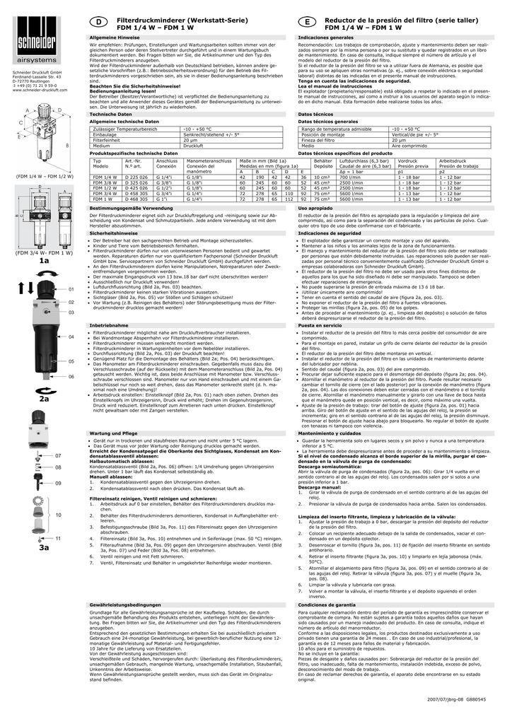 Filterdruckminderer (Werkstatt-Serie) FDM 1/4 W – FDM 1 W Schneider Druckluft GmbH Ferdinand-Lassalle Str. 43 D-72770 Reutlingen +49 (0) 71 21 9 59-0 www.schneider-druckluft.com Reductor de la presión del filtro (serie taller) FDM 1/4 W – FDM 1 W Allgemeine Hinweise Indicaciones generales Wir empfehlen: Prüfungen, Einstellungen und Wartungsarbeiten sollten immer von der gleichen Person oder deren Stellvertreter durchgeführt und in einem Wartungsbuch dokumentiert werden. Bei Fragen bitten wir Sie, die Artikelnummer und den Typ des Filterdruckminderers anzugeben. Wird der Filterdruckminderer außerhalb von Deutschland betrieben, können andere gesetzliche Vorschriften (z.B.: Betriebssicherheitsverordnung) für den Betrieb des Filterdruckminderers vorgeschrieben sein, als sie in dieser Bedienungsanleitung beschrieben sind. Beachten Sie die Sicherheitshinweise! Bedienungsanleitung lesen! Der Betreiber (Besitzer/Verantwortliche) ist verpflichtet die Bedienungsanleitung zu beachten und alle Anwender dieses Gerätes gemäß der Bedienungsanleitung zu unterweisen. Die Unterweisung ist jährlich zu wiederholen. Recomendación: Los trabajos de comprobación, ajuste y mantenimiento deben ser realizados siempre por la misma persona o por su sustituto y quedar registrados en un libro de mantenimiento. En caso de consulta, indique siempre el número de artículo y el modelo del reductor de la presión del filtro. Si el reductor de la presión del filtro se va a utilizar fuera de Alemania, es posible que para su uso se apliquen otras normativas (p. ej., sobre conexión eléctrica o seguridad laboral) distintas de las indicadas en el presente manual de instrucciones. Tenga en cuenta las indicaciones de seguridad. Lea el manual de instrucciones El explotador (propietario/responsable) está obligado a respetar lo indicado en el presente manual de instrucciones, así como a instruir a los usuarios del aparato según lo indicado en dicho manual. Esta formación debe realizarse todos los años. Technische Daten Datos técnicos Allgemeine technische Daten Datos técnicos generales Zulässiger Temperaturbereich Einbaulage Filterfeinheit Medium Rango de temperatura admisible Posición de montaje Fineza del filtro Medio -10 - +50 °C Senkrecht/stehend +/- 5° 20 µm Druckluft Produktspezifische technische Daten (FDM 1/4 W – FDM 1/2 W) Typ Modelo Art.-Nr. N.º art. Anschluss Conexión FDM FDM FDM FDM FDM D D D D D G G G G G 1/4 W 3/8 W 1/2 W 3/4 W 1W 225 325 425 458 468 026 026 026 305 305 1/4"i 3/8"i 1/2"i 3/4"i 1"i Datos técnicos específicos del producto Manometeranschluss Conexión del manómetro G 1/8"i G 1/8"i G 1/8"i G 1/4"i G 1/4"i Maße in mm (Bild 1a) Medidas en mm (figura 1a) A B C D 42 190 42 42 60 245 60 60 60 245 60 60 72 278 65 110 72 278 65 112 1a 10 45 45 75 75 cm³ cm³ cm³ cm³ cm³ Vordruck Presión previa p1 1 - 18 bar 1 - 18 bar 1 - 18 bar 1 - 13 bar 1 - 13 bar Arbeitsdruck Presión de trabajo p2 1 - 12 bar 1 - 12 bar 1 - 12 bar 1 - 12 bar 1 - 12 bar Uso apropiado El reductor de la presión del filtro es apropiado para la regulación y limpieza del aire comprimido, así como para la separación del condensado y las partículas de polvo. Cualquier otro tipo de uso debe confirmarse con el fabricante. • Der Betreiber hat den sachgerechten Betrieb und Montage sicherzustellen. • Kinder und Tiere vom Betriebsbereich fernhalten. • Filterdruckminderer dürfen nur von unterwiesenen Personen bedient und gewartet werden. Reparaturen dürfen nur von qualifiziertem Fachpersonal (Schneider Druckluft GmbH bzw. Servicepartnern von Schneider Druckluft GmbH) durchgeführt werden. • An den Filterdruckminderern dürfen keine Manipulationen, Notreparaturen oder Zweckentfremdungen vorgenommen werden. • Der maximale Eingangsdruck von 13 bzw.18 bar darf nicht überschritten werden! • Ausschließlich nur Druckluft verwenden! • Luftdurchflussrichtung (Bild 2a, Pos. 03) beachten. • Filterdruckminderer keinen starken Vibrationen aussetzen. • Sichtgläser (Bild 2a, Pos. 05) vor Stößen und Schlägen schützen! • Vor Wartung (z.B. Reinigen des Behälters) oder Störungsbeseitigung muss der Filterdruckminderer drucklos gemacht werden! Inbetriebnahme Filterdruckminderer möglichst nahe am Druckluftverbraucher installieren. Bei Wandmontage Absperrhahn vor Filterdruckminderer installieren. Filterdruckminderer müssen senkrecht montiert werden. Filterdruckminderer in Wartungseinheiten vor dem Nebelöler installieren. Durchflussrichtung (Bild 2a, Pos. 03) der Druckluft beachten! Genügend Platz für die Demontage des Behälters (Bild 2a; Pos. 04) berücksichtigen. Das Manometer am Filterdruckminderer einschrauben. Gegebenfalls muss dazu die Verschlussschraube (auf der Rückseite) mit dem Manometeranschluss (Bild 2a, Pos. 04) getauscht werden. Wichtig ist, dass beide Anschlüsse mit Manometer bzw. Verschlussschraube verschlossen sind. Manometer nur von Hand einschrauben und mit einem Gabelschlüssel nur noch so weit drehen, dass das Manometer senkrecht steht (d. h. maximal noch eine Umdrehung)! • Arbeitsdruck einstellen: Einstellknopf (Bild 2a, Pos. 01) nach oben ziehen. Drehen des Einstellknopfs im Uhrzeigersinn, Druck wird erhöht; Drehen im Gegenuhrzeigersinn, Druck wird reduziert. Einstellknopf zum Arretieren nach unten drücken. Einstellknopf nicht gewaltsam oder mit Zangen verstellen. Wartung und Pflege • Gerät nur in trockenen und staubfreien Räumen und nicht unter 5 °C lagern. • Das Gerät muss vor jeder Wartung oder Reinigung drucklos gemacht werden. Erreicht der Kondensatpegel die Oberkante des Sichtglases, Kondensat am Kondensatablassventil ablassen: Halbautomatisch ablassen: Kondensatablassventil (Bild 2a, Pos. 06) öffnen: 1/4 Umdrehung gegen Uhrzeigersinn drehen. Unter 1 bar läuft das Kondensat selbstständig ab. Manuell ablassen: 1. Kondensatablassventil gegen den Uhrzeigersinn drehen. 2. Kondensatablassventil nach oben drücken. Das Kondensat läuft ab. 3a E 36 52 52 92 