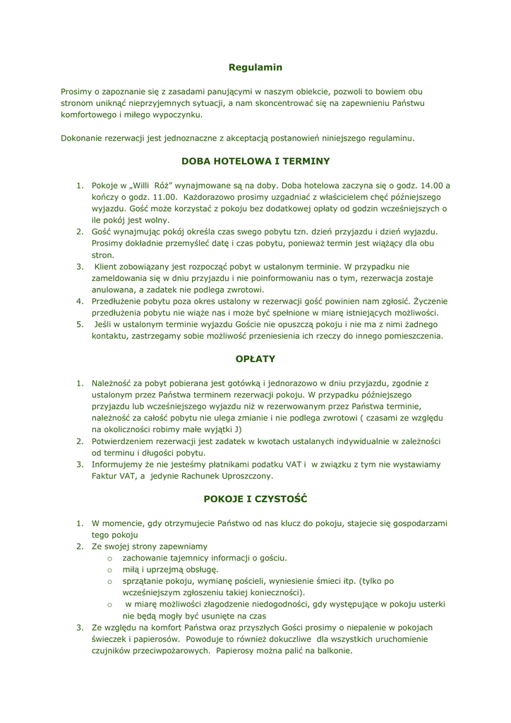 Regulamin Prosimy o zapoznanie się z zasadami panującymi w naszym obiekcie, pozwoli to bowiem obu stronom uniknąć nieprzyjemnych sytuacji, a nam skoncentrować się na zapewnieniu Państwu komfortowego i miłego wypoczynku. Dokonanie rezerwacji jest jednoznaczne z akceptacją postanowień niniejszego regulaminu. DOBA HOTELOWA I TERMINY 1. Pokoje w „Willi Róż” wynajmowane są na doby. Doba hotelowa zaczyna się o godz. 14.00 a kończy o godz. 11.00. Każdorazowo prosimy uzgadniać z właścicielem chęć późniejszego wyjazdu. Gość może korzystać z pokoju bez dodatkowej opłaty od godzin wcześniejszych o ile pokój jest wolny. 2. Gość wynajmując pokój określa czas swego pobytu tzn. dzień przyjazdu i dzień wyjazdu. Prosimy dokładnie przemyśleć datę i czas pobytu, ponieważ termin jest wiążący dla obu 3. stron. Klient zobowiązany jest rozpocząć pobyt w ustalonym terminie. W przypadku nie zameldowania się w dniu przyjazdu i nie poinformowaniu nas o tym, rezerwacja zostaje anulowana, a zadatek nie podlega zwrotowi. 4. Przedłużenie pobytu poza okres ustalony w rezerwacji gość powinien nam zgłosić. Życzenie przedłużenia pobytu nie wiąże nas i może być spełnione w miarę istniejących możliwości. 5. Jeśli w ustalonym terminie wyjazdu Goście nie opuszczą pokoju i nie ma z nimi żadnego kontaktu, zastrzegamy sobie możliwość przeniesienia ich rzeczy do innego pomieszczenia. OPŁATY 1. Należność za pobyt pobierana jest gotówką i jednorazowo w dniu przyjazdu, zgodnie z ustalonym przez Państwa terminem rezerwacji pokoju. W przypadku późniejszego przyjazdu lub wcześniejszego wyjazdu niż w rezerwowanym przez Państwa terminie, należność za całość pobytu nie ulega zmianie i nie podlega zwrotowi ( czasami ze względu na okoliczności robimy małe wyjątki J) 2. Potwierdzeniem rezerwacji jest zadatek w kwotach ustalanych indywidualnie w zależności od terminu i długości pobytu. 3. Informujemy że nie jesteśmy płatnikami podatku VAT i w związku z tym nie wystawiamy Faktur VAT, a jedynie Rachunek Uproszczony. POKOJE I CZYSTOŚĆ 1. W momencie, gdy otrzymujecie Państwo od nas klucz do pokoju, stajecie się gospodarzami tego pokoju 2. Ze swojej strony zapewniamy o zachowanie tajemnicy informacji o gościu. o o o miłą i uprzejmą obsługę. sprzątanie pokoju, wymianę pościeli, wyniesienie śmieci itp. (tylko po wcześniejszym zgłoszeniu takiej konieczności). w miarę możliwości złagodzenie niedogodności, gdy występujące w pokoju usterki nie będą mogły być usunięte na czas 3. Ze względu na komfort Państwa oraz przyszłych Gości prosimy o niepalenie w pokojach świeczek i papierosów. Powoduje to również dokuczliwe dla wszystkich uruchomienie czujników przeciwpożarowych. Papierosy można palić na balkonie. 4. Prosimy nie wnosić do pokoi sprzętu sportowego, rowerów, części wyposażenia samochodu itp. Przedmioty nie będące rzeczami osobistego użytku prosimy pozostawić w miejscu wskazanym przez właściciela. 5. Prosimy również o nie wprowadzanie na teren domu i posesji żadnych zwierząt. 6. Ze względu na wymagania ochrony przeciwpożarowej, w pokojach nie wolno używać jakichkolwiek przyrządów lub aparatów zasilanych energią elektryczną, np. grzałki , farelki, itp. nie stanowiących wyposażenia tych pomieszczeń. Wyjątkiem są: ładowarki telefonów, zasilacze komputerów i RTV, golarki i suszarki do włosów. Niedozwolone jest również używanie ognia otwartego. 7. Osoby nie zameldowane w Willi Róż mogą przebywać w pokoju do godz. 22.00. 8. Cisza nocna obowiązuje od godz. 22:00 do godz. 7:00. 9. W godzinach ciszy nocnej Goście mają obowiązek takiego zachowania, by w żaden sposób nie zakłócało ono spokoju innych Gości. 10. W wypadkach losowych (pęknięcie rury, zalanie, spięcie elektryczne...)właściciel i obsługa ma prawo wejść do zajmowanego przez gościa pokoju bez jego zgody celem uśnięcia awarii lub gdy jest to niemożliwe aby zabezpieczyć mienie gości i zminimalizować szkody. ODPOWIEDZIALNOŚĆ MATERIALNA 1. Gość ponosi odpowiedzialność materialną za wszelkiego rodzaju uszkodzenia lub zniszczenia przedmiotów wyposażenia i urządzeń technicznych Willi Róż, powstałych z jego winy lub winy odwiedzających go gości. Każdy rodzic (opiekun), odpowiedzialny jest za szkody wyrządzone przez dzieci. 2. W przypadku zagubienia kluczy, koszt dorobienia kompletu wynosi 30zł. 3. Gość powinien zawiadomić właściciela o wystąpieniu szkody niezwłocznie po jej stwierdzeniu. Prosimy o nie dokonywanie napraw we własnym zakresie. BEZPIECZEŃSTWO 1. Korzystanie przez dzieci z urządzeń znajdujących się na placu zabaw, trampoliny i basenu odbywa się wyłącznie pod opieką rodziców lub opiekunów. Szczególnie prosimy nie zostawiać dzieci bez nadzoru w okolicach basenu. Nie ponosimy odpowiedzialności za wypadki. 2. W przypadku niestosownego zachowania innych gości należy to niezwłocznie zgłosić. Nielegalne, obraźliwe i awanturnicze zachowanie nie będzie tolerowane. PRAWA I OBOWIĄZKI 1. Willa Róż świadczy usługi zgodnie ze swoją kategorią i standardem (agroturystyka, pokoje gościnne). 2. Nie odpowiadamy za rzeczy wartościowe pozostawione bez nadzoru w pokojach oraz miejscach ogólnodostępnych. Bardzo prosimy zawsze zamykać drzwi i okna opuszczając pokój. (Nigdy nie zanotowaliśmy w Willi Róż kradzieży i zrobimy wszystko, aby nie było pierwszego razu) 3. Parking przy Willi Róż jest bezpłatny, niestrzeżony i nieogrodzony, dlatego nie ponosimy odpowiedzialności za zniszczenie lub kradzież samochodu lub innego pojazdu, oraz mienia w nim się znajdującego należącego do Gościa pensjonatu. 4. Nie odpowiadamy za niedogodności powstałe z przyczyn od nas niezależnych, np. przerwy w dostawie prądu lub łącza internetowego ( wi-fi) itp. 5. Zastrzegamy sobie prawo odmowy przyjęcia gościa, który podczas poprzedniego pobytu raż