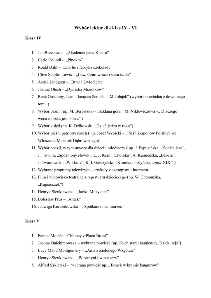 Wybór lektur dla klas IV - VI Klasa IV 1. Jan Brzechwa – „Akademia pana Kleksa” 2. Carlo Collodi - „Pinokio” 3. Roald Dahl – „Charlie i fabryka czekolady” 4. Clive Staples Lewis – „Lew, Czarownica i stara szafa” 5. Astrid Lindgren – „Bracia Lwie Serce” 6. Joanna Olech – „Dynastia Miziołkow” 7. René Gościnny, Jean – Jacques Sempé – „Mikołajek” (wybór opowiadań z dowolnego tomu ) 8. Wybór baśni ( np. M. Berowska – „Szklana góra”; M. Niklewiczowa –„ Dlaczego woda morska jest słona?”) 9. Wybór kolęd (np. K. Dzikowski, „Dzień jeden w roku”) 10. Wybór pieśni patriotycznych ( np. Józef Wybicki – „Pieśń Legionów Polskich we Włoszech, Mazurek Dąbrowskiego) 11. Wybór poezji, w tym utwory dla dzieci i młodzieży ( np. J. Papuzińska, „Koniec lata”, J. Tuwim, „Spóźniony słowik”, L. J. Kern, „Choinka”, A. Kamieńska, „Babcia”, J. Twardowski, „W klasie”, K. I. Gałczyński, „Kronika olsztyńska, część XIX ” ) 12. Wybrane programy telewizyjne, artykuły z czasopism i Internetu 13. Film i widowisko teatralne z repertuaru dziecięcego (np. W. Chotomska, „Kopciuszek”) 14. Henryk Sienkiewicz – „Janko Muzykant” 15. Bolesław Prus – „Antek” 16. Jadwiga Korczakowska – „Spotkanie nad morzem” Klasa V 1. Ferenc Molnár- „Chłopcy z Placu Broni” 2. Joanna Onichimowska – wybrana powieść (np. Duch starej kamienicy, Daleki rejs”) 3. Lucy Maud Montgomery – „Ania z Zielonego Wzgórza” 4. Henryk Sienkiewicz – „W pustyni i w puszczy” 5. Alfred Szklarski – wybrana powieść np. „Tomek w krainie kangurów” 6. Dorota Terakowska – „Władca Lewawu” 7. Mark Twain – „Przygody Tomka Sawyera” 8. Moony Wicher – „Dziewczynka z Szóstego Księżyca” 9. Juliusz Verne – „W 80 dni dookoła świata” 10. Wybór mitów greckich i legend ( np. Jan Parandowski, „Stworzenie świata”, Wanda Markowska, „Mit o Syzyfie”, Nikos Chadzinikolau, „Prometeusz” ) 11. Wybór kolęd (np. Joseph Mohr, „Cicha noc”) 12. Wybór pieśni patriotycznych ( np. Stanisław Ryszard Dobrowolski, „Być może”, Marek Gaszyński , Czesław Niemen, „Sen o Warszawie”) 13. Wybór poezji, w tym utwory dla dzieci i młodzieży (np. Stanisław Grochowiak, „Na słotę”, Urszula Kozioł, „Pożegnanie z dziadziem”, Joanna Kulmowa „Marzenia”, Kazimierz Wierzyński, „Zapach”, Czesław Miłosz, „Ojciec w bibliotece” ) 14. Film i widowisko teatralne z repertuaru dziecięcego. 15. Wybrane programy telewizyjne, artykuły z czasopism i Internetu 16. Bolesław Prus – „Katarynka” Klasa VI 1. Frances Hodgson Burnett – „Tajemniczy ogród” 2. Antonina Domańska – „Historia żółtej ciżemki” 3. Irena Jurgielewiczowa – „Ten obcy” 4. Stanisław Lem – „Bajki robotów” 5. Kornel Makuszyński – „Szatan z siódmej klasy” 6. Aleksander Minkowski – „Dolina światła” 7. Edmund Niziurski – wybrana powieść (np. Sposób na Alcybiadesa”) 8. John Ronald Tolkien – „Hobbit, czyli tam i z powrotem” 9. Wybór kolęd (np. Franciszek Karpiński, „Bóg się rodzi” ) 10. Wybór pieśni patriotycznych (np. K. I. Gałczyński, „Pieśń o żołnierzach z Westerplatte, Rajnold Suchodolski , „Mazurek 3 Maja) 11. Wybór poezji , w tym utwory dla dzieci i młodzieży (no. Zbigniew Herbert, „Pan od przyrody”, Wisława Szymborska, „Limeryki”, Mieczysława Buczkowska, „Wieczór zimowy”, Czesław Janczarski, „Nie mijam”) 12. Film i widowisko teatralne 13. Adaptacja filmowa i teatralna 14. Wybrane programy telewizyjne, artykuły z czasopism i Internetu 15. Maria Dąbrowska - „Marcin Kozera”