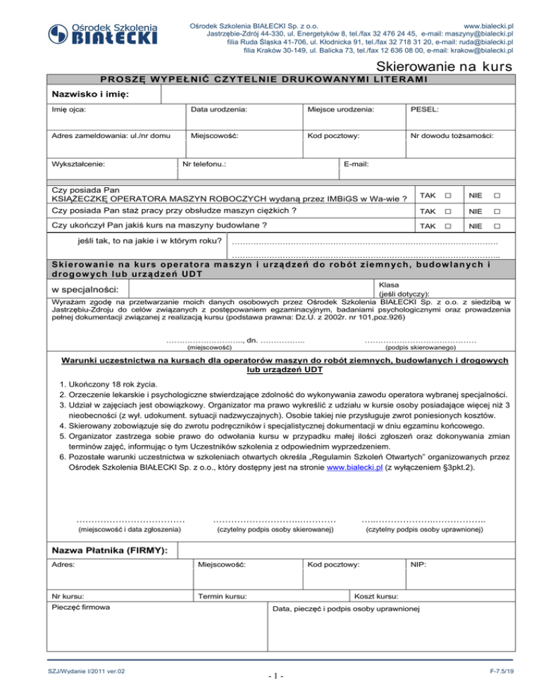 Ośrodek Szkolenia BIAŁECKI Sp. z o.o. www.bialecki.pl Jastrzębie-Zdrój 44-330, ul. Energetyków 8, tel./fax 32 476 24 45, e-mail: [email protected] filia Ruda Śląska 41-706, ul. Kłodnicka 91, tel./fax 32 718 31 20, e-mail: [email protected] filia Kraków 30-149, ul. Balicka 73, tel./fax 12 636 08 00, e-mail: [email protected] Skierowanie na kurs PRO SZ Ę WY PEŁ NI Ć CZY TEL NI E DR UK O WANYM I LI TE RAM I Nazwisko i imię: Imię ojca: Data urodzenia: Miejsce urodzenia: PESEL: Adres zameldowania: ul./nr domu Miejscowość: Kod pocztowy: Nr dowodu tożsamości: Wykształcenie: Nr telefonu.: E-mail: Czy posiada Pan KSIĄŻECZKĘ OPERATORA MASZYN ROBOCZYCH wydaną przez IMBiGS w Wa-wie ? TAK □ NIE □ Czy posiada Pan staż pracy przy obsłudze maszyn ciężkich ? TAK NIE Czy ukończył Pan jakiś kurs na maszyny budowlane ? TAK □ □ □ □ jeśli tak, to na jakie i w którym roku? NIE ………………………………………………………………………………………. ……………………………………………………………………………………….. S ki e ro w an i e n a ku rs o p e r at o ra m a sz yn i u rz ą d z e ń d o ro b ó t z ie mn ych , b u d o w l an ych i d ro g o w ych l u b u rz ąd z eń UDT Klasa (jeśli dotyczy): Wyrażam zgodę na przetwarzanie moich danych osobowych przez Ośrodek Szkolenia BIAŁECKI Sp. z o.o. z siedzibą w Jastrzębiu-Zdroju do celów związanych z postępowaniem egzaminacyjnym, badaniami psychologicznymi oraz prowadzenia pełnej dokumentacji związanej z realizacją kursu (podstawa prawna: Dz.U. z 2002r. nr 101,poz.926) w specjalności: ……………………….., dn. …………….. …………………………………… (miejscowość) (podpis skierowanego) Warunki uczestnictwa na kursach dla operatorów maszyn do robót ziemnych, budowlanych i drogowych lub urządzeń UDT 1. Ukończony 18 rok życia. 2. Orzeczenie lekarskie i psychologiczne stwierdzające zdolność do wykonywania zawodu operatora wybranej specjalności. 3. Udział w zajęciach jest obowiązkowy. Organizator ma prawo wykreślić z udziału w kursie osoby posiadające więcej niż 3 nieobecności (z wył. udokument. sytuacji nadzwyczajnych). Osobie takiej nie przysługuje zwrot poniesionych kosztów. 4. Skierowany zobowiązuje się do zwrotu podręczników i specjalistycznej dokumentacji w dniu egzaminu końcowego. 5. Organizator zastrzega sobie prawo do odwołania kursu w przypadku małej ilości zgłoszeń oraz dokonywania zmian terminów zajęć, informując o tym Uczestników szkolenia z odpowiednim wyprzedzeniem. 6. Pozostałe warunki uczestnictwa w szkoleniach otwartych określa „Regulamin Szkoleń Otwartych” organizowanych przez Ośrodek Szkolenia BIAŁECKI Sp. z o.o., który dostępny jest na stronie www.bialecki.pl (z wyłączeniem §3pkt.2). ……………………………… ………………………..………… …..………………..…………….. (miejscowość i data zgłoszenia) (czytelny podpis osoby skierowanej) (czytelny podpis osoby uprawnionej) Nazwa Płatnika (FIRMY): Adres: Miejscowość: Nr kursu: Termin kursu: Pieczęć firmowa SZJ/Wydanie I/2011 ver.02 Kod pocztowy: NIP: Koszt kursu: Data, pieczęć i podpis osoby uprawnionej -1- F-7.5/19 Ośrodek Szkolenia BIAŁECKI Sp. z o.o. www.bialecki.pl Jastrzębie-Zdrój 44-330, ul. Energetyków 8, tel./fax 32 476 24 45, e-mail: [email protected] filia Ruda Śląska 41-706, ul. Kłodnicka 91, tel./fax 32 718 31 20, e-mail: [email protected] filia Kraków 30-149, ul. Balicka 73, tel./fax 12 636 08 00, e-mail: [email protected] REGULAMIN SZKOLEŃ OTWARTYCH organizowanych przez Ośrodek Szkolenia BIAŁECKI Sp. z o.o. §1 Informacje ogólne 1. Niniejszy regulamin określa zasady udziału w szkoleniach otwartych organizowanych przez Ośrodek Szkolenia BIAŁECKI Sp. z o.o. z siedzibą w Jastrzębiu-Zdroju, ul. Energetyków 8. 2. Niniejszy regulamin obowiązuje od dnia 02.05.2011r. do odwołania. §2 Definicje 1. Szkolenie otwarte - szkolenie, na które może się zapisać każda osoba zainteresowana tematem szkolenia. 2. Organizator - Ośrodek Szkolenia BIAŁECKI Sp. z o.o. z siedzibą w Jastrzębiu-Zdroju, ul. Energetyków 8 oraz wszystkie filie i placówki. 3. Zgłaszający - osoba fizyczna lub prawna zgłaszająca uczestnika/ów na szkolenie, zobowiązana do uiszczenia należności za szkolenie. Zgłaszający nie musi być jednocześnie Uczestnikiem szkolenia. 4. Uczestnik - osoba, która wyraża chęć uczestnictwa w szkoleniu poprzez przesłanie wypełnionego „Formularza zgłoszenia uczestnictwa w szkoleniu” lub „Skierowania na kurs”. 5. Formularz zgłoszeniowy - „Formularz zgłoszenia uczestnictwa w szkoleniu” lub „Skierowanie na kurs” zamieszczony na stronie www.bialecki.pl, za pomocą którego Zgłaszający określa zapotrzebowanie na szkolenie. 6. Zgłoszenie - wypełniony przez Zgłaszającego „Formularz zgłoszenia uczestnictwa w szkoleniu” lub „Skierowanie na kurs”. 7. Potwierdzenie - e-mail, fax lub wiadomość telefoniczna przekazana do Zgłaszającego, potwierdzająca wpisanie na listę uczestników. 8. Rezygnacja ze szkolenia – pisemna lub telefoniczna rezygnacja Zgłaszającego o wycofaniu Uczestnika/ów z udziału w szkoleniu. 9. Opłata – kwota, równoważna cenie wybranego szkolenia, którą zobowiązany jest wnieść Zamawiający. §3 Warunki uczestnictwa w szkoleniu 1. Warunkiem uczestnictwa w szkoleniu jest przesłanie wypełnionego Formularza zgłoszeniowego na adres e-mail, fax-em lub poprzez osobiste dostarczenie do Organizatora. 2. Po otrzymaniu wypełnionego formularza zgłoszeniowego Organizator potwierdza przyjęcie formularza zgłoszeniowego Zgłaszającego na miejscu lub w przypadku zgłoszeń e-mail lub fax-em w terminie 2 dni roboczych e-mailem lub fax-em. 3. Liczba uczestników na szkolenia jest ograniczona. O wpisie na listę uczestników decyduje kolejność zgłoszeń, potwierdzony