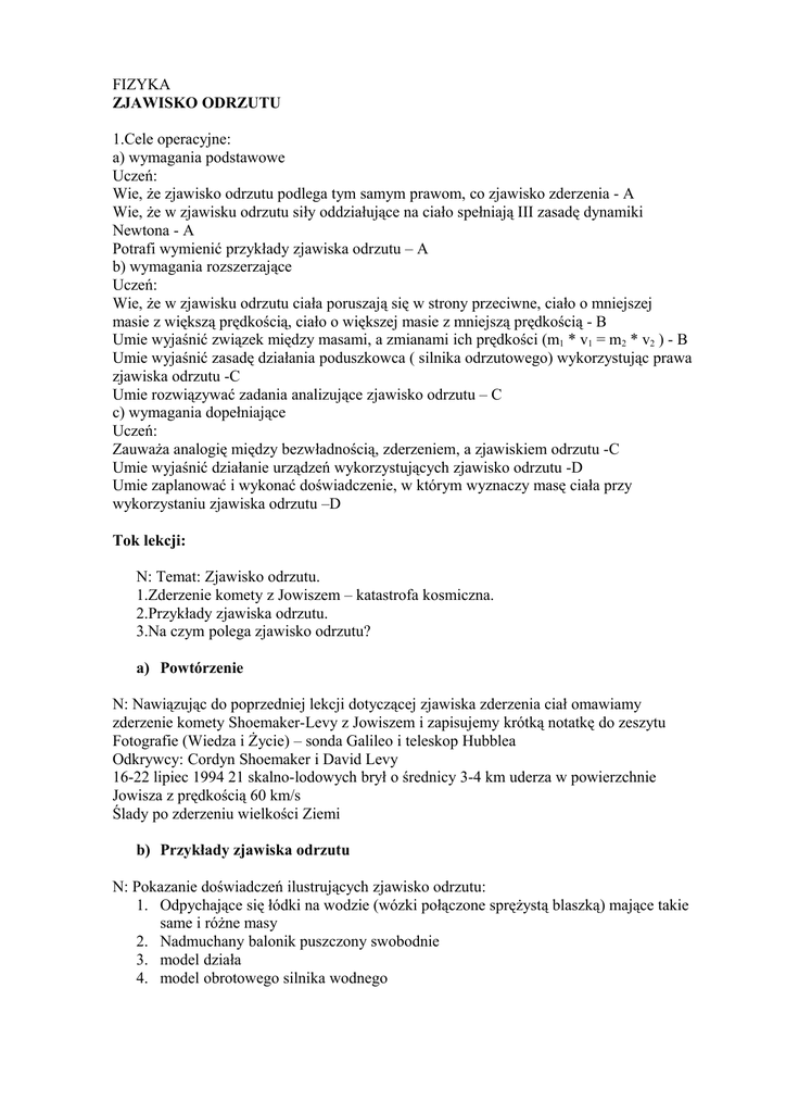 FIZYKA ZJAWISKO ODRZUTU 1.Cele operacyjne: a) wymagania
