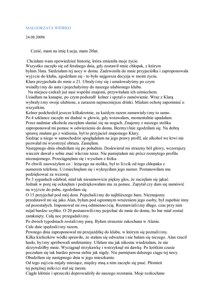 MAŁGORZATA WIÓRKO 24.08.2009r Cześć, mam na imię Łucja, mam 20lat. Chciałam wam opowiedzieć historię, która zmieniła moje życie. Wszystko zaczęło się od feralnego dnia, gdy zostawił mnie chłopak, z którym byłam 3lata. Siedziałam tej nocy w domu. Zadzwoniła do mnie przyjaciółka i zaproponowała wyjście do klubu, zgodziłam się - to było najgorsza decyzja w moim życiu. Klara przyjechała do mnie o 21. Ubrałyśmy się i umalowałyśmy po czym wsiadłyśmy do auta i pojechałyśmy do naszego ulubionego klubu. Na miejscu czekali już nasi wspólni znajomi, przywitałam ich uśmiechem. Usiadłam na kanapie, po czym podszedł kelner i spytał o zamówienie. Wraz z Klarą wybrałyśmy swoje ulubione, a zarazem najmocniejsze drinki. Miałam ochotę zapomnieć o wszystkim. Kelner podchodził jeszcze kilkakrotnie, za każdym razem zamawiałyśmy to samo. Po 4 szklance zaczęło mi dudnić w głowie, gdy wstawałam, momentalnie upadałam. Przez nadmiar alkoholu zaczęłam słaniać się na nogach. Znajomy z naszego stolika zaproponował mi pomoc w odwiezieniu do domu. Bezmyślnie zgodziłam się. Na dobrą sprawę znałam go z widzenia, był to przyjaciel znajomego Klary. Siedząc u niego w samochodzie spoglądałam na jego prawy profil, ale alkohol we krwi nie pozwalał mi wyostrzyć obrazu. Zasnęłam. Następnego dnia obudziłam się po południu. Doskwierał mi straszny ból głowy, wczorajszy wieczór dawał o sobie znać właśnie teraz. Nie pamiętałam nic prócz rozmytego profilu nieznajomego. Przeciągnęłam się i wyszłam z łóżka. Po chwili zauważyłam co leżącego na stoliku, był to liścik od tego chłopaka z numerem telefonu. Uśmiechnęłam się i wykręciłam jego numer. Postanowiłam mu podziękować za wczoraj. Po 3 sygnałach odebrał, miał tak niesamowicie piękny głos, że zaczęłam się jąkać. Jednak w porę się ocknęłam i podziękowałam mu za pomoc. Zapytał czy dam się namówić na wyjście do pubu, zgodziłam się. O 15 przyjechał pod mój dom. Pojechaliśmy do najbliższego baru. Nieznajomy przedstawił mi się jako Alan, byłam pod ogromnym wrażeniem jego osoby, był zupełnie inny od pozostałych. Imponował mi swą odmiennością. Rozmawialiśmy długo, czas przy nim mijał bardzo szybko. O 20 postanowiliśmy pojechać do mnie do domu, bo bar miał zostać zamknięty. Całą noc przegadaliśmy. Po dwóch tygodniach zostaliśmy parą. Byłam strasznie zakochana w Alanie. Całe dnie spędzaliśmy razem. Pewnego dnia zaproponował mi przejażdżkę do klubu, w którym się poznaliśmy. Kilka kieliszków wódki sprawiło, że stałam się odważna i nie bałam się niczego. Alan rzucił hasło, byśmy spróbowali amfetaminy. Ufałam mu jak nikomu wiedziałam, że nie skrzywdziłby mnie. Wyciągnął strzykawkę i wstrzyknął mi dawkę. Po krótkim czasie poczułam się tak bardzo pewna siebie jak nigdy. Nie pamiętam dalszego ciągu tej nocy. Obudziłam się następnego dnia w jego mieszkaniu. Od tego zajścia mijały miesiące, między mną a nim zaczęło się psuć. Płomień tej potężnej miłości stał się żarem. Ciągłe kłótnie i sprzeczki doprowadziły do naszego rozstania. Moje rozkochane serce więdło bez niego. Siedziałam w domu godzinami patrząc na ścianę: nie jadłam, nie piłam, gorączkowałam i doskwierały mi straszne bóle głowy. Nie miałam siły na nic. Wegetowałam tak miesiąc. Udało mi się pozbierać po tym wszystkim, zaczęłam szukać pracy. Znalazłam jedną, która mnie zaciekawiła, ale musiałam zrobić badania. Zrobiłam je. Okazało się, że mam AIDS. Zrozumiałam, że to wszystko zaszło wtedy, gdy zgodziłam się na wzięcie narkotyków zaraziłam się przez igłę. Moje myśli zaczynały chodzić po najgorszych drogach, jak mogłam być tak głupia i się na to zgodzić. Konsekwencje tego będę ponosić już do końca życia. Przez głupią chwilę zapomnienia i toksyczną znajomość umieram. Chciałam podzielić się tu moją historię, aby wyczulić innych na to co robią. Nigdy, ale to przenigdy nie bierzcie żadnych narkotyków, a już na pewno nie dożylnie z jakich podejrzanych zródeł. Róbcie badanie regularnie, wykrycie w porę wirusa pozwala na podanie lekarstw, które umożliwiają choremu stosunkowo normalne funkcjonowanie. Ja wykryłam go za pózno.