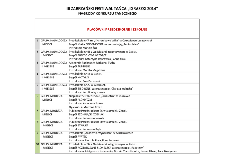 III ZABRZAŃSKI FESTIWAL TAŃCA „IGRASZKI 2014” NAGRODY KONKURSU TANECZNEGO PLACÓWKI PRZEDSZKOLNE I SZKOLNE 1 GRUPA NAJMŁODSZA Przedszkole nr 7 im. „Skarbnikowa Willa” w Czerwionce-Leszczynach I MIEJSCE Zespół MAŁA SIÓDEMECZKA za prezentację „Taniec lalek” Instruktor: Mariola Żak 2 GRUPA NAJMŁODSZA Przedszkole nr 48 z Oddziałami Integracyjnymi w Zabrzu II MIEJSCE Zespół PRZEBOJOWE BRZDĄCE Instruktorzy: Katarzyna Dąbrowska, Anna Łuka 3 GRUPA NAJMŁODSZA Akademia Radosnego Malucha, Tychy III MIEJSCE Zespół TUPTUSIE Instruktor: Monika Magdziorz 4 GRUPA NAJMŁODSZA Przedszkole nr 18 w Zabrzu III MIEJSCE Zespół MOTYLKI Instruktor: Ewa Bartoszek 5 GRUPA NAJMŁODSZA Przedszkole nr 27 w Gliwicach III MIEJSCE Zespół BIEDRONKI za prezentację „Cha-cza malucha” Instruktor: Karolina Jędryszek 6 GRUPA MŁODSZA Niepubliczne Przedszkole „Światełko” w Knurowie I MIEJSCE Zespół PŁOMYCZKI Instruktor: Katarzyna Sufner Opiekun: s. Marzena Drozd 7 GRUPA MŁODSZA Publiczne Przedszkole nr 26 w Jastrzębiu-Zdroju I MIEJSCE Zespół SZOKUJĄCE DZIECIAKI Instruktor: Katarzyna Nowak 8 GRUPA MŁODSZA Publiczne Przedszkole nr 20 w Jastrzębiu-Zdroju II MIEJSCE Zespół STARLET Instruktor: Katarzyna Bryk 9 GRUPA MŁODSZA Przedszkole „Akademia Wyobraźni” w Marklowicach II MIEJSCE Zespół PYRTEK Instruktorzy: Urszula Klaja, Ilona Ledwoń 10 GRUPA MŁODSZA Przedszkole nr 34 z Oddziałami Integracyjnymi w Zabrzu II MIEJSCE Zespół ROZTAŃCZONE SŁONECZKA za prezentację „Radetzky” Instruktorzy: Małgorzata Łaskawska, Dorota Zbraniborska, Janina Sikora, Ewa Strutyńska 11 GRUPA MŁODSZA III MIEJSCE 12 GRUPA MŁODSZA III MIEJSCE 13 GRUPA STARSZA III MIEJSCE Miejskie Przedszkole nr 30 w Rudzie Śląskiej Zespół ŻABKI Instruktorzy: Justyna Chodun, Maria Nowara Przedszkole nr 48 z Oddziałami Integracyjnymi w Zabrzu Zespół BALERINY 2 za prezentację „Kuchareczki” Instruktorzy: Magdalena Ziółkowska, Katarzyna Janusz, Natalia Szczygieł Przedszkole nr 34 z Oddziałami Integracyjnymi w Zabrzu Zespół KUBUSIE Instruktor: Ewa Klimas PLACÓWKI POZASZKOLNE 14 GRUPA MŁODSZA I MIEJSCE 15 GRUPA MŁODSZA II MIEJSCE 16 GRUPA STARSZA I MIEJSCE 17 GRUPA STARSZA I MIEJSCE 18 GRUPA STARSZA I MIEJSCE 19 GRUPA STARSZA I MIEJSCE 20 GRUPA STARSZA II MIEJSCE 21 GRUPA STARSZA III MIEJSCE 22 GRUPA STARSZA III MIEJSCE Fabryka Tańca w Gliwicach Zespół SWEET GANG Instruktor: Magdalena Wrońska-Pacak Młodzieżowy Dom Kultury w Rybniku Zespół MINI MINI FLEX Instruktor: Monika Floryszak Młodzieżowy Dom Kultury w Rybniku Zespół MINI REFLEX za prezentację „Króliczki” Instruktor: Monika Floryszak Bytomski teatr Tańca i Ruchu „Rozbark” w Bytomiu KAROLINA RIEGER za prezentacje „Hiszpański cyrk” Instruktor: Alina Belyagina Studio Tańca Ulicznego OPP 4 w Zabrzu BARTEK OLEJNIK za prezentację „Breakdance” Instruktor: Agata Zeliszek Studio Artystyczne „Maciej” w Zabrzu KINGA WDOWSKA za prezentację „Taniec orientalny” Instruktor: Monika Wdowska Młodzieżowy Dom Kultury w Rybniku Zespół MINI FIGIEL za prezentację „Żaby i bociany” Instruktor: Marzena Butyłkin Studio Tańca „Show Dance” w Knurowie Zespół JAZZ KIDS Instruktor: Roksana Placzyńska Studio Artystyczne „Maciej” w Zabrzu Zespół BALETKI za prezentację „Rada puchaczy” Instruktor: Kimi Łagowska 23 GRUPA STARSZA III MIEJSCE Centrum Edukacji i Rehabilitacji w Zabrzu Zespół MINI GRAFFITI Instruktorzy: Joanna Adamczyk, Agnieszka Kulpa-Wieczorek WYRÓŻNIENIA KONKURSU TANECZNEGO 24 WYRÓŻNIENIE 25 WYRÓŻNIENIE 26 WYRÓŻNIENIE 27 WYRÓŻNIENIE 28 WYRÓŻNIENIE 29 WYRÓŻNIENIE 30 WYRÓŻNIENIE 31 WYRÓŻNIENIE 32 WYRÓŻNIENIE 33 WYRÓŻNIENIE Przedszkole nr 7 im. „Skarbnikowa Willa” w Czerwionce-Leszczynach Zespół SIÓDEMECZKA Instruktorzy: Mariola Żak, Radosław Chodyra Przedszkole nr 28 im. Janoscha w Zabrzu Zespół TYGRYSKOWE KACZKI Instruktor: Justyna Pikińska Przedszkole nr 29 w Zabrzu Zespół WIRUJĄCE BIEDRONKI Instruktor: Joanna Remisz Przedszkole nr 27 w Gliwicach Zespół PSZCZÓŁKI Instruktor: Karolina Jędryszek Niepubliczne Przedszkole Językowe „Smyki” w Tychach Zespół GWIAZDKI Instruktorzy: Danuta Rydz, Halina Kamińska Niepubliczne Przedszkole Językowe „Smyki” w Tychach Zespół SMYKI Instruktorzy: Danuta Rydz, Halina Kamińska, Beata Wypasek Niepubliczne Przedszkole Językowe „Smyki” w Tychach Zespół ROZTAŃCZONE MISIE Instruktor: Marta Fallis Miejski Ośrodek Kultury w Żorach Zespół MINI REAKTYWACJA Instruktorzy: Monika Floryszak, Ewa Żak Przedszkole nr 48 z Oddziałami Integracyjnymi w Zabrzu Zespół BALERINY Instruktorzy: Magdalena Ziółkowska, Beata Myller Przedszkole nr 48 z Oddziałami Integracyjnymi w Zabrzu Zespół BALERINKI Instruktorzy: Magdalena Ziółkowska, Krystyna Antecka 34 WYRÓŻNIENIE 35 WYRÓŻNIENIE 36 WYRÓŻNIENIE 37 WYRÓŻNIENIE 38 WYRÓŻNIENIE 39 WYRÓŻNIENIE 40 WYRÓŻNIENIE 41 WYRÓŻNIENIE 42 WYRÓŻNIENIE 43 WYRÓŻNIENIE 44 WYRÓŻNIENIE 45 WYRÓŻNIENIE 46 WYRÓŻNIENIE Publiczne Przedszkole nr 21 w Jastrzębiu-Zdroju Zespół MINI PRESTIŻ Instruktorzy: Agnieszka Borowiak, Marieta Kalinowska Przedszkole nr 10 w Czerwionce-Leszczynach Zespół BAJLANDO Instruktor: Aleksandra Cieślik, Natalia Grochla Przedszkole „Akademia Wyobraźni” w Marklowicach Zespół WYOBRAŹNIA Instruktorzy: Anna Chodzińska, Maria Klimaszewska Akademia Radosnego Malucha w Tychach Zespół MISIE PYSIE Instruktor: Monika Magdziorz Przedszkole nr 3 w Zabrzu Zespół ZUMBA KIDS Instruktor: Karolina Wojtala Przedszkole nr 34 z Oddziałami Integracyjnymi w Zabrzu Zespół ISKIERKI Instruktorzy: Anna Zientarska, Renata Sobczak Przedszkole nr 24 w Zabrzu Zespół BIEDRONKI Instruktor: Iwona Grzegorzewska Zabrzańskie Stowarzyszenie Cheerleaders „Energy” Zespół ENERGY MINI MINI Instruktor: Natalia Ćwik Szkoła Podstawowa nr 45 w Sosnowcu Grupa taneczne BADOO Instruktor: Małgorzata Żołnierek Niepubliczne Ję
