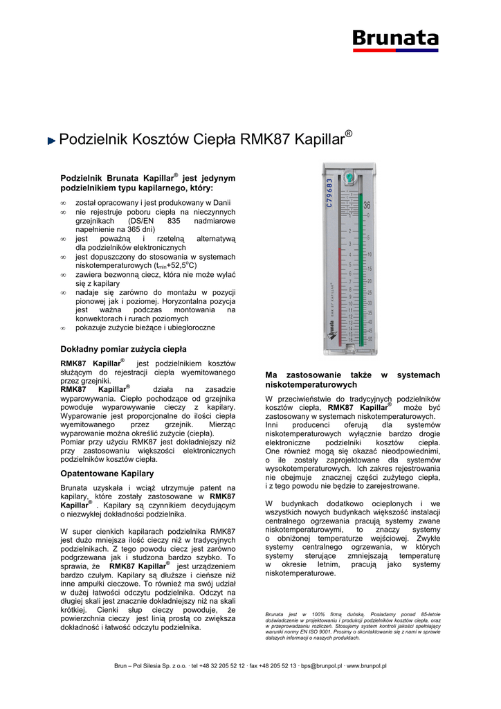 Podzielnik Kosztów Ciepła RMK87 Kapillar® ® Podzielnik Brunata Kapillar jest jedynym podzielnikiem typu kapilarnego, który: • • • • • • • został opracowany i jest produkowany w Danii nie rejestruje poboru ciepła na nieczynnych grzejnikach (DS/EN 835 nadmiarowe napełnienie na 365 dni) jest powaŜną i rzetelną alternatywą dla podzielników elektronicznych jest dopuszczony do stosowania w systemach o niskotemperaturowych (tmin+52,5 C) zawiera bezwonną ciecz, która nie moŜe wylać się z kapilary nadaje się zarówno do montaŜu w pozycji pionowej jak i poziomej. Horyzontalna pozycja jest waŜna podczas montowania na konwektorach i rurach poziomych pokazuje zuŜycie bieŜące i ubiegłoroczne Dokładny pomiar zuŜycia ciepła ® RMK87 Kapillar jest podzielnikiem kosztów słuŜącym do rejestracji ciepła wyemitowanego przez grzejniki. ® RMK87 Kapillar działa na zasadzie wyparowywania. Ciepło pochodzące od grzejnika powoduje wyparowywanie cieczy z kapilary. Wyparowanie jest proporcjonalne do ilości ciepła wyemitowanego przez grzejnik. Mierząc wyparowanie moŜna określić zuŜycie (ciepła). Pomiar przy uŜyciu RMK87 jest dokładniejszy niŜ przy zastosowaniu większości elektronicznych podzielników kosztów ciepła. Opatentowane Kapilary Brunata uzyskała i wciąŜ utrzymuje patent na kapilary, które zostały zastosowane w RMK87 ® Kapillar . Kapilary są czynnikiem decydującym o niezwykłej dokładności podzielnika. W super cienkich kapilarach podzielnika RMK87 jest duŜo mniejsza ilość cieczy niŜ w tradycyjnych podzielnikach. Z tego powodu ciecz jest zarówno podgrzewana jak i studzona bardzo szybko. To ® sprawia, Ŝe RMK87 Kapillar jest urządzeniem bardzo czułym. Kapilary są dłuŜsze i cieńsze niŜ inne ampułki cieczowe. To równieŜ ma swój udział w duŜej łatwości odczytu podzielnika. Odczyt na długiej skali jest znacznie dokładniejszy niŜ na skali krótkiej. Cienki słup cieczy powoduje, Ŝe powierzchnia cieczy jest linią prostą co zwiększa dokładność i łatwość odczytu podzielnika. Ma zastosowanie takŜe niskotemperaturowych w systemach W przeciwieństwie do tradycyjnych podzielników ® kosztów ciepła, RMK87 Kapillar moŜe być zastosowany w systemach niskotemperaturowych. Inni producenci oferują dla systemów niskotemperaturowych wyłącznie bardzo drogie elektroniczne podzielniki kosztów ciepła. One równieŜ mogą się okazać nieodpowiednimi, o ile zostały zaprojektowane dla systemów wysokotemperaturowych. Ich zakres rejestrowania nie obejmuje znacznej części zuŜytego ciepła, i z tego powodu nie będzie to zarejestrowane. W budynkach dodatkowo ocieplonych i we wszystkich nowych budynkach większość instalacji centralnego ogrzewania pracują systemy zwane niskotemperaturowymi, to znaczy systemy o obniŜonej temperaturze wejściowej. Zwykłe systemy centralnego ogrzewania, w których systemy sterujące zmniejszają temperaturę w okresie letnim, pracują jako systemy niskotemperaturowe. Brunata jest w 100% firmą duńską. Posiadamy ponad 85-letnie doświadczenie w projektowaniu i produkcji podzielników kosztów ciepła, oraz w przeprowadzaniu rozliczeń. Stosujemy system kontroli jakości spełniający warunki normy EN ISO 9001. Prosimy o skontaktowanie się z nami w sprawie dalszych informacji o naszych produktach. Brun – Pol Silesia Sp. z o.o. · tel +48 32 205 52 12 · fax +48 205 52 13 · [email protected] · www.brunpol.pl Nie rejestruje poboru ciepła na nieczynnych grzejnikach Dane techniczne Ciecz znajdująca się w wyparkowych podzielnikach kosztów ciepła paruje nieustannie, nie ma znaczenia czy grzejniki są czynne czy teŜ nie. Z tego powodu, kapilary muszą być napełnione w nadmiarze, odpowiadającym dokładnie wielkości całorocznego „jałowego” odparowania. Zasada działania: ® W RMK87 Kapillar nadmiarowe napełnienie jest zgodne z „jałowym” odparowaniem ( na okres 365 dni). Oto dlaczego podzielnik nie rejestruje zuŜycia ciepła na nieczynnych grzejnikach, a wyłącznie rzeczywista część zuŜycia jest podmiotem rozliczenia ciepła. Podzielnik kosztów ciepła Kapillar® , typ wyparkowy Normy: EN 835 (Norma Europejska) DS./EN 834 (Duńska norma) dla podzielników kosztów ciepła typu wyparkowego. Oznaczenie systemu TS27.21 003 Zastosowanie: Zwykłe typy jedno i dwururowego systemu ogrzewania oraz „ systemy niskotemperaturowe” Inne będące na rynku wyparkowe podzielniki kosztów ciepła posiadają nadmiarowe napełnienie odpowiadające 10 dniom „jałowego” odparowania (jest to minimalny wymóg normy DS./EN835). Dlatego po upływie roku te podzielniki będą zawsze mierzyły zuŜycie – nawet gdy grzejniki były nieuŜywane. To rejestrowanie fałszywego zuŜycia stanowi część rozliczenia ciepła, które wywołuje wielką irytację u wszystkich składających skargi klientów. Ograniczenia zastosowania (rozpiętość temperatur) Bezpieczne w uŜyciu RMK87 Kapillar® 40-0240-A Podzielnik kosztów ciepła Kapillar® do montowania na zwijanych rurach spiralnych Z powodu efektu kapilarnego, ciecz nie moŜe wylać się z opatentowanej kapilary w przypadku jej stłuczenia czy teŜ odwrócenia otworem w dół („do góry nogami”). Ciecz 1-heksanol Cykloheksanol Toluen tmin 52,5oC 52,50C 60oC tmax 88oC 95oC 120oC Oznaczenia typów RMK87 Kapillar® 40-020-A Podzielnik kosztów ciepła Kapillar® do montowania na grzejnikach Podziałka (skala) Skala produktu (dla konkretnego typu grzejnika) lub skala jednostek (wymaga przeliczenia odczytu) Długość: 90 mm Ciecz Oznaczenie: 1-heksagon, Cykloheksanol, Toluen Ilość: Powierzchnia: 0,3 cm3 3,10 mm2 Wymiary i waga 135 x 38 x 15 mm, około 95 g (w zaleŜności od rodzaju tylnej płytki) Sposób montaŜu Poziomy lub pionowy Brun – Pol Silesia Sp. z o.o. · tel +48 32 205 52 12 · fax +48 205 52 13 · [email protected] · www.brunpol.pl