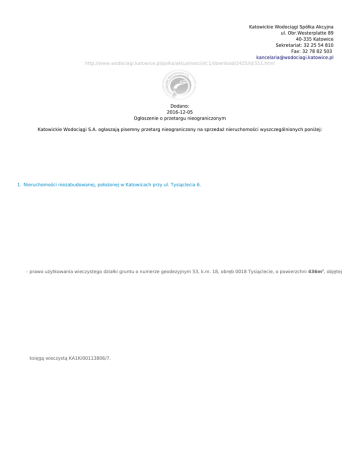 Katowickie Wodociągi Spółka Akcyjna ul. Obr.Westerplatte 89 40-335 Katowice Sekretariat: 32 25 54 810 Fax: 32 78 82 503 [email protected] http://www.wodociagi.katowice.pl/polka/aktualnosci/st:1/download/2425/id:511.html Dodano: 2016-12-05 Ogłoszenie o przetargu nieograniczonym Katowickie Wodociągi S.A. ogłaszają pisemny przetarg nieograniczony na sprzedaż nieruchomości wyszczególnionych poniżej: 1. Nieruchomości niezabudowanej, położonej w Katowicach przy ul. Tysiąclecia 6. ❍ prawo użytkowania wieczystego działki gruntu o numerze geodezyjnym 53, k.m. 18, obręb 0018 Tysiąclecie, o powierzchni 436m2, objętej księgą wieczystą KA1K/00113806/7. ❍ Nieruchomość objęta umową dzierżawy dla spółdzielni mieszkaniowej pod parking ❍ W planie zagospodarowania obszar oznaczony jest symbolem 10IT - teren infrastruktury technicznej. ■ Cena wywoławcza netto nieruchomości: 120 894 zł. ■ Wadium: 12 000 zł. ■ Minimalne postąpienie: 1 200 zł. ■ Do ceny osiągniętej w przetargu zostanie doliczony 23% podatek od towarów i usług VAT. 2. Nieruchomości niezabudowanej, położonej w Katowicach przy ul. Bolesława Chrobrego 31. ❍ prawo użytkowania wieczystego działki gruntu o numerze geodezyjnym 25, k.m. 18, obręb 0018 Tysiąclecie, o powierzchni 917m2, objętej księgą wieczystą KA1K/00113806/7. ❍ Nieruchomość objęta umową dzierżawy dla spółdzielni mieszkaniowej pod parking ❍ W planie zagospodarowania obszar oznaczony jest symbolem 4IT – teren infrastruktury technicznej. ■ Cena wywoławcza netto nieruchomości: 254 266 zł. ■ Wadium: 26 000 zł. ■ Minimalne postąpienie: 2 600,00 zł. ■ Do ceny osiągniętej w przetargu zostanie doliczony 23% podatek od towarów i usług VAT. 3. Nieruchomości niezabudowanej, położonej w Katowicach przy ul. Bolesława Chrobrego 37. ❍ prawo użytkowania wieczystego działki gruntu o numerze geodezyjnym 26, k.m. 18, obręb 0018 Tysiąclecie, o powierzchni 862m2, objętej księgą wieczystą KA1K/00113806/7. ❍ Nieruchomość objęta umową dzierżawy dla spółdzielni mieszkaniowej pod parking ❍ W planie zagospodarowania obszar oznaczony jest symbolem 5IT – teren infrastruktury technicznej. ■ Cena wywoławcza netto nieruchomości: 239 015 zł. ■ Wadium: 24 000 zł. ■ Minimalne postąpienie: 2 400,00 zł. ■ Do ceny osiągniętej w przetargu zostanie doliczony 23% podatek od towarów i usług VAT. 4. Nieruchomości zabudowanej, położonej w Katowicach przy ul. Wiertniczej. ❍ prawo użytkowania wieczystego działki gruntu o numerze geodezyjnym 753/72, k.m. 1, obręb 0004 Dąbrówka Mała, o powierzchni 1132m2, objętej księgą wieczystą KA1K/00050134/5. ❍ prawo własności budynku hydroforni i dwóch podziemnych zbiorników. ❍ Na terenie działki znajduje się stacja transformatorowa będąca we władaniu TAURON Dystrybucja S.A. W studium zagospodarowania obszar ten oznaczony jest symbolem Uc2 – obszar wielko powierzchniowych centrów handlowo-usługowych. ■ Cena wywoławcza netto nieruchomości: 221 370 zł. ■ Wadium: 22 000 zł. ■ Minimalne postąpienie: 2 200,00 zł. 5. Nieruchomości zabudowanej, położonej w Katowicach przy ul. Ułańskiej 16. ❍ prawo użytkowania wieczystego działki gruntu o numerze geodezyjnym 4, k.m. 18, obręb 0018 Tysiąclecie, o powierzchni 838m2, objętej księgą wieczystą KA1K/00113806/7. ❍ prawo własności budynku hydroforni, dwóch podziemnych zbiorników i ogrodzenia. ❍ Na terenie działki znajduje się stacja transformatorowa będąca we władaniu TAURON Dystrybucja S.A. W planie zagospodarowania obszar oznaczony jest symbolem 1IT – teren infrastruktury technicznej. ■ Cena wywoławcza netto nieruchomości: 235 850 zł. ■ Wadium: 24 000 zł. ■ Minimalne postąpienie: 2 400,00 zł. 6. Nieruchomości niezabudowanej, położonej w Katowicach przy ul. Gen. Jankego. ❍ prawo własności działki gruntu o numerze geodezyjnym 18/4, k.m. 114, obręb 0003 Ligota, o powierzchni 1237m2, objętej księgą wieczystą KA1K/00028666/0. ❍ Przez teren działki przebiega wodociąg o średnicy 500mm. Wymagane jest zawarcie umowy służebności dla powyższego wodociągu. ❍ W planie zagospodarowania obszar oznaczony jest symbolem MG – teren zabudowy mieszkaniowej jednorodzinnej z dopuszczeniem działalności wytwórczej w obrębie działki. ■ Cena wywoławcza netto nieruchomości: 180 194 zł. ■ Wadium: 18 000 zł. ■ Minimalne postąpienie: 1 800,00 zł. Do ceny osiągniętej w przetargu zostanie doliczony 23% podatek od towarów i usług VAT. 7. Nieruchomości zabudowanej, położonej w Katowicach przy ul. Piastów 5A. ❍ prawo użytkowania wieczystego działki gruntu o numerze geodezyjnym 79/1, k.m. 18, obręb 0018 Tysiąclecie, o powierzchni 755m2, objętej księgą wieczystą KA1K/00062504/7. ❍ prawo własności budynku warsztatowego, dwóch podziemnych zbiorników i ogrodzenia. ❍ Na terenie działki znajduje się stacja transformatorowa będąca we władaniu TAURON Dystrybucja S.A. W planie zagospodarowania obszar oznaczony jest symbolem 11IT – teren infrastruktury technicznej. ■ Cena wywoławcza netto nieruchomości: 320 495 zł. ■ Wadium: 32 000 zł. ■ Minimalne postąpienie: 3 200,00 zł. Oględzin nieruchomości można dokonać po wcześniejszym uzgodnieniu terminu z Kierownikiem Działu Administracyjno – Gospodarczego tel. 32 788 26 08 W przetargu mogą brać udział osoby fizyczne i prawne. Pisemna ofertę należy złożyć w zaklejonej kopercie opatrzonej napisem „Przetarg – sprzedaż nieruchomości położonej w Katowicach przy ul …………..”, do dnia: 11.01.2017r. do godziny 10:30 w siedzibie Sprzedającego: Katowickie Wodociągi S.A. ul. Obrońców Westerplatte 89, 40-335 Katowice – Biuro Obsługi Klienta, Dział Zamówień Publicznych lub drogą pocztową. O dotrzymaniu terminu złożenia oferty decyduje data wpływu. Oferta powinna być sporządzona w języku polskim i zawierać: 1. da
