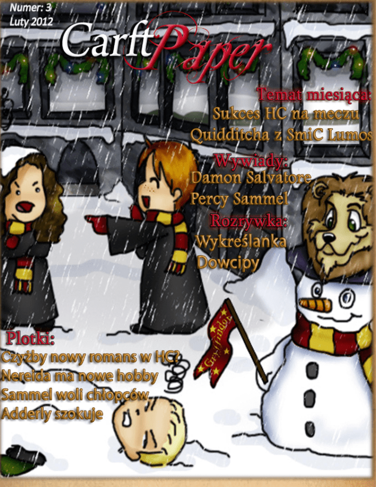 1 2 Wywiad przeprowadził Martin Granger 3 21 stycznia 2012r. o godz. 19.30 na stadionie został rozegrany towarzyski mecz Quidditcha – SMiC Lumos kontra Hogwart Carft. Już w kilka chwil po wybiciu umownej godziny, sędzia Fineasz wygłosił krótkie pouczenia na temat uczciwości na boisku. Lakowim Sullivan, kapitan naszej drużyny, grający na pozycji ścigającego wraz z Dulce Cortez oraz Aprill Williams starali się z całych sił zachować kamienną twarz. Vipera Snape, grająca na pozycji obrońcy jak zwykle wykrzywiła ironicznie usta, a Damon Salvatore, uśmiechał się szeroko, niczym Gilderoy Lockhart, do każdego kibica, jakiego ujrzał w promieniu kilku metrów. Nic dodać, nic ująć – pełna gotowość. Drużyna przeciwników również nie próżnowała – Henri Lucas – kapitan drużyny, Nick DeuMus oraz Magik McVeigh, grający na pozycji ścigającego mimo poważnych min, wydawali się całkowicie spokojni i pewni wygranej. Chace McCarson, obrońca oraz Lucas Spell, szukający SMiC Lumos nerwowo rozglądali się na boki, oceniając swe szanse w tym meczu. No cóż, nie ma się co dziwić – frekwencja na meczu dopisała.W kilka sekund później gracze wsiedli na swe wyścigowe miotły, a sędzia dał sygnał do rozpoczęcia gry. Mecz zaczął się ostro. Kafel został przekazywany z rąk do rąk – raz dla SMiCL, raz dla HC. Widać było, że podania były niedokładne i drużyny walczyły o jak najszybsze odebranie przeciwnikowi kafla. Po krótkiej szamotaninie Nick DeuMus niedokładnie podał kafla do Henriego Lucasa, co wykorzystał kapitan naszej drużyny, przekazując kafla dalej Dulce Cortez, która strzeliła pierwszą bramkę dla HC. Widać było, że po tym strzale drużyna SMiCL starała się odrobić straty- zaczeła wbijać raz po raz kafla do pętli, jednak dzięki brawurowym akcją Vipery Snape zostało to udaremnione. W kilka minut później kolejny gol wbił Lakowim Sullivan, dzięki podaniu od Dulce Cortez. Napięcie na boisku z minuty na minutę rosło, a jak goli nie było, tak nie ma. W kilka chwil później gra została przerwana ze względu na sprawy techniczne – kapitan drużyny Lumos miał złe komendy w podawaniu, natomiast sędziemu obecni na boisku zaczeli spamować priva, utrudniając pracę. Po szybkim wznowieniu gry, drużyna Lumos poprosiła o dwie pod rząd przerwy techniczne. Co cóż, minęło 22 minut gry, a tu żadnych punktów nie przybywało. Kapitan drużyny SMiCL dokonał zmiany w składzie - Chace McCarson, zszedł z obrońcy, na rzecz Ginny Vanya, jednocześnie wbijając na pozycję ścigającego, za Magika McVeigh’a. Po przerwach Nick DeuMus niedokładnie podaje, co powoduje ostrą kontrę ze strony HC, a tym samym kolejnym, trzecim golem dla HC, wbitym przez Lakowima Sullivana. Po ostrym ataku, nastąpiło otrzeźwienie ze strony SMiCL, Chace McCarson wbija pierwszego gola dla drużyny, dając wynik 30:10 dla HC. Mimo dalszych wysiłków nie udało się SMiCL kolejny raz podejść naszego obrońcę, co było najprawdopodobniej przyczyną coraz większych frustracji doprowadzając do rzutu karnego dla HC, zakończonego czwartym golem, dzięki bezbłędnemu strzałowi Dulce Cortez. Po ponad trzydziestominutowej grze pojawił się złoty znicz, złapany przez szukającego HC – Damona Salvatore – co tym samym kończyło grę, dając wynik 190:10 dla HC. Po krótkich wiwatach naszej drużyny i podziękowaniu ze strony SMiC Lumos gracze opuścili boisko. 4 5 W dzisiejszym artykule postaram przybliżyć wszystkim postać „ukochanego” profesora astronomii – pana Lakowima Sullivana. Na pierwszy rzut oka każdy powiedziałby, że nie ma w nim nic nadzwyczajnego – ot zwykły profesorek z niebieściutkimi oczętami i brązowymi włosami. Pomimo swego wieku (nie przyznaje się otwarcie ile ma lat, zachowując się przy tym jak baba, lecz moje reporterskie oko uznaje go na mężczyznę z 40 na karku – niby niewiele, lecz lata młodości już za nim) wciąż kipi humorem i ciętymi ripostami. Nie do końca wiadomo, skąd pochodzi i czy ma jakąkolwiek rodzinę – mało było wiadomo o jego dzieciństwie. Aż do czasu, gdy rozpoczął nauczać astronomii! Oj tak, Lakoś znany jest ze swych jakże ciekawych lekcji! Jak stwierdziła pewna uczennica, jego zajęcia składają się na pilnowaniem dyscypliny niczym Wielki Inkwizytor, szczegółowym tłumaczeniu zajęć, a następnie wieeelkiemu odpytywaniu. Nic więc dziwnego, że część uczniów na same słowo Lakowim i astronomia oblewają się zimnym potem. Do dziś dnia najbardziej znanym żartem Lakowima do straszenia adeptów sztuk magicznych jest przysłowiowa „kartkówka z gwiazdozbiorów”. Znany jest ze swych chamskich odpowiedzi i nadeptywaniu ludziom na odcisk. Nic dodać nic ująć – osoba, która go zrozumie jest jedną na milion! Lakowim jest uczciwy jak łza i zawsze powie ci co myśli, choćby miał paść! Oj tak, lepiej z nim nie zadzierać. Jak dowiedziałam się od mojego anonimowego informatora, raz ośmielił się skraść puchar Turnieju Trójmagicznego Domów w pewnej szkole, w której nauczał, gdyż uczniowie, którzy walczyli o puchar, nie zasłużyli w jego mniemaniu na niego! No cóż… Po tej historii w Świętym Mungu leczyli go aż 3 tygodnie! Pomijając te drobne wady, kobiety zawsze go uwielbiały! Pewnie ciekawi was, komu Sullivan oddał swe serce? No cóż.. I tu zaczyna robić się ciekawie. Nikt by nie uwierzył, że Lakoś to lekkoduch, który lubi skakać z kwiatka na kwiatek! I ani myśli o ożenku, pomimo nieślubnych dzieci! Lakowim Sullivan w dawnych czasach, gdy nauczał w Triadicy, znany był ze swoich skłonności homoseksualnych – otwarcie przyznawał się do związku z Darkenem Quilochem, nauczycielem OPCM w Triadicy. Jednak czy faktycznie mieli się ku sobie? Ciężko stwierdzić – może była to zasłona dymna, chroniąca go przed tłumem napalonych na niego czarownic? Wiadomo było przecież, ze Vipera Snape 