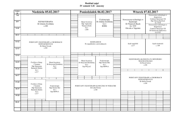 Rozkład zajęć IV semestr LIC zaoczny Godzi na Niedziela 05.02.2017 Poniedziałek 06.02.2017 Wtorek 07.02.2017 Nowoczesne technologie w fizjoterapii Dr Wojciech Rusek Gr. NTF Ośr.reh.w Tajęcinie Nowoczesne technologie w diagnostyce Centrum Innowacji UR Mgr Maciej Rachwał Gr. NTD Nowoczesne technologie w diagnostyce Centrum Innowacji UR Dr Katarzyna Zajkiewicz Gr.NTD Język angielski s.217 Język niemiecki s. 109 7-8 8-9 FIZYKOTERAPIA Dr Jolanta Zwolińska s.108 9-10 Masaż leczniczy Mgr Agnieszka Wąsacz-Żurek Gr.1 s.206 Fizykoterapia Dr Jolanta Zwolińska Gr.2 RORE 10-11 11-12 12-13 PODSTAWY FIZJOTERAPII w CHOROBACH WEWNĘTRZNYCH Dr Maria Nowak s.108 SEMINARIUM Po uzgodnieniu z prowadzącym 13-14 14-15 15-16 Fiz.klin.w Ortop. i Traumat. Mgr Katarzyna Bazarnik-Mucha Gr.1 s.217 Masaż leczniczy Dr Krzysztof Kołodziej Gr.2 s.206 Masaż leczniczy Dr Krzysztof Kołodziej Gr.2 Szp.Woj.nr2 Fizykoterapia Mgr Dorota Bać Gr.1 Szp.MSWiA FIZJOTERAPIA KLINICZNA W ORTOPEDII I TRAUMATOLOGII Dr Paweł Jaźwa s.108 16-17 PODSTAWY FIZJOTERAPII w CHOROBACH WEWNĘTRZNYCH Dr Maria Nowak s.108 17-18 18-19 19-20 20-21 Fiz.klin.w Ortop. i Traumat. Mgr Katarzyna Bazarnik-Mucha Gr.2 s.217 Fizykoterapia Mgr Dorota Bać Gr.1 Szp.MSWiA PODSTAWY FIZJOTERAPII KLINICZNEJ W PEDIATRII Dr Lidia Perenc s.108 Rozkład zajęć IV semestr LIC zaoczny Godzi na Środa 08.02.2017 Czwartek 09.02.2017 7-8 8-9 Masaż leczniczy Dr Krzysztof Kołodziej Gr.2 s.206 9-10 Fiz.klin.w Ortop. i Traumat. Mgr Katarzyna Bazarnik-Mucha Gr.1 s.217 Nowoczesne technologie w fizjoterapii Dr Wojciech Rusek Gr. NTF Szp. w Tajęcinie Nowoczesne technologie w diagnostyce Centrum Innowacji UR Dr Mariusz Drużbicki Gr.NTD Nowoczesne technologie w diagnostyce Centrum Innowacji UR Dr Grzegorz Magoń Gr.NTD Piątek 10.02.2017 PODSTAWY STATYSTYKI MEDYCZNEJ Dr Julian Skrzypiec s.108 10-11 11-12 12-13 Fizykoterapia Mgr Dorota Bać Gr.1 Szp.MSWiA Fiz.klin.w Ortop. i Traumat. Mgr Katarzyna Bazarnik-Mucha Gr.2 s.217 SEMINARIUM Po uzgodnieniu z prowadzącym Informatyka Dr Julian Skrzypiec Gr. I s.217 13-14 14-15 15-16 Język angielski s.217 Język niemiecki s. 109 FIZJOTERAPIA KLINICZNA W ORTOPEDII I TRAUMATOLOGII Dr Paweł Jaźwa s.108 FIZJOTERAPIA KLINICZNA W ORTOPEDII I TRAUMATOLOGII Dr Paweł Jaźwa s.108 16-17 17-18 18-19 19-20 20-21 Trening motoryczny Dr Daniel Szymczyk Gr.TM sala 012 Podstawy fizjoterapii klinicznej w fizjoterapii Dr Bartosz Korczowski Szp.Woj. nr2 Mała Aula PODSTAWY FIZJOTERAPII KLINICZNEJ W PEDIATRII Dr Lidia Perenc s.108 Rozkład zajęć II semestr SUM zaoczny Godzi na Sobota 11.02.2017 Niedziela 12.02.2017 PODSTAWY FIZJOTERAPII w CHOROBACH WEWNĘTRZNYCH Dr Maria Nowak s.108 FIZYKOTERAPIA Dr Jolanta Zwolińska s.108 7-8 8-9 9-10 10-11 11-12 Podst.fizjot.w ch. wewn. Dr Maria Nowak Gr I s. 217 Fizykoterapia Dr Jolanta Zwolińska Gr.2 s. 102 Fizykoterapia Mgr Dorota Bać Gr.1 s.115 12-13 13-14 14-15 Fiz.klin.w Ortop. i Traumat. Mgr Katarzyna Bazarnik-Mucha Gr.1 s.217 Masaż leczniczy Dr Krzysztof Kołodziej Gr.2 s.206 PODSTAWY STATYSTYKI MEDYCZNEJ Dr Julian Skrzypiec s.108 Fiz.klin.w Ortop. i Traumat. Mgr Katarzyna Bazarnik-Mucha Gr.2 s.217 Masaż leczniczy Mgr Agnieszka Wąsacz-Żurek Gr.1 s.206 Informatyka Dr Julian Skrzypiec Gr. I s.217 15-16 16-17 17-18 18-19 19-20 20-21