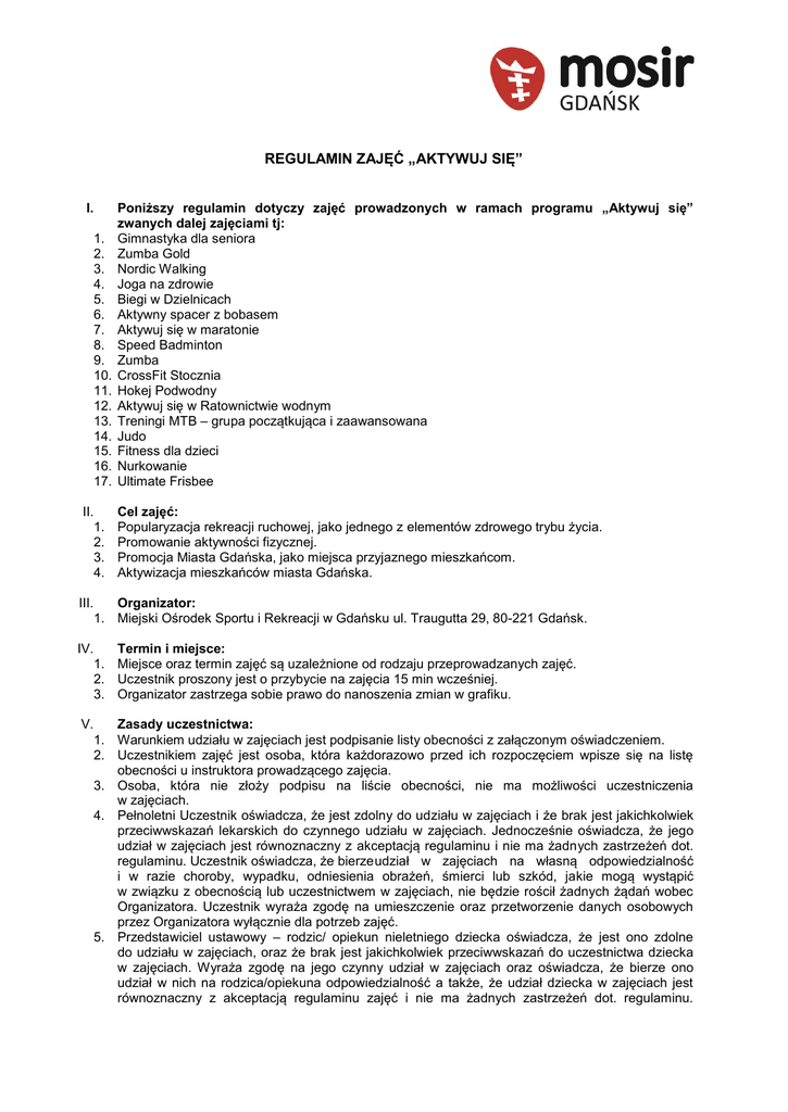 REGULAMIN ZAJĘĆ „AKTYWUJ SIĘ” 1. 2. 3. 4. 5. 6. 7. 8. 9. 10. 11. 12. 13. 14. 15. 16. 17. Poniższy regulamin dotyczy zajęć prowadzonych w ramach programu „Aktywuj się” zwanych dalej zajęciami tj: Gimnastyka dla seniora Zumba Gold Nordic Walking Joga na zdrowie Biegi w Dzielnicach Aktywny spacer z bobasem Aktywuj się w maratonie Speed Badminton Zumba CrossFit Stocznia Hokej Podwodny Aktywuj się w Ratownictwie wodnym Treningi MTB – grupa początkująca i zaawansowana Judo Fitness dla dzieci Nurkowanie Ultimate Frisbee 1. 2. 3. 4. Cel zajęć: Popularyzacja rekreacji ruchowej, jako jednego z elementów zdrowego trybu życia. Promowanie aktywności fizycznej. Promocja Miasta Gdańska, jako miejsca przyjaznego mieszkańcom. Aktywizacja mieszkańców miasta Gdańska. I. II. III. Organizator: 1. Miejski Ośrodek Sportu i Rekreacji w Gdańsku ul. Traugutta 29, 80-221 Gdańsk. IV. Termin i miejsce: 1. Miejsce oraz termin zajęć są uzależnione od rodzaju przeprowadzanych zajęć. 2. Uczestnik proszony jest o przybycie na zajęcia 15 min wcześniej. 3. Organizator zastrzega sobie prawo do nanoszenia zmian w grafiku. V. Zasady uczestnictwa: 1. Warunkiem udziału w zajęciach jest podpisanie listy obecności z załączonym oświadczeniem. 2. Uczestnikiem zajęć jest osoba, która każdorazowo przed ich rozpoczęciem wpisze się na listę obecności u instruktora prowadzącego zajęcia. 3. Osoba, która nie złoży podpisu na liście obecności, nie ma możliwości uczestniczenia w zajęciach. 4. Pełnoletni Uczestnik oświadcza, że jest zdolny do udziału w zajęciach i że brak jest jakichkolwiek przeciwwskazań lekarskich do czynnego udziału w zajęciach. Jednocześnie oświadcza, że jego udział w zajęciach jest równoznaczny z akceptacją regulaminu i nie ma żadnych zastrzeżeń dot. regulaminu. Uczestnik oświadcza, że bierze udział w zajęciach na własną odpowiedzialność i w razie choroby, wypadku, odniesienia obrażeń, śmierci lub szkód, jakie mogą wystąpić w związku z obecnością lub uczestnictwem w zajęciach, nie będzie rościł żadnych żądań wobec Organizatora. Uczestnik wyraża zgodę na umieszczenie oraz przetworzenie danych osobowych przez Organizatora wyłącznie dla potrzeb zajęć. 5. Przedstawiciel ustawowy – rodzic/ opiekun nieletniego dziecka oświadcza, że jest ono zdolne do udziału w zajęciach, oraz że brak jest jakichkolwiek przeciwwskazań do uczestnictwa dziecka w zajęciach. Wyraża zgodę na jego czynny udział w zajęciach oraz oświadcza, że bierze ono udział w nich na rodzica/opiekuna odpowiedzialność a także, że udział dziecka w zajęciach jest równoznaczny z akceptacją regulaminu zajęć i nie ma żadnych zastrzeżeń dot. regulaminu. 6. 7. 8. 9. 10. 11. 12. VI. Opiekun/rodzic jednocześnie oświadcza, że w razie choroby, wypadku, odniesienia obrażeń, śmierci lub szkód, jakie mogą wystąpić u dziecka w związku z obecnością lub uczestnictwem w tych zajęciach, nie będzie rościł żadnych żądań wobec Organizatora. Wyraża zgodę na umieszczenie i przetworzenie danych osobowych przez Organizatorów wyłącznie dla potrzeb zajęć. Każdy Uczestnik zajęć przed przystąpieniem do pierwszych zajęć zobowiązany jest do przeczytania i zaakceptowania powyższego regulaminu. Uczestnik jest zobowiązany do posiadania stroju sportowego a w przypadku zajęć odbywających się w hali sportowej do przebrania obuwia. Uczestnicy biorący udział w zajęciach zobowiązani są do przestrzegania poleceń instruktora. Uczestnicy oraz przedstawiciele ustawowi wyrażają zgodę na wykorzystywanie przez Organizatora zdjęć i materiałów wideo z wizerunkiem Uczestników zajęć, wykonanych podczas zajęć z udziałem Uczestników, do własnych działań marketingowych i promocyjnych i nie będą z tego tytułu zgłaszać żadnych roszczeń, w tym pieniężnych. Zabrania się wnoszenia na miejsce zajęć przedmiotów, które mogą być niebezpieczne dla innych Uczestników. Podczas zajęć obowiązuje bezwzględny zakaz palenia, spożywania alkoholu oraz innych środków odurzających. Uczestnicy niestosujący się do zasad regulaminu, zakłócający spokój pozostałych Uczestników, zachowujący się agresywnie lub będący w stanie po spożyciu alkoholu zostaną pozbawieni prawa uczestniczenia zajęciach. Postanowienia końcowe: 1. Organizator nie odpowiada za rzeczy pozostawione bez opieki. 2. Organizator jest ubezpieczony od odpowiedzialności cywilnej wobec Uczestników zajęć. Jednocześnie informuje, iż nie zapewnia jakiegokolwiek ubezpieczenia na życie, zdrowotnego lub od odpowiedzialności cywilnej z tytułu choroby, wypadku, odniesienia obrażeń, poniesienia śmierci lub poniesienia jakichkolwiek strat bądź szkód, jakie mogą wystąpić w związku z obecnością i/lub uczestnictwem w zajęciach. 3. Uczestnik uczestniczy w zajęciach wyłącznie na własną odpowiedzialność i ponosi związane z tym ryzyko. Wszyscy Uczestnicy przyjmują do wiadomości, że udział w zajęciach wiąże się z wysiłkiem fizycznym i pociąga za sobą naturalne ryzyko i zagrożenie wypadkami, możliwość odniesienia obrażeń ciała i urazów fizycznych (w tym śmierci). Wpisanie się na listę obecności oznacza, że Uczestnik rozważył i ocenił charakter, zakres i stopień ryzyka wiążącego się z uczestnictwem w zajęciach i dobrowolnie zdecydował się podjąć to ryzyko, startując w zajęciach wyłącznie na własną odpowiedzialność. 4. Organizator zaleca Uczestnikom wykonanie profilaktycznych badań lekarskich mogących potwierdzić brak przeciwwskazań do udziału w zajęciach. 5. W przypadku wystąpienia niepokojących objawów w trakcie wykonywania ćwiczeń tj. w szczególności znaczne pogorszenie samopoczucia, bóle kręgosłupa, stawów, mdłości, zawroty głowy i inne – należy przerwać wykonywanie ćwiczeń i zgłosić dolegliwości instruktorowi. 6. Harmonogram zajęć znajduje się na