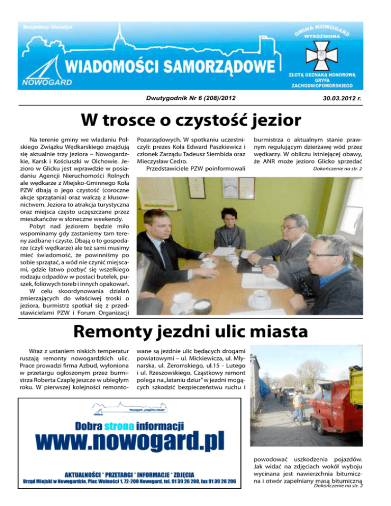 Dwutygodnik Nr 6 (208)/2012 30.03.2012 r. W trosce o czystość jezior Na terenie gminy we władaniu Polskiego Związku Wędkarskiego znajdują się aktualnie trzy jeziora – Nowogardzkie, Karsk i Kościuszki w Olchowie. Jezioro w Glicku jest wprawdzie w posiadaniu Agencji Nieruchomości Rolnych ale wędkarze z Miejsko-Gminnego Koła PZW dbają o jego czystość (coroczne akcje sprzątania) oraz walczą z kłusownictwem. Jeziora to atrakcja turystyczna oraz miejsca często uczęszczane przez mieszkańców w słoneczne weekendy. Pobyt nad jeziorem będzie miło wspominamy gdy zastaniemy tam tereny zadbane i czyste. Dbają o to gospodarze (czyli wędkarze) ale też sami musimy mieć świadomość, że powinniśmy po sobie sprzątać, a wód nie czynić miejscami, gdzie łatwo pozbyć się wszelkiego rodzaju odpadów w postaci butelek, puszek, foliowych toreb i innych opakowań. W celu skoordynowania działań zmierzających do właściwej troski o jeziora, burmistrz spotkał się z przedstawicielami PZW i Forum Organizacji Pozarządowych. W spotkaniu uczestniczyli: prezes Koła Edward Paszkiewicz i członek Zarządu Tadeusz Siembida oraz Mieczysław Cedro. Przedstawiciele PZW poinformowali burmistrza o aktualnym stanie prawnym regulującym dzierżawę wód przez wędkarzy. W obliczu istniejącej obawy, że ANR może jezioro Glicko sprzedać Dokończenie na str. 2 Remonty jezdni ulic miasta Wraz z ustaniem niskich temperatur ruszają remonty nowogardzkich ulic. Prace prowadzi firma Azbud, wyłoniona w przetargu ogłoszonym przez burmistrza Roberta Czaplę jeszcze w ubiegłym roku. W pierwszej kolejności remonto- wane są jezdnie ulic będących drogami powiatowymi – ul. Mickiewicza, ul. Młynarska, ul. Żeromskiego, ul.15 - Lutego i ul. Rzeszowskiego. Cząstkowy remont polega na „łataniu dziur” w jezdni mogących szkodzić bezpieczeństwu ruchu i powodować uszkodzenia pojazdów. Jak widać na zdjęciach wokół wyboju wycinana jest nawierzchnia bitumiczna i otwór zapełniany masą bitumiczną Dokończenie na str. 2 2 WIADOMOŒCI SAMORZ¥DOWE 30.03.2012 r. Zarządzenie Nr 137 /2012 Burmistrza Nowogardu z dnia 29 marca 2012 roku w sprawie udzielenia kwot dotacji w związku z ogłoszonymi konkursami ofert na realizację zadań publicznych Gminy Nowogard na rok 2012. § 1 Zarządzam następujący podział środków finansowych na rzecz organizacji pozarządowych w Gminie Nowogard: 1. W zakresie zadania: „Wspieranie, organizowanie i upowszechnianie kultury fizycznej i sportu na terenie Gminy Nowogard” 1) Ludowy Uczniowski Klub Sortowy ,,Panorama-Chrabąszcze „ Nowogard - 34 000 zł 2) Ludowy Uczniowski Klub Sportowy ,,Panorama-Chrabąszcze” Nowogard - 4 000 zł 3) Miejsko – Gminne Zrzeszenie Ludowe Zespoły Sportowe w Nowogardzie - 47 000 zł 4) Ludowy Uczniowski Klub Sportowy ,,SIATKARZ” Nowogard – 4 000 zł 5) Klub Sportowy HANDBALL NOWOGARD – 1 000 zł 6) Uczniowski Klub Sportowy ,,Trójka” Nowogard – 12 000 zł 7) Nowogardzkie Centrum Rozwoju Israeli Krav Maga – 2 600 zł 8) Ludowy Uczniowski Klub Sportowy TOP Wierzbięcin – 27 000 zł 9) Nowogardzkie Stowarzyszenie 4X4 OFFROAD FACTORY – 6 000 zł 10) Uczniowski Klub Sportowy „Dwójka” - 3 000 zł 11) Stowarzyszenie Kultury Fizycznej Nowogardzki Klub Tańca Sportowego FLESZ – 13 400 zł 12) LOK KSS,, Tarcza’’ Goleniów Sekcja Strzelecka w Nowogardzie - 25 000 zł 13) Stowarzyszenie Klub Żeglarski „KNAGA” - 18 000 zł 14) Ludowy Klub Sportowy „POMORZANIN” Nowogard – 220 000 zł 15) Klub Motorowy „CISY” Nowogard – 27 000 zł 16) Klub Motorowy „CISY” Nowogard – 25 000 zł 17) Uczniowski Klub Sportowy ,,Jedyneczka” Nowogard – 8 000 zł 18) Ludowy Klub Sportowy „Olimpia” Nowogard - 14000 zł § 2 Zarządzenie wchodzi w życie z dniem podpisania. Burmistrz Nowogardu Robert Czapla Pieniądze dla organizacji rozdane W roku bieżącym dla organizacji pozarządowych gmina Nowogard zabezpieczyła kwotę 678 tysięcy złotych. Środki przyznawane są w drodze konkursów ofert. Dotychczas obyło się ich siedem. Rozstrzygnęliśmy je prawie dwa miesiące wcześniej, niż w ubiegłym roku. To poprawa, jednak mnie osobiście nie satysfakcjonująca. Dlatego stale szukamy z pracownikami urzędu kolejnych rozwiązań, aby fundusze do organizacji pozarządowych trafiały jak najszybciej, w miarę możliwości, na początku roku kalendarzowego. Procedura jest następująca: wnioski organizacji rozpatruje w pierwszej kolejności powołana w tym celu komisja, następnie są one zatwierdzane przez burmistrza. W roku 2011 po ocenie projektów przez komisję konkursową, dokonałem zgodnie ze swoimi kompetencjami kilku zmian w podziale środków. Zostałem za to skrytykowany przez opozycję w Radzie Miejskiej oraz jedną z lokalnych gazet, że stosuję „ręczne sterowanie”. W związku z powyższym, postanowiłem, iż w roku bieżącym nie skorzystam ze swoich uprawnień i nie będę zmieniał wyników i rozstrzygnięć prac komisji oceniającej złożone projekty. Dlatego też, wszystkie dotychczasowe rozstrzygnięcia siedmiu konkursów zostały przeze mnie podpisane w zaproponowanej przez komisje formie. Zdaję sobie sprawę, że zawsze potrzeb jest więcej niż środków. Niektóre organizacje mogą nie uzyskać wnioskowanych funduszy i muszą szukać innych rozwiązań finansowych. Ostatni konkurs na sport, nie pozwala mi na zachowanie bezstronności. Uważam, że klub sportowy „Olimpia” nie może nie otrzymać żadnych środków. Co prawda, tradycji piłkarskiej jeszcze nie posiada, z uwagi na zbyt krótkie istnienie, jednak wpisał się w życie społeczności wiejskiej, głównie Wierzbięcina. Zapoznałem się z wnioskiem klubu „Olimpia”, jak również z finansowaniem klubów „A” klasy w okolicznych gminach. Z pozyskanych informacji, wynika, że: - klub sportowy w Kliniskach Wielkich otrzymuje dofinansowanie 10.000 złotych - klub sportowy w Przybiernowie otrzymuje d