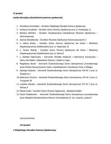 (I grupa) osoby kierujące placówkami pomocy społecznej 1. Mirosława Grochalska - Dyrektor Miejskiego Ośrodka Pomocy Społecznej 2. Krystyna Grzybicka - Dyrektor Domu Pomocy Społecznej przy ul. Pułaskiego 1c 3. Barbara Nalińska - Dyrektor Socjalizacyjnej Całodobowej Placówki Opiekuńczo – Wychowawczej 4. Joanna Wasielewska - Dyrektor Placówki Opiekuńczo Wychowawczej Nr 3 5. s. Halina Rydzy - Dyrektor Domu Pomocy Społecznej dla Dzieci i Młodzieży Niepełnosprawnej Intelektualnie przy ul. Kasprzaka 10 6. s. Teresa Więcek - Dyrektor Domu Pomocy Społecznej dla Dzieci i Młodzieży Niepełnosprawnej Intelektualnie przy ul. Bema 8 7. s. Elżbieta Dąbrowska – kierownik Ośrodka Wsparcia i Interwencji Kryzysowej – Domu dla Matek z Małoletnimi Dziećmi i Kobiet w Ciąży 8. Magdalena Borek - kierownik Środowiskowego Domu Samopomocy prowadzonego przez Polskie Stowarzyszenie Osób z Upośledzeniem Umysłowym Koło w Elblągu 9. Jadwiga Kubacka - kierownik Środowiskowego Domu Samopomocy Filii Nr 1 przy ul. Podgórnej 1 10. Katarzyna Chuchra - kierownik Środowiskowego Domu Samopomocy Filii Nr 2 przy ul. Traugutta 38 11. Ludwika Załuska - kierownik Środowiskowego Domu Samopomocy Filii Nr 3 przy ul. Winnej 9 12. Marek Gulda - Dyrektor Domu Pomocy Społecznej „Niezapominajka” 13. Paweł Gołębiewski - kierownik Środowiskowego Domu Samopomocy prowadzonego przez Elbląskie Stowarzyszenie Pomocy Humanitarnej im. św. Łazarza „Lazarus” oraz pracownicy: (II grupa) z Miejskiego Ośrodka Pomocy Społecznej: 1. Ewa Osowska 2. Ewa Wawrzyniak 3. Izabela Sarnowska 4. Monika Dykowska 5. Małgorzata Łucka – Ott 6. Grażyna Stefanowicz – Burkiewicz 7. Wanda Szostek 8. Małgorzata Pesta – Siwiak 9. Magdalena Falkowska 10. Maria Kida 11. Agnieszka Nalborska (III grupa) z Miejskiego Ośrodka Pomocy Społecznej: 1. Małgorzata Pasztak 2. Małgorzata Taraszkiewicz 3. Joanna Ołoszewska z Domu Pomocy Społecznej „Niezapominajka”: 4. Dariusz Antczak 5. Teresa Arkabus 6. Teresa Bednarska 7. Beata Bielińska 8. Rafał Florek 9. Gabriela Gliszczyńska 10. Ewa Kierbedź (IV grupa) z Domu Pomocy Społecznej „Niezapominajka”: 1. Kamila Kisielewska 2. Małgorzata Krzywulska 3. Jolanta Łucka – Ott 4. 5. 6. 7. Iwona Orłowska – Korszańska Wioletta Saczko Krystyna Szulc Hanna Wolińska z Domu Pomocy Społecznej przy ul. Pułaskiego 1c: 8. Beata Zielińska 9. Katarzyna Danilczyk 10. Jolanta Kasperowicz (V grupa) z Domu Pomocy Społecznej przy ul. Pułaskiego 1c: 1. Iwona Kuczyńska 2. Aldona Kulesza 3. Alicja Czapiewska z Środowiskowego Domu Samopomocy Filii Nr 1 przy ul. Podgórnej 1: 4. Dorota Pliszczyńska z Środowiskowego Dom Samopomocy Filii Nr 2 przy ul. Traugutta 38: 5. Katarzyna Szynkarewicz z Środowiskowego Domu Samopomocy Filii Nr 3 przy ul. Winnej 9: 6. Marlena Rolnik z Socjalizacyjnej Całodobowej Placówki Opiekuńczo – Wychowawczej: 7. Zbigniew Kowalski 8. Ewa Ryfa 9. Renata Sobczyńska 10. Krystyna Syput 11. Małgorzata Zankowicz (VI grupa) z Placówki Opiekuńczo – Wychowawczej Nr 1: 1. Lucyna Makutonowicz z Placówki Opiekuńczo – Wychowawczej Nr 2: 2. Agnieszka Januszewska z Placówki Opiekuńczo - Wychowawczej Nr 3: 3. Elżbieta Czebotar 4. Mariusz Różański 5. Elżbieta Jabłońska z Domu Pomocy Społecznej dla Intelektualnie przy ul. Kasprzaka 10: Dzieci i Młodzieży Niepełnosprawnej Dzieci i Młodzieży Niepełnosprawnej 6. Anna Janiak 7. Irmgarda Jaroszewicz z Domu Pomocy Społecznej Intelektualnie przy ul. Bema 8: dla 8. Joanna Kasprowicz 9. Małgorzata Chudzik 10. Beata Sobieszczuk (VII grupa) z Środowiskowego Domu Samopomocy prowadzonego przez Stowarzyszenie Pomocy Humanitarnej im. sw. Łazarza „Lazarus”: Elbląskie 1. Katarzyna Brzuziewska 2. Irena Podwojska z Środowiskowego Domu Samopomocy prowadzonego przez Stowarzyszenie Osób z Upośledzeniem Umysłowym Koło w Elblągu: 3. 4. 5. 6. 7. 8. 9. Jolanta Gadomska Kamila Rosińska Karolina Kozińczak Adam Grzanowski Edyta Pobłocka Aleksandra Kojtych Weronika Kotlewska Polskie