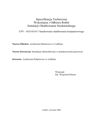 Specyfikacja Techniczna Wykonania i Odbioru Robót Instalacji Okablowania Strukturalnego CPV - 45314310-7 Instalowanie okablowania komputerowego Nazwa Obiektu: Archiwum Państwowe w Lublinie Nazwa Inwestycji: Instalacja teletechniczna w pomieszczeniu pracowni. Inwestor: Archiwum Państwowe w Lublinie Wykonał: Inż. Wojciech Pietras Lublin, wrzesień 2006 1. Pojęcia podstawowe ...........................................................................................................3 2. Wymagania dotyczące systemu okablowania strukturalnego kat. 5e ...................................4 3. Ogólne warunki wykonania i odbioru robót. .......................................................................6 1. Pojęcia podstawowe normy – sieć winna spełniać wszystkie normy dotyczące strukturalnych sieci komputerowych (logika + energetyka), m.in.: okablowania strukturalnego w budynku, prowadzenia kabli w duktach, okablowania budynków mieszkalnych i komercyjnych, emisji pól elektromagnetycznych, odporności na zakłócenia pól elektromagnetycznych, bezpieczeństwa, itp. standard okablowania - kategoria 5, 5E kabel UTP LSOH. topologia sieci – gwiazda. przyłącza sieciowe – 1 punkt energetyczno-logiczny – [2 x RJ45 + 2 x gniazdo elektryczne z bolcem uziemiającym i blokadą + 1 gniazdo elektryczne ogólnego przeznaczenia bez klucza (zgodnie z projektem rozmieszczenia gniazd) – klucze do blokad w liczbie gniazd elektrycznych (dokładanych), gniazda montowane w kanałach kablowych KI. Nowe gniazda winny zostać opisane zgodnie z zaleceniami Zamawiającego (ustalenia na etapie wykonywania okablowania). sieć elektryczna – wydzielona instalacja energetyczna 3 fazowa, pięcioprzewodowa z izolowanym przewodem N i przewodem uziemiającym PE, wykonana całkowicie przewodami miedzianymi o znamionowym napięciu izolacji 750V, każdy obwód zabezpieczony wyłącznikiem różnicowo-prądowym. Zasilanie wszystkich punktów odbiorczych z rozdzielni w pracowni. dystrybucyjna szafa logiczna –szafa wiszącej stojącą 19” o wysokości 12U, szerokości i głębokości 60 cm z wyposażeniem, wentylatory (mikroprocesorowy sterownik wentylatorów), listwy zasilające (sumarycznie 10 gniazd), zamykana na klucz. Zamontowanie nowych paneli krosujących o złączach RJ45 kat 5E oraz panela ze złączami video do wpiecia kamer. kable krosowe – kategoria 5E typu RJ45-RJ45 pomiary sieci logicznej – długości linii, tłumienia, przesłuchów międzykanałowych, przesłuchów zdalnych między dwiema parami mierzonych w odniesieniu do sygnału źródłowego, rezystancji i impedancji. pomiary sieci energetycznej – rezystancji izolacji przewodów, ciągłości przewodu ochronnego, skuteczności ochrony przeciwporażeniowej przez zastosowane wyłączniki różnicowoprądowe, impedancji pętli zwarcia dla tablicy pracowni. projekt techniczny i dokumentacja powykonawcza – wykonane w narzędziu AutoCad, skala 1:50 (wersja papierowa i elektroniczna), wykonane i zatwierdzone przez osoby z odpowiednimi uprawnieniami (uprawnienia producenta okablowania do projektowania okablowania strukturalnego, uprawnienie do projektowania sieci elektrycznych) nadzór prac - przez osoby z odpowiednimi uprawnieniami (uprawnienia producenta okablowania do wykonywania okablowania strukturalnego, uprawnienie do wykonywania sieci energetycznych) certyfikat i gwarancja – Certyfikat producenta okablowania – minimum 20 letnia gwarancja producenta. oferent – musi posiadać tytuł Authorised System Integrator producenta okablowania. 2. Wymagania dotyczące systemu okablowania strukturalnego kat. 5e oraz okablowania monitoringu. 1. Wszystkie urządzenia stanowiące przedmiot zamówienia powinny być fabrycznie nowe i pochodzić z bieżącej produkcji. 2. Wykonawca zobowiązany jest do sporządzenia i przekazania zamawiającemu szczegółowej dokumentacji powykonawczej zrealizowanego systemu okablowania wraz z wynikami pomiarów dla każdego toru transmisyjnego. Dokumentacja powinna być przekazana w terminie realizacji zamówienia. Stosowne certyfikaty i dokumenty gwarancyjne powinny być przekazane w przeciągu miesiąca od daty odbioru. 3. Pasywne elementy połączeniowe sieci powinny posiadać świadectwa niezależnego laboratorium badawczego, np. Laboratorium GHMT. 4. System okablowania strukturalnego powinien zapewniać wszystkie elementy toru transmisyjnego (kable instalacyjne, kable krosowe, gniazda przyłączeniowe, panele rozdzielcze) zarówno miedziane jak i światłowodowe. 5. Należy zastosować system okablowania strukturalnego w wersji nieekranowanej (UTP). 6. System okablowania strukturalnego w części opartej na miedzi powinien spełniać wymagania klasy D wg normy ISO/IEC 11801:2002 zarówno w odniesieniu do zastosowanych poszczególnych komponentów (kategoria 5e) jak i do całości systemu rozpatrywanego jako Channel i Permanent Link (rozumianych zgodnie z definicją ww. norm). 7. System okablowania strukturalnego powinien zapewniać modularną budowę gwarantującą: a. zastosowanie w jednym i tym samym typie gniazd różnych interfejsów (RJ45, MT-RJ, RJ12), b. konstrukcja modułów RJ45 zastosowanych w gniazdach przyłączeniowych powinna umożliwiać ich przyszłą, łatwą wymianę na moduły kategorii 6 bez konieczności wymiany obudów gniazd, c. każdy moduł powinien mieć możliwość rozszycia kabla według schematu T568A i T568B, d. zastosowane w gniazdach przyłączeniowych moduły RJ45 powinny umożliwiać bezproblemowy ich montaż w najpopularniejszych oprawach gniazd przyłączeniowych zgodnych ze stosowanym w obiektach systemem gniazd elektroinstalacyjnych. W związku z powyższym zalecany jest system okablowania wykorzystujący moduły RJ45 typu „keystone”. 8. Jako kabel instalacyjny miedziany należy użyć skrętki czteroparowej nieekranowanej kategorii 5e UTP w powłoce LSOH (Low Smoke Zero Halogen) o impedancji 100W±5W. 9. Kable krosowe i przyłączeniowe powinny być minimum