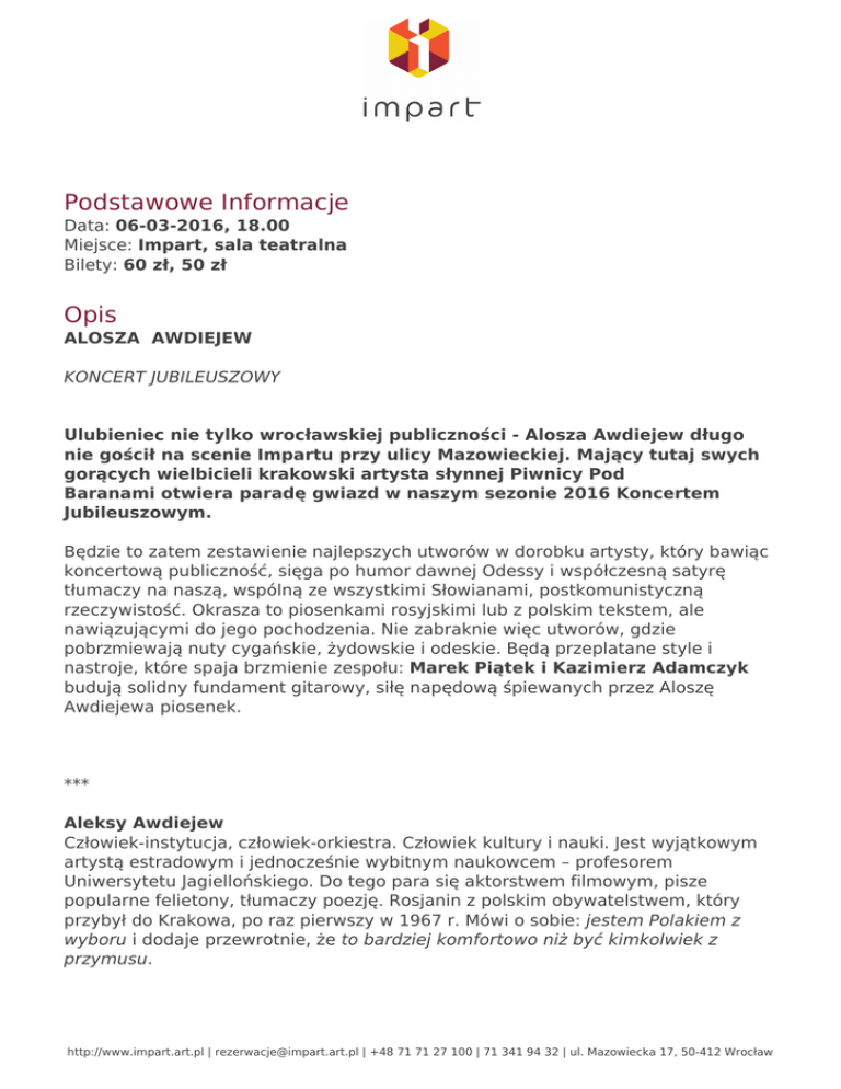 Podstawowe Informacje Data: 06-03-2016, 18.00 Miejsce: Impart, sala teatralna Bilety: 60 zł, 50 zł Opis ALOSZA AWDIEJEW KONCERT JUBILEUSZOWY Ulubieniec nie tylko wrocławskiej publiczności - Alosza Awdiejew długo nie gościł na scenie Impartu przy ulicy Mazowieckiej. Mający tutaj swych gorących wielbicieli krakowski artysta słynnej Piwnicy Pod Baranami otwiera paradę gwiazd w naszym sezonie 2016 Koncertem Jubileuszowym. Będzie to zatem zestawienie najlepszych utworów w dorobku artysty, który bawiąc koncertową publiczność, sięga po humor dawnej Odessy i współczesną satyrę tłumaczy na naszą, wspólną ze wszystkimi Słowianami, postkomunistyczną rzeczywistość. Okrasza to piosenkami rosyjskimi lub z polskim tekstem, ale nawiązującymi do jego pochodzenia. Nie zabraknie więc utworów, gdzie pobrzmiewają nuty cygańskie, żydowskie i odeskie. Będą przeplatane style i nastroje, które spaja brzmienie zespołu: Marek Piątek i Kazimierz Adamczyk budują solidny fundament gitarowy, siłę napędową śpiewanych przez Aloszę Awdiejewa piosenek. *** Aleksy Awdiejew Człowiek-instytucja, człowiek-orkiestra. Człowiek kultury i nauki. Jest wyjątkowym artystą estradowym i jednocześnie wybitnym naukowcem – profesorem Uniwersytetu Jagiellońskiego. Do tego para się aktorstwem filmowym, pisze popularne felietony, tłumaczy poezję. Rosjanin z polskim obywatelstwem, który przybył do Krakowa, po raz pierwszy w 1967 r. Mówi o sobie: jestem Polakiem z wyboru i dodaje przewrotnie, że to bardziej komfortowo niż być kimkolwiek z przymusu. http://www.impart.art.pl | [email protected] | +48 71 71 27 100 | 71 341 94 32 | ul. Mazowiecka 17, 50-412 Wrocław Urodził się w Stawropolu (wtedy Woroszyłowsk), na północnym Kaukazie w 1940 r. Już w dzieciństwie zaczął występować publicznie śpiewając wraz z matką na amatorskich koncertach. Ukończył średnią szkołę muzyczną w Moskwie, gdzie osiadł na stałe i prowadził amatorskie chóry. Później studiował anglistykę na Uniwersytecie Moskiewskim. W tym czasie występował w kabaretach studenckich, w teatrze i uprawiał pantomimę. Na drugim roku studiów uzyskał stypendium Radia Moskiewskiego i rozpoczął studia na filologii polskiej Uniwersytetu Jagiellońskiego. Tak zaczęła się przygoda z Polską, która z czasem przemieniła się w drogę życia trwającą do dziś. Alosza ożenił się z Polką i uzyskał prawo stałego pobytu. Uczelnię ukończył z wyróżnieniem i został asystentem na filologii rosyjskiej UJ. W 1976 r. trafił do legendarnej Piwnicy Pod Baranami. Początkowo śpiewał tam tylko romanse rosyjskie stopniowo dodając do swoich występów elementy autorskiej satyry. Poszerzył też repertuar muzyczny o piosenki z Odessy i folklor Cyganów i Żydów rosyjskich a także ballady Włodzimierza Wysockiego i Bułata Okudżawy. Stał się samodzielnym artystą estradowym i zaczął dawać własne recitale z towarzyszeniem małego zespołu muzyków. Nigdy nie opuszczała go miłość do jazzu. W latach 1977 – 1980 grał regularnie na fortepianie w znanych krakowskich zespołach jazzu tradycyjnego Bale Street Band i Playing Family. W tym okresie pojawił się dylemat – której profesji bardziej się poświęcić, może z czegoś trzeba będzie zrezygnować lub ograniczyć. Takie decyzje jednak nie zapadły. Alosza stał się prawdziwym mistrzem w godzeniu sprzecznych ze sobą obowiązków i działań. Pozostał wierny nauce – obronił doktorat na Uniwersytecie i szybko powrócił do intensywnej aktywności artystycznej. Jako bard zaczął pojawiać się w telewizji, dokonał pierwszych nagrań radiowych i wydał kasetę audio. W 1980r. pracował w Trinity College w Dublinie jako visiting professor. Stworzył koncepcję gramatyki komunikacyjnej. W 1986 doktor habilitowany. W 1993 r. otrzymuje polskie obywatelstwo. Pojawiają się propozycje ról filmowych. Grając zwykle Rosjanina Alosza wystąpił w filmach fabularnych – m.in. „Europa Europa” i „Gorączka” Agnieszki Holland a także w popularnych serialach telewizyjnych takich jak „Ekstradycja” czy „Złotopolscy” i wielu innych. Początek lat 90-tych to powstanie nowego zespołu. Kontrabasista Kazimierz Adamczyk grał z Aloszą już od lat, ale wtedy dołączył do nich gitarzysta Marek Piątek i tak powstało słynne trio Aloszy Awdiejewa. Grupa ta dała już ponad 2000 koncertów pełnych muzyki i humoru, w Polsce, USA, Francji, Izraelu, Niemczech i Hiszpanii, występując zarówno dla wielotysięcznej publiczności jak i dla bardzo kameralnego grona wyrafinowanych słuchaczy. Wzięli udział w kilkudziesięciu programach telewizyjnych, w tym autorskich recitalach i benefisach. Wydali 10 płyt CD z muzyką cygańską, z romansami i piosenkami z ulic Odessy, a także zapis http://www.impart.art.pl | [email protected] | +48 71 71 27 100 | 71 341 94 32 | ul. Mazowiecka 17, 50-412 Wrocław koncertu z „Piwnicy” z zapowiedzią samego Piotra Skrzyneckiego. Równolegle Aleksy Awdiejew wytrwale pracuje naukowo. Podejmuje pracę w nowym Instytucie Rosji i Europy Wschodniej na Wydziale Studiów Politycznych i Międzynarodowych UJ. Czynnie uczestniczy w ogólnopolskich i międzynarodowych konferencjach językoznawczych prezentując swoją koncepcję gramatyki. Pracuje w międzyuczelnianym zespole profesorów, który publikuje kolejne odkrywcze prace. W 2005 r. Aleksy Awdiejew zostaje profesorem nauk humanistycznych. Twórczość kabaretowo-muzyczna jednak nie słabnie. W 2010 r. Alosza z okazji swojego 70-lecia ,wraz z zespołem wydaje płytę „Alosza Na Bis”, na której umieszcza nowe wersje najlepszych pieśni ze swojego repertuaru oraz daje cykl jubileuszowych koncertów. W ramach promocji nowej płyty odbył się m. in. Koncert radiowy w Studio im. Agnieszki Osieckiej, a także w krakowskim Teatrze Bagatela. Ten ostatni zarejestrowano na DVD. Aleksy Awdiejew jest również autorem cyklu felietonów pisanych regula