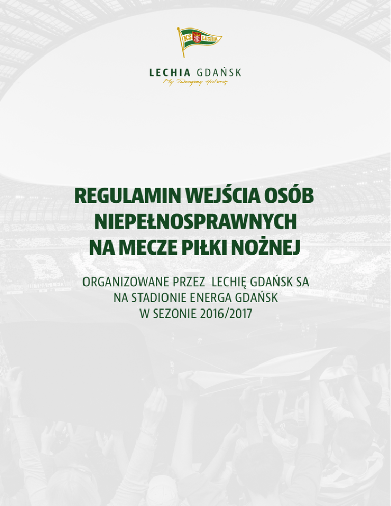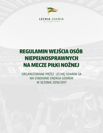REGULAMIN WEJŚCIA OSÓB NIEPEŁNOSPRAWNYCH NA MECZE PIŁKI NOŻNEJ ORGANIZOWANE PRZEZ LECHIĘ GDAŃSK SA NA STADIONIE ENERGA GDAŃSK W SEZONIE 2016/2017 I. DEFINICJE 1. Osoba niepełnosprawna - osoba posiadająca orzeczenie o znacznym stopniu niepełnosprawności (I stopień niepełnosprawności) oraz schorzeń dotyczących narządu ruchu (osoby poruszające się na wózku inwalidzkim) oraz jej opiekun. 2. Lechia Gdańsk - Lechia Gdańsk Spółka Akcyjna z siedzibą w Gdańsku przy ul. Pokoleń Lechii Gdańsk 1, kod poczt. 80-560 Gdańsk, wpisana do rejestru przedsiębiorców Krajowego Rejestru Sądowego przez Sąd Rejonowy Gdańsk-Północ w Gdańsku, VII Wydział Gospodarczy Krajowego Rejestru Sądowego, pod numerem KRS 0000325053, NIP 9571015123, z kapitałem zakładowym w wysokości 1 500 000 złotych wpłaconym w całości. 3. Mecz - zawody piłki nożnej w ramach rozgrywek LOTTO Ekstraklasy, Pucharu Polski, a także mecze towarzyskie, organizowane przez Lechię Gdańsk SA na Stadionie Energa Gdańsk w sezonie 2016/2017. 4. Regularny Sektor - sektor, znajdujący się na trybunach Stadionu Energa Gdańsk, za wyjątkiem sektorów „N” i „S” 5. Platforma - sektor „N” i „S”, znajdujące się na trybunie żółtej Stadionu Energa Gdańsk II. POSTANOWIENIA OGÓLNE 1. Regulamin określa warunki, zakres i zasady uczestnictwa osób niepełnosprawnych na meczach Lechii Gdańsk. 2. Informacje na temat Regulaminu oraz jego treść jest dostępna dla wszystkich zainteresowanych na stronie internetowej www.lechia.pl 3. Niniejszy regulamin obowiązuje od 10 lipca 2015 roku do 30 czerwca 2017 roku. III. TREŚĆ REGULAMINU 1. Osoby niepełnosprawne mogą uczestniczyć w meczach Lechii Gdańsk na Stadionie Energa Gdańsk nieodpłatnie na wyznaczonych miejscach w sektorach „N” i „S” (wejście tunelem nr 2). Liczba miejsc przeznaczonych dla osób niepełnosprawnych jest ograniczona i wynosi: 60 miejsc na platformie (1 miejsce - osoba na wózku inwalidzkim + opiekun); 40 miejsc na krzesełkach oznaczonych specjalnym symbolem 2. Nie ma możliwości zapewnienia miejsc dla osób poruszających się na wózkach inwalidzkich w regularnych sektorach stadionu. 3. Podstawą udziału w meczach na warunkach preferencyjnych jest: złożenie aktualnego podania z prośbą o umożliwienie uczestnictwa w meczach Lechii Gdańsk rozgrywanych na Stadionie Energa Gdańsk wraz z dostarczeniem kserokopii orzeczenia o stopniu niepełnosprawności. 4. Wnioski, które nie będą zawierały kompletu wymaganych dokumentów nie będą rozpatrywane. 5. Na podstawie osobiście złożonych dokumentów osobom niepełnosprawnym zostają przyznane wejściówki w ramach kolejności zgłoszeń, przy zachowaniu preferencji dla osób niepełnosprawnych uczestniczących w meczach Lechii Gdańsk w poprzednim sezonie piłkarskim 2015/2016. 6. Złożenie podania o którym mowa w punkcie 3. Treści Regulaminu nie jest równoznaczne z przyznaniem wejściówki, umożliwiającej wnioskodawcy uczestnictwo w meczu Lechii Gdańsk, rozgrywanym na Stadionie Energa Gdańsk. 7. Lechia Gdańsk zastrzega, że procedura weryfikacji dokumentów i przyznawania darmowych wejściówek może trwać do trzech dni roboczych. 8. Osoby zakwalifikowane, winny powiadomić Klub nie później niż 72 godziny przed meczem o zamiarze uczestniczenia w najbliższym spotkaniu. Potwierdzenie uczestnictwa w meczu można przesłać za pomocą poczty e-mail na adres: [email protected], bądź zgłosić telefonicznie pod numerem telefonu: 506 510 766. 9. Osoba niepełnosprawna chcąca skorzystać z możliwości bezpłatnego uczestnictwa w meczach organizowanych przez Lechię Gdańsk, w momencie składania podania o darmową wejściówkę zobowiązana jest do posiadania karty kibica Lechii Gdańsk. 10. W przypadku naruszenia postanowień regulaminu, Klub ma prawo odebrać wejściówkę osobie niepełnosprawnej. Służby porządkowe upoważnione są również do odmówienia wpuszczenia na teren stadionu osobom niepełnosprawnym, będącym pod wpływem alkoholu bądź środków odurzających. IV. POSTANOWIENIA KOŃCOWE 1. W kwestiach nieuregulowanych niniejszym Regulaminem stosuje się przepisy Kodeksu cywilnego. 2. Lechia Gdańsk zastrzega sobie prawo do zawieszenia, przerwania, przedłużania lub odwołania Regulaminu bez podania przyczyn. 2. 3. 4. Lechia Gdańsk zastrzega sobie prawo do zmian w regulaminie . Wszystkie roszczenia, reklamacje, uwagi i zastrzeżenia wysłane na adres Lechii Gdańsk wymagają formy pisemnej pod rygorem nieważności. Prawo do wiążącej wykładni i interpretacji Regulaminu przysługuje wyłącznie Lechii Gdańsk.