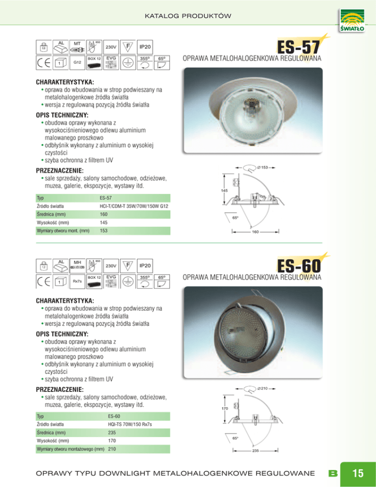 KATALOG PRODUKTÓW ES-57 0,8 OPRAWA METALOHALOGENKOWA REGULOWANA G12 CHARAKTERYSTYKA: •oprawa do wbudowania w strop podwieszany na metalohalogenkowe êródła Êwiatła •wersja z regulowanà pozycjà êródła Êwiatła OPIS TECHNICZNY: •obudowa oprawy wykonana z wysokociÊnieniowego odlewu aluminium malowanego proszkowo •odbłyÊnik wykonany z aluminium o wysokiej czystoÊci •szyba ochronna z filtrem UV PRZEZNACZENIE: •sale sprzeda˝y, salony samochodowe, odzie˝owe, muzea, galerie, ekspozycje, wystawy itd. Typ ES-57 èród∏o Êwiat∏a HCI-T/CDM-T 35W/70W/150W G12 Ârednica (mm) 160 WysokoÊç (mm) 145 Wymiary otworu mont. (mm) 153 ES-60 1,2 OPRAWA METALOHALOGENKOWA REGULOWANA Rx7s CHARAKTERYSTYKA: •oprawa do wbudowania w strop podwieszany na metalohalogenkowe êródła Êwiatła •wersja z regulowanà pozycjà êródła Êwiatła OPIS TECHNICZNY: •obudowa oprawy wykonana z wysokociÊnieniowego odlewu aluminium malowanego proszkowo •odbłyÊnik wykonany z aluminium o wysokiej czystoÊci •szyba ochronna z filtrem UV PRZEZNACZENIE: •sale sprzeda˝y, salony samochodowe, odzie˝owe, muzea, galerie, ekspozycje, wystawy itd. Typ ES-60 èród∏o Êwiat∏a HQI-TS 70W/150 Rx7s Ârednica (mm) 235 WysokoÊç (mm) 170 210 Wymiary otworu monta˝owego (mm) 210 OPRAWY TYPU DOWNLIGHT METALOHALOGENKOWE REGULOWANE B 15