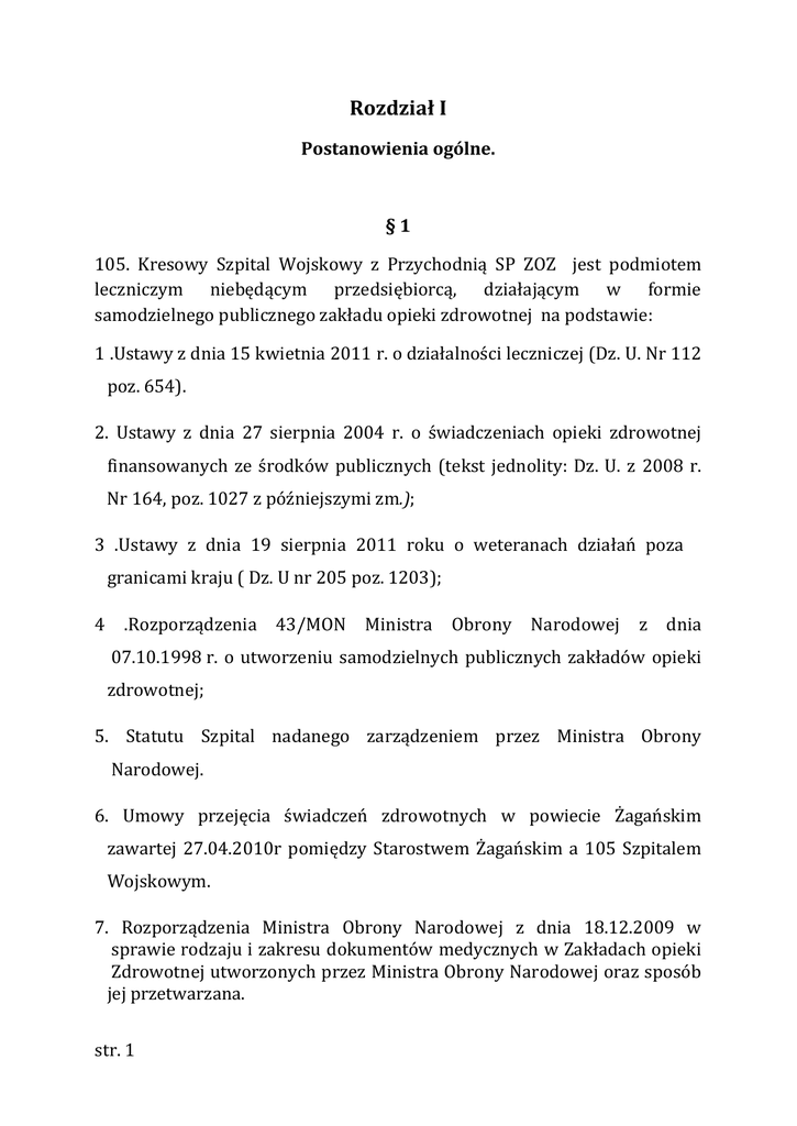 Rozdział I Postanowienia ogólne. §1 105. Kresowy Szpital Wojskowy z Przychodnią SP ZOZ jest podmiotem leczniczym niebędącym przedsiębiorcą, działającym w formie samodzielnego publicznego zakładu opieki zdrowotnej na podstawie: 1 .Ustawy z dnia 15 kwietnia 2011 r. o działalności leczniczej (Dz. U. Nr 112 poz. 654). 2. Ustawy z dnia 27 sierpnia 2004 r. o świadczeniach opieki zdrowotnej finansowanych ze środków publicznych (tekst jednolity: Dz. U. z 2008 r. Nr 164, poz. 1027 z późniejszymi zm.); 3 .Ustawy z dnia 19 sierpnia 2011 roku o weteranach działań poza granicami kraju ( Dz. U nr 205 poz. 1203); 4 .Rozporządzenia 43/MON Ministra Obrony Narodowej z dnia 07.10.1998 r. o utworzeniu samodzielnych publicznych zakładów opieki zdrowotnej; 5. Statutu Szpital nadanego zarządzeniem przez Ministra Obrony Narodowej. 6. Umowy przejęcia świadczeń zdrowotnych w powiecie Żagańskim zawartej 27.04.2010r pomiędzy Starostwem Żagańskim a 105 Szpitalem Wojskowym. 7. Rozporządzenia Ministra Obrony Narodowej z dnia 18.12.2009 w sprawie rodzaju i zakresu dokumentów medycznych w Zakładach opieki Zdrowotnej utworzonych przez Ministra Obrony Narodowej oraz sposób jej przetwarzana. str. 1 8. Postanowienie Sądu Rejonowego o wpisie do rejestru KRS Nr 0000004712 9. Wpisu do rejestru ZOZ nr 000000018552. §2 1. Szpital działa pod firmą -105. Kresowy Szpital Wojskowy z Przychodnią Samodzielny Publiczny Zakład Opieki Zdrowotnej w Żarach, nazwa skrócona – 105. Kresowy Szpital Wojskowy z Przychodnią SP ZOZ . 2. Siedziba Szpitala mieści się w Żarach przy ulicy Domańskiego 2. 3. Przedsiębiorstwa podmiotu leczniczego: a. Szpital Wielospecjalistyczny, 68-200 Żary ul. Domańskiego 2; b. Przychodnia Ambulatoryjnej Opieki Zdrowotnej, 68-200 Żary ul. Domańskiego 2. §3 Regulamin organizacyjny Szpitala określa w szczególności: 1. Rodzaj działalności leczniczej oraz zakres udzielanych świadczeń zdrowotnych; 2. Przebieg procesu udzielania świadczeń zdrowotnych, z zapewnieniem właściwej dostępności i jakości tych świadczeń w działach lub komórkach organizacyjnych Szpitala; 3. Strukturę organizacyjną Szpitala; 4. Organizację i zadania poszczególnych działów jednostki; 5. Sposób kierowania Szpitalem; 6. Prowadzenie dokumentacji medycznej oraz wysokość opłat za jej udostępnienie; str. 2 7. Organizacja udzielania świadczeń zdrowotnych odpłatnych oraz wysokość opłat; 8. Warunki współdziałania z innymi podmiotami leczniczymi. §4 Nadzór nad działalnością 105. Kresowego Szpitala Wojskowego z Przychodnią Samodzielnego Publicznego Zakładu Opieki Zdrowotnej w Żarach sprawuje Dyrektor Departamentu Wojskowej Służby Zdrowia –Szef Służby Zdrowia Wojska Polskiego. §5 1. Misją Szpitala jest zapewnienie najwyższej jakości usług leczniczych i pielęgnacyjnych Pacjentom 105. Kresowego Szpitala Wojskowego z Przychodnią SP ZOZ w Żarach. 2. Celem Zakładu jest podejmowanie działań na rzecz ochrony i poprawy stanu zdrowia ludności poprzez organizowanie i prowadzenie działalności leczniczej. 3. Do zadań Zakładu należy w szczególności udzielanie świadczeń zdrowotnych, ze szczególnym uwzględnieniem świadczeń wysokospecjalistycznych w ramach specjalności reprezentowanych przez poszczególne komórki organizacyjne oraz organizowanie i prowadzenie działalności w zakresie kształcenia, szkolenia i doskonalenia zawodowego wyższych i średnich kadr medycznych, we wszystkich formach określonych odrębnymi przepisami. 4. Szpital realizuje zadania zlecone przez Ministra Obrony Narodowej, w szczególności na terenie obwodu profilaktyczno- leczniczego wyznaczonego odrębnymi przepisami, w zakresie i na zasadach określonych zawartymi umowami. str. 3 Rozdział II Rodzaj działalności leczniczej oraz zakres udzielanych świadczeń. §6 Szpital zapewnia świadczenia zdrowotne w zakresie: 1. specjalistycznej stacjonarnej opieki zdrowotnej; 2. opieki ambulatoryjnej; 3. rehabilitacji; 4. diagnostyki; 5. pomocy doraźnej w izbach przyjęć oraz szpitalnym oddziale ratunkowym; 6. ratownictwa medycznego. 7. orzecznictwa lekarskiego. §7 Rodzaj udzielanych przez Zakład świadczeń związany jest z : 1. badaniem i poradą lekarska; 2. leczeniem; 3. badaniem i terapią psychiatryczną i psychologiczna; 4. rehabilitacją leczniczą; 5. opieką nad kobietą ciężarną i jej płodem; 6. opieką nad zdrowym dzieckiem; 7. badaniem diagnostycznym w tym analityką medyczną; str. 4 8. pielęgnacją chorych; 9. pielęgnacją i opieką nad niepełnosprawnymi; 10. opieką paliatywno- hospicyjną; 11. orzekaniem i opiniowaniem o stanie zdrowia; 12. wykonywaniem czynności stomatologii zachowawczej; z zakresu protetyki, ortodoncji i 13. świadczeniem pomocy medycznej osobom poszkodowanym w wypadkach komunikacyjnych i innych. 14. zaopatrywaniem w środki i materiały medyczne; 15. profilaktyką i promocją zdrowia; 16. organizowaniem i prowadzeniem działalności w zakresie kształcenia, szkolenia i doskonalenia zawodowego kadr medycznych; 17. prowadzeniem badań klinicznych , badań naukowych w zakresie terapii, nowych technik leczenia i innej działalności naukowej związanej z leczeniem pacjentów; 18. uczestniczeniem w programach klinicznych sponsorowanych przez obce podmioty gospodarcze. §8 Rodzaj i zakres udzielanych świadczeń zdrowotnych może zostać poszerzony w zależności od potrzeb wynikających z przyjmowanych zleceń i zawieranych umów. str. 5 Rozdział III Sposób kierowania Zakładem. §9 Organami Zakładu są: 1. Dyrektor, 2. Rada Społeczna -zakres działania i kompetencje oraz skład są opisane w Statucie Zakładu oraz w Regulaminie Rady Społecznej. § 10 1. Dyrektor kieruje działalnością Szpitala i reprezentuje go na zewnątrz. 2. Dyrektor podejmuje samodzielnie decyzje dotyczące funkcjonowania Szpitala i ponosi za nie odpowiedzialność. 3. Przy podejmowaniu decyzji Dyrektor korzysta z opinii właściwych organów i organizacj