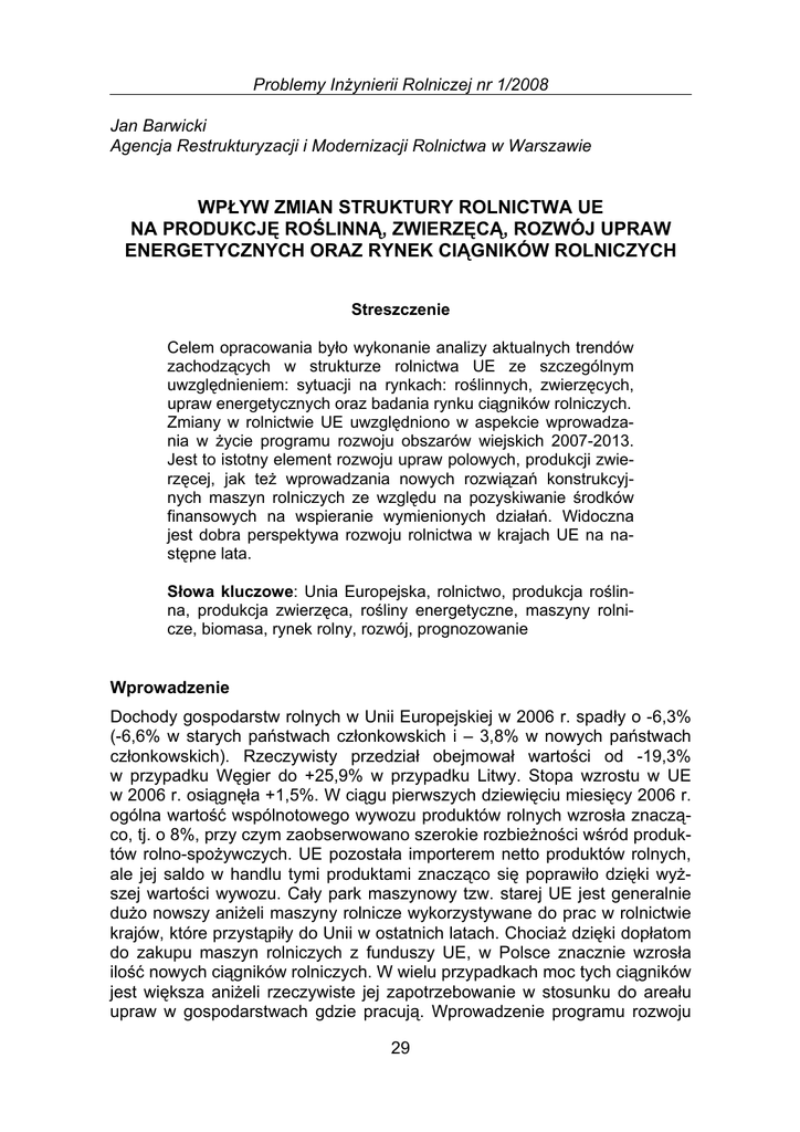 Problemy Inżynierii Rolniczej nr 1/2008 Jan Barwicki Agencja Restrukturyzacji i Modernizacji Rolnictwa w Warszawie WPŁYW ZMIAN STRUKTURY ROLNICTWA UE NA PRODUKCJĘ ROŚLINNĄ, ZWIERZĘCĄ, ROZWÓJ UPRAW ENERGETYCZNYCH ORAZ RYNEK CIĄGNIKÓW ROLNICZYCH Streszczenie Celem opracowania było wykonanie analizy aktualnych trendów zachodzących w strukturze rolnictwa UE ze szczególnym uwzględnieniem: sytuacji na rynkach: roślinnych, zwierzęcych, upraw energetycznych oraz badania rynku ciągników rolniczych. Zmiany w rolnictwie UE uwzględniono w aspekcie wprowadzania w życie programu rozwoju obszarów wiejskich 2007-2013. Jest to istotny element rozwoju upraw polowych, produkcji zwierzęcej, jak też wprowadzania nowych rozwiązań konstrukcyjnych maszyn rolniczych ze względu na pozyskiwanie środków finansowych na wspieranie wymienionych działań. Widoczna jest dobra perspektywa rozwoju rolnictwa w krajach UE na następne lata. Słowa kluczowe: Unia Europejska, rolnictwo, produkcja roślinna, produkcja zwierzęca, rośliny energetyczne, maszyny rolnicze, biomasa, rynek rolny, rozwój, prognozowanie Wprowadzenie Dochody gospodarstw rolnych w Unii Europejskiej w 2006 r. spadły o -6,3% (-6,6% w starych państwach członkowskich i – 3,8% w nowych państwach członkowskich). Rzeczywisty przedział obejmował wartości od -19,3% w przypadku Węgier do +25,9% w przypadku Litwy. Stopa wzrostu w UE w 2006 r. osiągnęła +1,5%. W ciągu pierwszych dziewięciu miesięcy 2006 r. ogólna wartość wspólnotowego wywozu produktów rolnych wzrosła znacząco, tj. o 8%, przy czym zaobserwowano szerokie rozbieżności wśród produktów rolno-spożywczych. UE pozostała importerem netto produktów rolnych, ale jej saldo w handlu tymi produktami znacząco się poprawiło dzięki wyższej wartości wywozu. Cały park maszynowy tzw. starej UE jest generalnie dużo nowszy aniżeli maszyny rolnicze wykorzystywane do prac w rolnictwie krajów, które przystąpiły do Unii w ostatnich latach. Chociaż dzięki dopłatom do zakupu maszyn rolniczych z funduszy UE, w Polsce znacznie wzrosła ilość nowych ciągników rolniczych. W wielu przypadkach moc tych ciągników jest większa aniżeli rzeczywiste jej zapotrzebowanie w stosunku do areału upraw w gospodarstwach gdzie pracują. Wprowadzenie programu rozwoju 29 Jan Barwicki obszarów wiejskich w latach 2007-2013 rokuje dobre perspektywy rozwoju rolnictwa w krajach UE. Celem opracowania było przeprowadzenie analizy procesu rozwoju struktury rolnictwa UE, ze szczególnym uwzględnieniem jego wpływu na produkcję mleka, bioenergetykę oraz rynek ciągników rolniczych w Polsce. Metodyka oraz zakres opracowania Opracowanie wykonano na podstawie analizy materiałów opublikowanych przez KE w Brukseli. Prognozowanie pogłowia krów wykonano na podstawie danych bieżących publikowanych przez KE w Brukseli oraz wykorzystując program do przeprowadzania analiz statystycznych STATISTICA 6.0. Ocenę sprzedaży ciągników rolniczych w Polsce wykonano na podstawie badań ankietowych wśród przedstawicieli poszczególnych marek obecnych na rynku krajowym. Analiza rynku roślinnego W 2005 r. Rada Europejska postanowiła ustalić wydatki na rolnictwo na lata 2007-2013 na kwotę 293,1 mld euro tytułem dopłat bezpośrednich i środków rynkowych oraz kwotę 69,75 mld euro na rzecz rozwoju obszarów wiejskich. Wraz z rozszerzeniem Unii Europejskiej dnia 1 maja 2004 r., dla nowych państw członkowskich wprowadzono specjalny system rozwoju obszarów wiejskich. W 2005 r. wspólnotowe wydatki na rozwój obszarów wiejskich, wyniosły 8 501,8 mln euro. Natomiast rok 2005 zaznaczył się również ważną zmianą w polityce rozwoju obszarów wiejskich przewidzianą na następny okres programowania 2007-2013. Rada UE przyjęła nowe rozporządzenie dotyczące finansowania rolnictwa, na mocy którego stworzono nowy Europejski Fundusz Rozwoju Obszarów Wiejskich. Instrument ten wprowadza podstawowe zasady i mechanizmy dotyczące programowania i zarządzania finansami w zakresie polityki rozwoju obszarów wiejskich w okresie 2007-2013. W drugiej połowie 2005 r. wobec potrzeby ponowienia inicjatywy politycznej w sprawie wspólnotowej polityki energetycznej mając na uwadze rosnące ceny ropy, znaczne uzależnienie energetyczne naszej gospodarki oraz międzynarodowe zobowiązania związane ze zmianami klimatycznymi, możliwość zwiększenia produkcji biopaliw stała się złożoną, przekrojową i dynamiczną kwestią. W dniu 7 grudnia 2005 r. Komisja przyjęła wspólnotowy Plan działania w sprawie biomasy, którego głównym celem jest ponad dwukrotne zwiększenie wykorzystania biomasy w UE do 2010 r. oraz zwiększenie możliwości dla jeszcze większych wzrostów do 2020 r. Ta inicjatywa UE była podstawą do komunikatu w sprawie wspólnotowej strategii dotyczącej biopaliw, który został przyjęty na początku 2006 r. Pociągnęło to za sobą rozwój konstrukcji 30 Wpływ zmian struktury... maszyn rolniczych do mechanizacji procesu prowadzenia upraw oraz zbioru roślin energetycznych. W grudniu 2005 r. Komisja przyjęła wniosek dotyczący nowego rozporządzenia Rady w sprawie produkcji ekologicznej. Wniosek ten jest następstwem komunikatu w sprawie Wspólnotowego planu działania na rzecz żywności ekologicznej i rolnictwa ekologicznego (EAP). Zamiast stosowania herbicydów, pojawiły się nowe technologie mechanizacyjne do niszczenia chwastów w uprawach polowych. W 2005 r. całkowite zbiory zbóż w UE-25 wyniosły 284 mln ton, co stanowi wzrost o 54 mln ton lub o 23% w porównaniu z plonami z okresu 2003/2004. Areał w UE zwiększył się o 1 mln hektarów, podczas gdy wydajność plonów zbóż wzrosła o 1 t/ha lub o 22%. W przypadku wszystkich uprawianych w UE zbóż z wyjątkiem owsa produkcja była wyższa niż w 2003/2004, przy wzroście sięgającym od 11% dla jęczmienia do 42% dla żyta. Przeciętna wydajność plonów zbóż osiągnęła rekordową