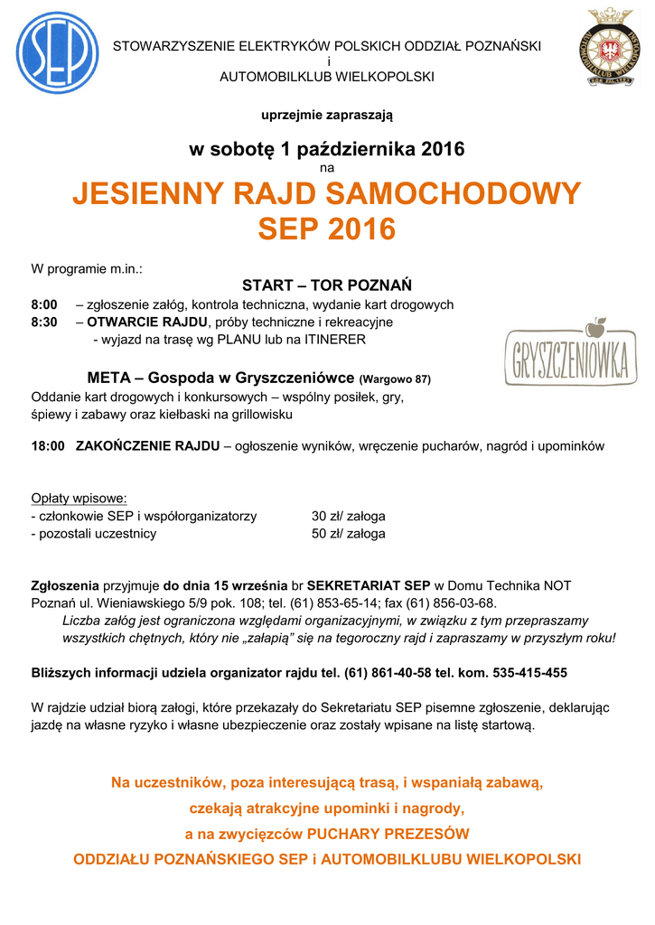 STOWARZYSZENIE ELEKTRYKÓW POLSKICH ODDZIAŁ POZNAŃSKI i AUTOMOBILKLUB WIELKOPOLSKI uprzejmie zapraszają w sobotę 1 października 2016 na JESIENNY RAJD SAMOCHODOWY SEP 2016 W programie m.in.: START – TOR POZNAŃ 8:00 8:30 – zgłoszenie załóg, kontrola techniczna, wydanie kart drogowych – OTWARCIE RAJDU, próby techniczne i rekreacyjne - wyjazd na trasę wg PLANU lub na ITINERER META – Gospoda w Gryszczeniówce (Wargowo 87) Oddanie kart drogowych i konkursowych – wspólny posiłek, gry, śpiewy i zabawy oraz kiełbaski na grillowisku 18:00 ZAKOŃCZENIE RAJDU – ogłoszenie wyników, wręczenie pucharów, nagród i upominków Opłaty wpisowe: - członkowie SEP i współorganizatorzy - pozostali uczestnicy 30 zł/ załoga 50 zł/ załoga Zgłoszenia przyjmuje do dnia 15 września br SEKRETARIAT SEP w Domu Technika NOT Poznań ul. Wieniawskiego 5/9 pok. 108; tel. (61) 853-65-14; fax (61) 856-03-68. Liczba załóg jest ograniczona względami organizacyjnymi, w związku z tym przepraszamy wszystkich chętnych, który nie „załapią” się na tegoroczny rajd i zapraszamy w przyszłym roku! Bliższych informacji udziela organizator rajdu tel. (61) 861-40-58 tel. kom. 535-415-455 W rajdzie udział biorą załogi, które przekazały do Sekretariatu SEP pisemne zgłoszenie, deklarując jazdę na własne ryzyko i własne ubezpieczenie oraz zostały wpisane na listę startową. Na uczestników, poza interesującą trasą, i wspaniałą zabawą, czekają atrakcyjne upominki i nagrody, a na zwycięzców PUCHARY PREZESÓW ODDZIAŁU POZNAŃSKIEGO SEP i AUTOMOBILKLUBU WIELKOPOLSKI