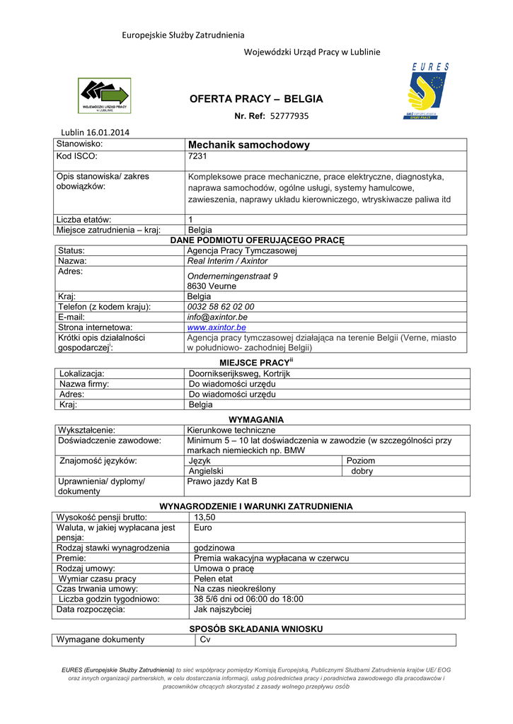 Europejskie Służby Zatrudnienia Wojewódzki Urząd Pracy w Lublinie OFERTA PRACY – BELGIA Nr. Ref: 52777935 Lublin 16.01.2014 Stanowisko: Kod ISCO: Mechanik samochodowy Opis stanowiska/ zakres obowiązków: Kompleksowe prace mechaniczne, prace elektryczne, diagnostyka, naprawa samochodów, ogólne usługi, systemy hamulcowe, zawieszenia, naprawy układu kierowniczego, wtryskiwacze paliwa itd Liczba etatów: Miejsce zatrudnienia – kraj: Status: Nazwa: Adres: 7231 1 Belgia DANE PODMIOTU OFERUJĄCEGO PRACĘ Agencja Pracy Tymczasowej Real Interim / Axintor Kraj: Telefon (z kodem kraju): E-mail: Strona internetowa: Krótki opis działalności i gospodarczej : Ondernemingenstraat 9 8630 Veurne Belgia 0032 58 62 02 00 [email protected] www.axintor.be Agencja pracy tymczasowej działająca na terenie Belgii (Verne, miasto w południowo- zachodniej Belgii) Lokalizacja: Nazwa firmy: Adres: Kraj: MIEJSCE PRACY Doornikserijksweg, Kortrijk Do wiadomości urzędu Do wiadomości urzędu Belgia ii Wykształcenie: Doświadczenie zawodowe: Znajomość języków: Uprawnienia/ dyplomy/ dokumenty WYMAGANIA Kierunkowe techniczne Minimum 5 – 10 lat doświadczenia w zawodzie (w szczególności przy markach niemieckich np. BMW Język Poziom Angielski dobry Prawo jazdy Kat B WYNAGRODZENIE I WARUNKI ZATRUDNIENIA Wysokość pensji brutto: 13,50 Waluta, w jakiej wypłacana jest Euro pensja: Rodzaj stawki wynagrodzenia godzinowa Premie: Premia wakacyjna wypłacana w czerwcu Rodzaj umowy: Umowa o pracę Wymiar czasu pracy Pełen etat Czas trwania umowy: Na czas nieokreślony Liczba godzin tygodniowo: 38 5/6 dni od 06:00 do 18:00 Data rozpoczęcia: Jak najszybciej Wymagane dokumenty SPOSÓB SKŁADANIA WNIOSKU Cv EURES (Europejskie Służby Zatrudnienia) to sieć współpracy pomiędzy Komisją Europejską, Publicznymi Służbami Zatrudnienia krajów UE/ EOG oraz innych organizacji partnerskich, w celu dostarczania informacji, usług pośrednictwa pracy i poradnictwa zawodowego dla pracodawców i pracowników chcących skorzystać z zasady wolnego przepływu osób Język, w którym muszą być sporządzone przedkładane dokumenty: Do kogo należy wysłać dokumenty: Gdzie należy wysłać dokumenty: Dane teleadresowe doradcy EURES lub przedstawiciela pracodawcy: W języku angielskim z dopiskiem CAR MECHANIC AXINTOR Do pracodawcy oraz do wiadomości doradcy Eures w Belgii Do pracodawcy : [email protected] Oraz do wiadomości: [email protected] Annelies Thomas Euresadviser VDAB, Dienst Eures Koning Albert I-laan, 1.2. 8200 Brugge Belgium e-mail: [email protected] tel. + 32 (0) 50 44 04 97 Termin przedkładania podań o pracę / zakończenia ważności oferty: fax +32 (0) 50 44 04 81 http://www.workinflanders.be WAŻNOŚĆ 31.01.2014 Uprzejmie informujemy, że Agencja Pracy Tymczasowej Real Interim / Axintor oświadczyła, że działa zgodnie przepisami prawa obowiązującymi na terenie Belgii. Uprzejmie informujemy, że skontaktujemy się wyłącznie z wybranymi kandydatami. UWAGA: Umowa z zagranicznym pracodawcą zostanie zawarta zgodnie z prawem kraju zatrudnienia. Oznacza to, że wszystkie roszczenia odnośnie do warunków, które obejmuje umowa, można kierować wyłącznie do odpowiedniego sądu w kraju zatrudnienia. Publiczne służby zatrudnienia (EURES) nie mogą pośredniczyć ani reprezentować pracownika w sądzie kraju zatrudnienia w przypadku sporu z pracodawcą. Publiczne służby zatrudnienia (EURES) dokładają wszelkich starań, aby zapewnić rzetelność i wiarygodność ofert pracy zgłoszonych w lokalnym urzędzie pracy. Należy wyjaśnić, że oferta pracy została zgłoszona przez stronę trzecią i EURES nie odpowiada za ewentualne rozbieżności między warunkami pracy określonymi w ofercie pracy i warunkami oferowanymi przez potencjalnego pracodawcę. Publiczne służby zatrudnienia (EURES) informują, że będą zbierać, przetwarzać i przekazywać potencjalnym pracodawcom zgodnie z przepisami dotyczącymi ochrony danych osobowych wszystkie dane osobowe dostarczone przez osoby poszukujące pracy. i Informacje o firmie, takie jak: status prawny, sektor, typ działalności, rodzaj produktów lub świadczonych usług, data rozpoczęcia działalności gospodarczej, liczba pracowników itp. ii Miejsce, w którym będzie wykonywana praca. Należy wypełnić w przypadku gdy: 1) miejsce wykonywania pracy jest inne niż siedziba podmiotu oferującego pracę, 2) pracę oferuje agencja pośrednictwa pracy/ agencja pracy tymczasowej. EURES (Europejskie Służby Zatrudnienia) to sieć współpracy pomiędzy Komisją Europejską, Publicznymi Służbami Zatrudnienia krajów UE/ EOG oraz innych organizacji partnerskich, w celu dostarczania informacji, usług pośrednictwa pracy i poradnictwa zawodowego dla pracodawców i pracowników chcących skorzystać z zasady wolnego przepływu osób
